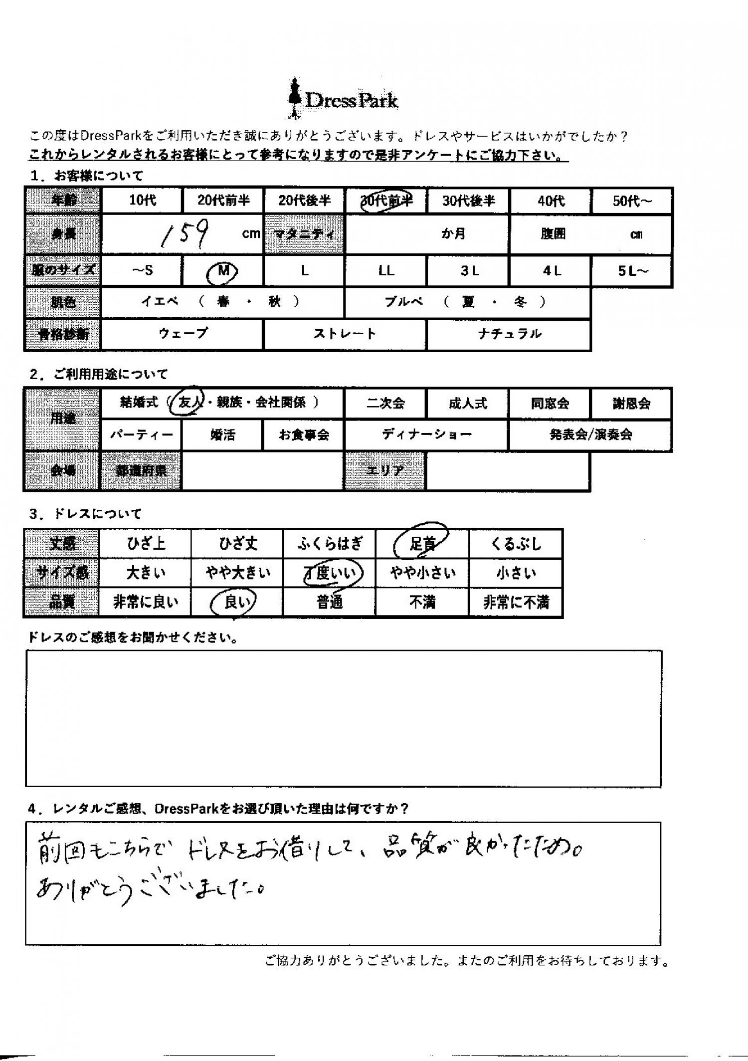 静岡県 N.T様159㎝ Mサイズ #30代#M/L#155~159㎝#結婚式(友人)#静岡県 ◆レンタルしたドレスはこちら ◆レンタルしたサイズは:M ◆レンタルした日付:2025/11/14 ドレスの着用感 ◆点数: (4点) ◆丈感:足首 ◆サイズ感:丁度いい ◆品質:良い レンタルのご感想、DressParkをお選び頂いた理由 前回もこちらでドレスをお借りして、品質が良かったため。ありがとうございました。 CUSTOMER REVIEWS お客様の声 気になるカテゴリー別にご利用の感想をチェック! ◆AGE 年代で見る 10代 20代 30代 40代 50代~ ◆SIZE サイズで見る SS/S M/L 大きいサイズLL~ ◆HIGHT 身長で見る 140~149㎝ 150~154㎝ 155~159㎝ 160~164㎝ 165~169㎝ 170㎝以上 ◆マタニティ ~3か月 4~6か月 7~8か月 9~10か月 ◆肌色 イエベ ブルべ ◆骨格診断 ウェーブ ストレート ナチュラル ◆利用シーン 結婚式(友人) 結婚式(親族) 結婚式(会社関係) 二次会 成人式 謝恩会 パーティー その他 CUSTOMER REVIEWS都道府県別お客様の声 都道府県別にのお客様の声をチェック! 北海道 青森県 岩手県 宮城県 秋田県 山形県 福島県 茨城県 栃木県 群馬県 埼玉県 千葉県 東京都 神奈川県 新潟県 富山県 石川県 福井県 山梨県 長野県 岐阜県 静岡県 愛知県 三重県 滋賀県 京都府 大阪府 兵庫県 奈良県 和歌山県 鳥取県 島根県 岡山県 広島県 山口県 徳島県 香川県 愛媛県 高知県 福岡県 佐賀県 長崎県 熊本県 大分県 宮崎県 鹿児島県 沖縄県 CUSTOMER REVIEWSエリア別お客様の声 都道府県別にのお客様の声をチェック! 札幌 仙台 名古屋 軽井沢 金沢 神戸・芦屋 博多 那覇 梅田・新大阪 難波・心斎橋 鎌倉・湘南 横浜・みなとみらい 舞浜・浦安・幕張 大宮・浦和 青山・表参道 六本木・麻布 渋谷・恵比寿 新宿 池袋 銀座・丸の内 お台場・汐留 鹿児島市 郡山市 福島市 東予 甲府・石和 LINEでお問い合わせ このサイトではJavaScriptを使用しています