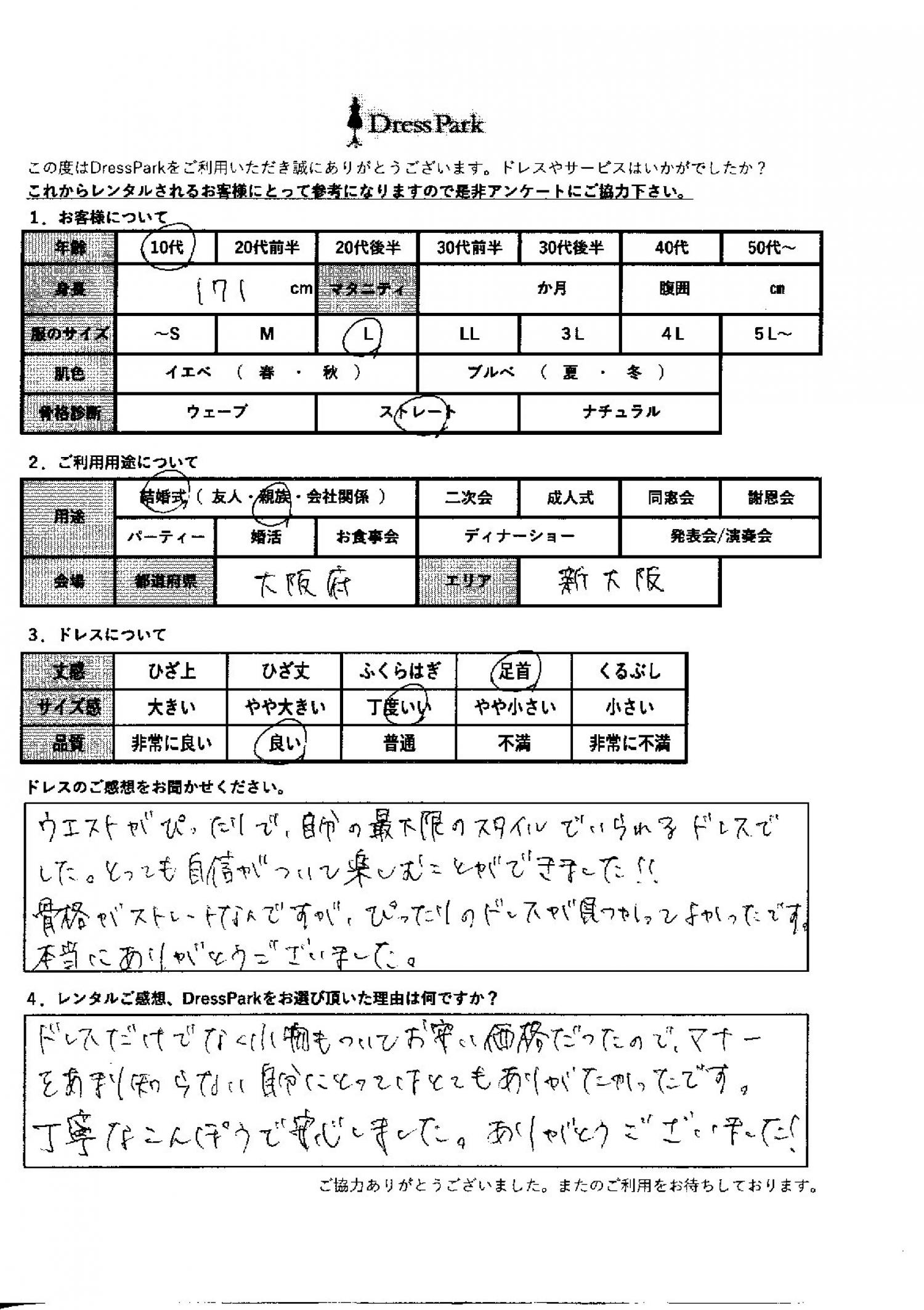 大阪府 N.Y様171㎝ Lサイズ梅田・新大阪 #10代#M/L#170㎝以上#結婚式(親族)#大阪府#梅田・新大阪 ◆レンタルしたドレスはこちら ◆レンタルしたサイズは:L ◆レンタルした日付:2025/11/15 ドレスの着用感 ◆点数: (4点) ◆丈感:足首 ◆サイズ感:丁度いい ◆品質:良い ◆骨格診断:ストレート ドレスの感想 ウェストがぴったりで、自分の最大限のスタイルでいられるドレスでした。とっても自信がついて楽しむことができました!骨格がストレートなのですが、ぴったりのドレスが見つかってよかったです。本当にありがとうございました。 レンタルのご感想、DressParkをお選び頂いた理由 ドレスだけでなく、小物もついてお安い価格だったので、マナーをあまり知らない自分にとってはとてもありがたかったです。丁寧な梱包で安心しました。ありがとうございました! CUSTOMER REVIEWS お客様の声 気になるカテゴリー別にご利用の感想をチェック! ◆AGE 年代で見る 10代 20代 30代 40代 50代~ ◆SIZE サイズで見る SS/S M/L 大きいサイズLL~ ◆HIGHT 身長で見る 140~149㎝ 150~154㎝ 155~159㎝ 160~164㎝ 165~169㎝ 170㎝以上 ◆マタニティ ~3か月 4~6か月 7~8か月 9~10か月 ◆肌色 イエベ ブルべ ◆骨格診断 ウェーブ ストレート ナチュラル ◆利用シーン 結婚式(友人) 結婚式(親族) 結婚式(会社関係) 二次会 成人式 謝恩会 パーティー その他 CUSTOMER REVIEWS都道府県別お客様の声 都道府県別にのお客様の声をチェック! 北海道 青森県 岩手県 宮城県 秋田県 山形県 福島県 茨城県 栃木県 群馬県 埼玉県 千葉県 東京都 神奈川県 新潟県 富山県 石川県 福井県 山梨県 長野県 岐阜県 静岡県 愛知県 三重県 滋賀県 京都府 大阪府 兵庫県 奈良県 和歌山県 鳥取県 島根県 岡山県 広島県 山口県 徳島県 香川県 愛媛県 高知県 福岡県 佐賀県 長崎県 熊本県 大分県 宮崎県 鹿児島県 沖縄県 CUSTOMER REVIEWSエリア別お客様の声 都道府県別にのお客様の声をチェック! 札幌 仙台 名古屋 軽井沢 金沢 神戸・芦屋 博多 那覇 梅田・新大阪 難波・心斎橋 鎌倉・湘南 横浜・みなとみらい 舞浜・浦安・幕張 大宮・浦和 青山・表参道 六本木・麻布 渋谷・恵比寿 新宿 池袋 銀座・丸の内 お台場・汐留 鹿児島市 郡山市 福島市 東予 甲府・石和 LINEでお問い合わせ このサイトではJavaScriptを使用しています