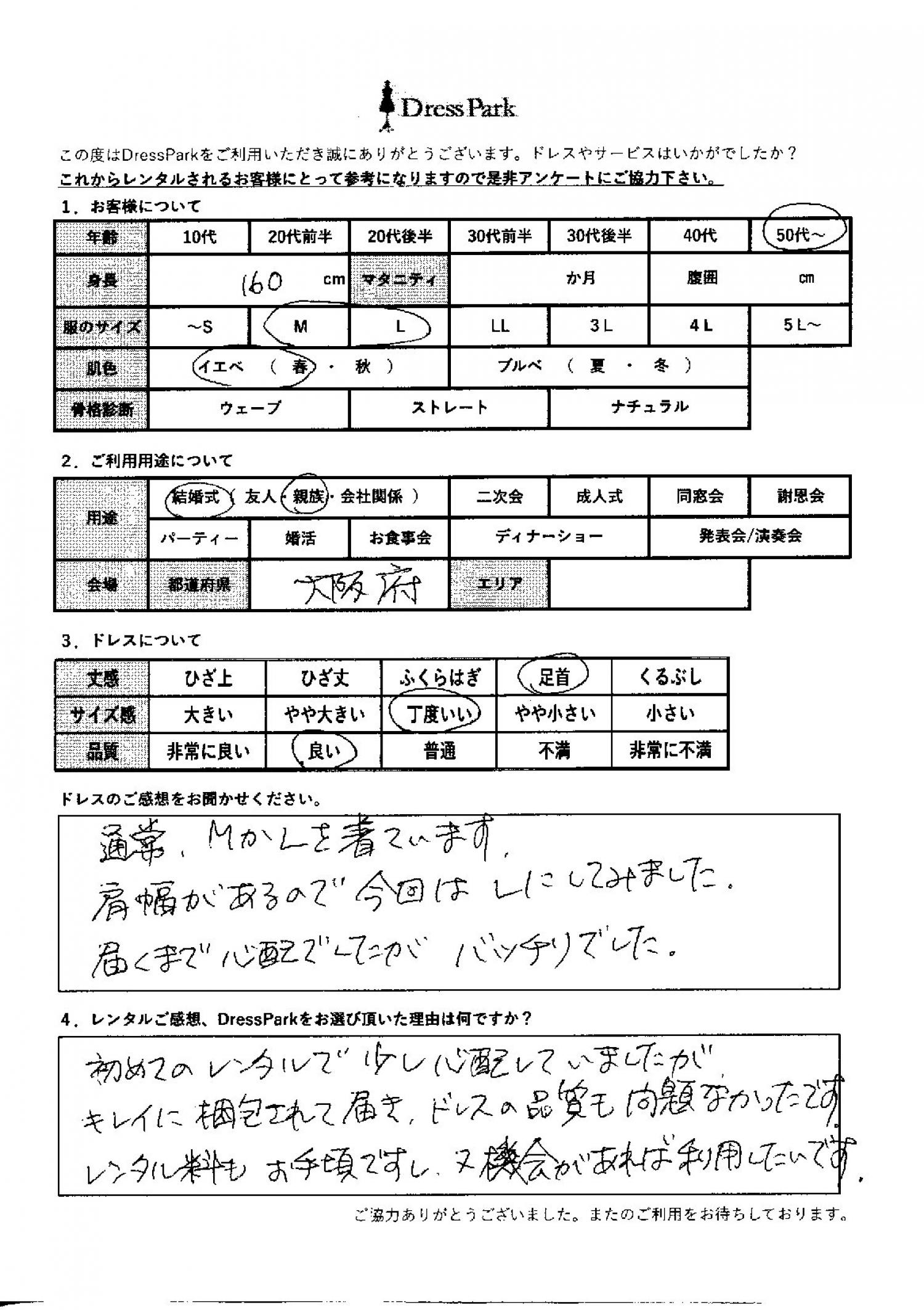 大阪府 I.I様160㎝ Mサイズ #50代~#M/L#160~164㎝#結婚式(親族)#大阪府 ◆レンタルしたドレスはこちら ◆レンタルしたサイズは:L ◆レンタルした日付:2025/11/15 ドレスの着用感 ◆点数: (4点) ◆丈感:足首 ◆サイズ感:丁度いい ◆品質:良い ◆肌色:イエベ ドレスの感想 通常MかLを着ています。肩幅があるので、今回はLサイズにしてみました。届くまで心配でしたがバッチリでした。 レンタルのご感想、DressParkをお選び頂いた理由 はじめてのレンタルで少し心配していましたが、きれいに梱包されて届き、ドレスの品質も問題なかったです。レンタル料もお手頃ですし、また機会があれば利用したいです。 CUSTOMER REVIEWS お客様の声 気になるカテゴリー別にご利用の感想をチェック! ◆AGE 年代で見る 10代 20代 30代 40代 50代~ ◆SIZE サイズで見る SS/S M/L 大きいサイズLL~ ◆HIGHT 身長で見る 140~149㎝ 150~154㎝ 155~159㎝ 160~164㎝ 165~169㎝ 170㎝以上 ◆マタニティ ~3か月 4~6か月 7~8か月 9~10か月 ◆肌色 イエベ ブルべ ◆骨格診断 ウェーブ ストレート ナチュラル ◆利用シーン 結婚式(友人) 結婚式(親族) 結婚式(会社関係) 二次会 成人式 謝恩会 パーティー その他 CUSTOMER REVIEWS都道府県別お客様の声 都道府県別にのお客様の声をチェック! 北海道 青森県 岩手県 宮城県 秋田県 山形県 福島県 茨城県 栃木県 群馬県 埼玉県 千葉県 東京都 神奈川県 新潟県 富山県 石川県 福井県 山梨県 長野県 岐阜県 静岡県 愛知県 三重県 滋賀県 京都府 大阪府 兵庫県 奈良県 和歌山県 鳥取県 島根県 岡山県 広島県 山口県 徳島県 香川県 愛媛県 高知県 福岡県 佐賀県 長崎県 熊本県 大分県 宮崎県 鹿児島県 沖縄県 CUSTOMER REVIEWSエリア別お客様の声 都道府県別にのお客様の声をチェック! 札幌 仙台 名古屋 軽井沢 金沢 神戸・芦屋 博多 那覇 梅田・新大阪 難波・心斎橋 鎌倉・湘南 横浜・みなとみらい 舞浜・浦安・幕張 大宮・浦和 青山・表参道 六本木・麻布 渋谷・恵比寿 新宿 池袋 銀座・丸の内 お台場・汐留 鹿児島市 郡山市 福島市 東予 甲府・石和 LINEでお問い合わせ このサイトではJavaScriptを使用しています