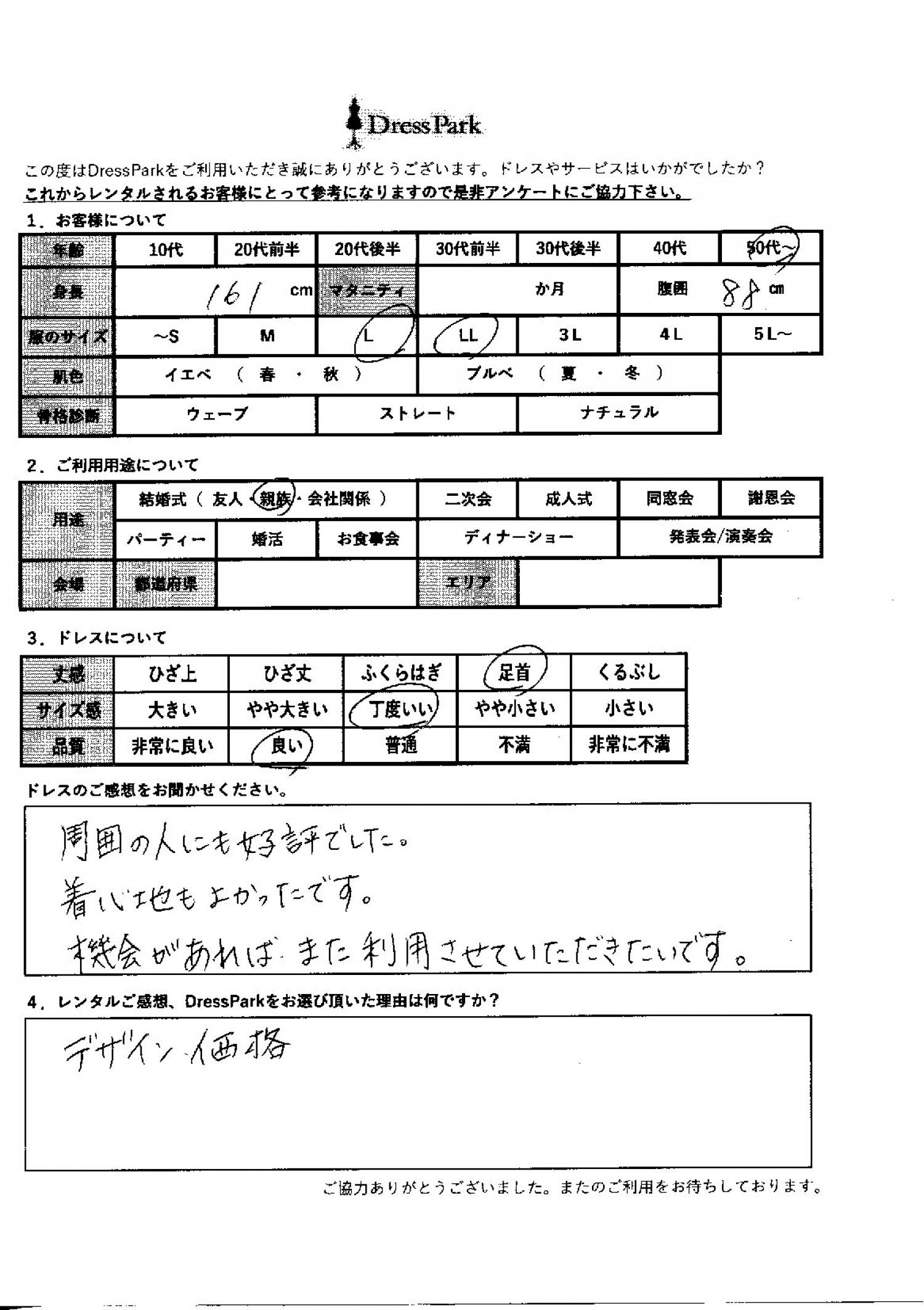 岡山県 E.Y様161㎝ LLサイズ #50代~#大きいサイズLL~#160~164㎝#結婚式(親族)#岡山県 ◆レンタルしたドレスはこちら ◆レンタルしたサイズは:3L ◆レンタルした日付:2025/11/15 ドレスの着用感 ◆点数: (4点) ◆丈感:足首 ◆サイズ感:丁度いい ◆品質:良い ドレスの感想 周囲の人にも好評でした。着心地も良かったです。機会があればまた利用させていただきたいです。 レンタルのご感想、DressParkをお選び頂いた理由 デザイン価格 CUSTOMER REVIEWS お客様の声 気になるカテゴリー別にご利用の感想をチェック! ◆AGE 年代で見る 10代 20代 30代 40代 50代~ ◆SIZE サイズで見る SS/S M/L 大きいサイズLL~ ◆HIGHT 身長で見る 140~149㎝ 150~154㎝ 155~159㎝ 160~164㎝ 165~169㎝ 170㎝以上 ◆マタニティ ~3か月 4~6か月 7~8か月 9~10か月 ◆肌色 イエベ ブルべ ◆骨格診断 ウェーブ ストレート ナチュラル ◆利用シーン 結婚式(友人) 結婚式(親族) 結婚式(会社関係) 二次会 成人式 謝恩会 パーティー その他 CUSTOMER REVIEWS都道府県別お客様の声 都道府県別にのお客様の声をチェック! 北海道 青森県 岩手県 宮城県 秋田県 山形県 福島県 茨城県 栃木県 群馬県 埼玉県 千葉県 東京都 神奈川県 新潟県 富山県 石川県 福井県 山梨県 長野県 岐阜県 静岡県 愛知県 三重県 滋賀県 京都府 大阪府 兵庫県 奈良県 和歌山県 鳥取県 島根県 岡山県 広島県 山口県 徳島県 香川県 愛媛県 高知県 福岡県 佐賀県 長崎県 熊本県 大分県 宮崎県 鹿児島県 沖縄県 CUSTOMER REVIEWSエリア別お客様の声 都道府県別にのお客様の声をチェック! 札幌 仙台 名古屋 軽井沢 金沢 神戸・芦屋 博多 那覇 梅田・新大阪 難波・心斎橋 鎌倉・湘南 横浜・みなとみらい 舞浜・浦安・幕張 大宮・浦和 青山・表参道 六本木・麻布 渋谷・恵比寿 新宿 池袋 銀座・丸の内 お台場・汐留 鹿児島市 郡山市 福島市 東予 甲府・石和 LINEでお問い合わせ このサイトではJavaScriptを使用しています