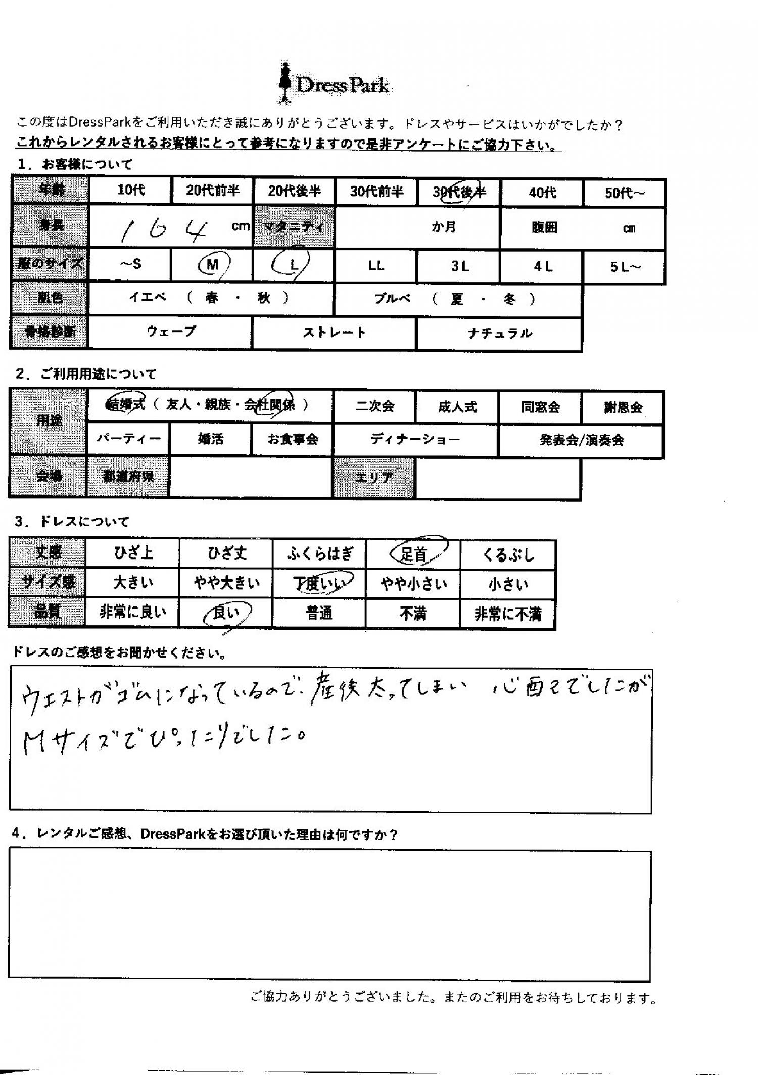 栃木県 K.F様164㎝ Mサイズ #30代#M/L#160~164㎝#結婚式(会社関係)#栃木県 ◆レンタルしたドレスはこちら ◆レンタルしたサイズは:M ◆レンタルした日付:2025/11/15 ドレスの着用感 ◆点数: (4点) ◆丈感:足首 ◆サイズ感:丁度いい ◆品質:良い ドレスの感想 ウェストがゴムになっているので、産後太ってしまい心配でしたが、Mサイズでぴったりでした。 CUSTOMER REVIEWS お客様の声 気になるカテゴリー別にご利用の感想をチェック! ◆AGE 年代で見る 10代 20代 30代 40代 50代~ ◆SIZE サイズで見る SS/S M/L 大きいサイズLL~ ◆HIGHT 身長で見る 140~149㎝ 150~154㎝ 155~159㎝ 160~164㎝ 165~169㎝ 170㎝以上 ◆マタニティ ~3か月 4~6か月 7~8か月 9~10か月 ◆肌色 イエベ ブルべ ◆骨格診断 ウェーブ ストレート ナチュラル ◆利用シーン 結婚式(友人) 結婚式(親族) 結婚式(会社関係) 二次会 成人式 謝恩会 パーティー その他 CUSTOMER REVIEWS都道府県別お客様の声 都道府県別にのお客様の声をチェック! 北海道 青森県 岩手県 宮城県 秋田県 山形県 福島県 茨城県 栃木県 群馬県 埼玉県 千葉県 東京都 神奈川県 新潟県 富山県 石川県 福井県 山梨県 長野県 岐阜県 静岡県 愛知県 三重県 滋賀県 京都府 大阪府 兵庫県 奈良県 和歌山県 鳥取県 島根県 岡山県 広島県 山口県 徳島県 香川県 愛媛県 高知県 福岡県 佐賀県 長崎県 熊本県 大分県 宮崎県 鹿児島県 沖縄県 CUSTOMER REVIEWSエリア別お客様の声 都道府県別にのお客様の声をチェック! 札幌 仙台 名古屋 軽井沢 金沢 神戸・芦屋 博多 那覇 梅田・新大阪 難波・心斎橋 鎌倉・湘南 横浜・みなとみらい 舞浜・浦安・幕張 大宮・浦和 青山・表参道 六本木・麻布 渋谷・恵比寿 新宿 池袋 銀座・丸の内 お台場・汐留 鹿児島市 郡山市 福島市 東予 甲府・石和 LINEでお問い合わせ このサイトではJavaScriptを使用しています