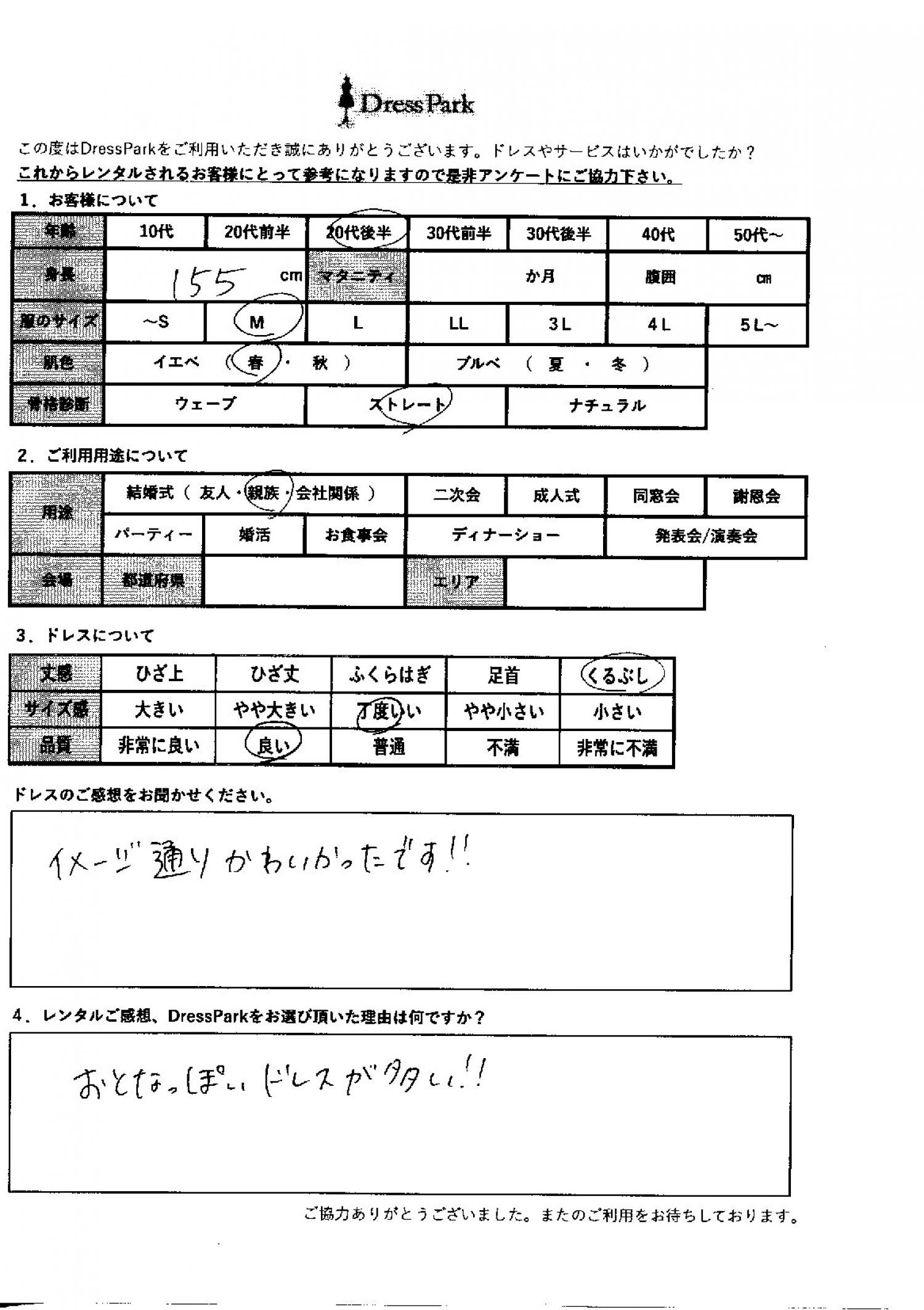 茨城県 N.H様155㎝ Mサイズ #20代#M/L#155~159㎝#結婚式(親族)#茨城県 ◆レンタルしたドレスはこちら ◆レンタルしたサイズは:M ◆レンタルした日付:2025/11/15 ドレスの着用感 ◆点数: (4点) ◆丈感:くるぶし ◆サイズ感:丁度いい ◆品質:良い ◆肌色:イエベ ◆骨格診断:ストレート ドレスの感想 イメージ通り可愛かったです! レンタルのご感想、DressParkをお選び頂いた理由 大人っぽいドレスが多い! CUSTOMER REVIEWS お客様の声 気になるカテゴリー別にご利用の感想をチェック! ◆AGE 年代で見る 10代 20代 30代 40代 50代~ ◆SIZE サイズで見る SS/S M/L 大きいサイズLL~ ◆HIGHT 身長で見る 140~149㎝ 150~154㎝ 155~159㎝ 160~164㎝ 165~169㎝ 170㎝以上 ◆マタニティ ~3か月 4~6か月 7~8か月 9~10か月 ◆肌色 イエベ ブルべ ◆骨格診断 ウェーブ ストレート ナチュラル ◆利用シーン 結婚式(友人) 結婚式(親族) 結婚式(会社関係) 二次会 成人式 謝恩会 パーティー その他 CUSTOMER REVIEWS都道府県別お客様の声 都道府県別にのお客様の声をチェック! 北海道 青森県 岩手県 宮城県 秋田県 山形県 福島県 茨城県 栃木県 群馬県 埼玉県 千葉県 東京都 神奈川県 新潟県 富山県 石川県 福井県 山梨県 長野県 岐阜県 静岡県 愛知県 三重県 滋賀県 京都府 大阪府 兵庫県 奈良県 和歌山県 鳥取県 島根県 岡山県 広島県 山口県 徳島県 香川県 愛媛県 高知県 福岡県 佐賀県 長崎県 熊本県 大分県 宮崎県 鹿児島県 沖縄県 CUSTOMER REVIEWSエリア別お客様の声 都道府県別にのお客様の声をチェック! 札幌 仙台 名古屋 軽井沢 金沢 神戸・芦屋 博多 那覇 梅田・新大阪 難波・心斎橋 鎌倉・湘南 横浜・みなとみらい 舞浜・浦安・幕張 大宮・浦和 青山・表参道 六本木・麻布 渋谷・恵比寿 新宿 池袋 銀座・丸の内 お台場・汐留 鹿児島市 郡山市 福島市 東予 甲府・石和 LINEでお問い合わせ このサイトではJavaScriptを使用しています