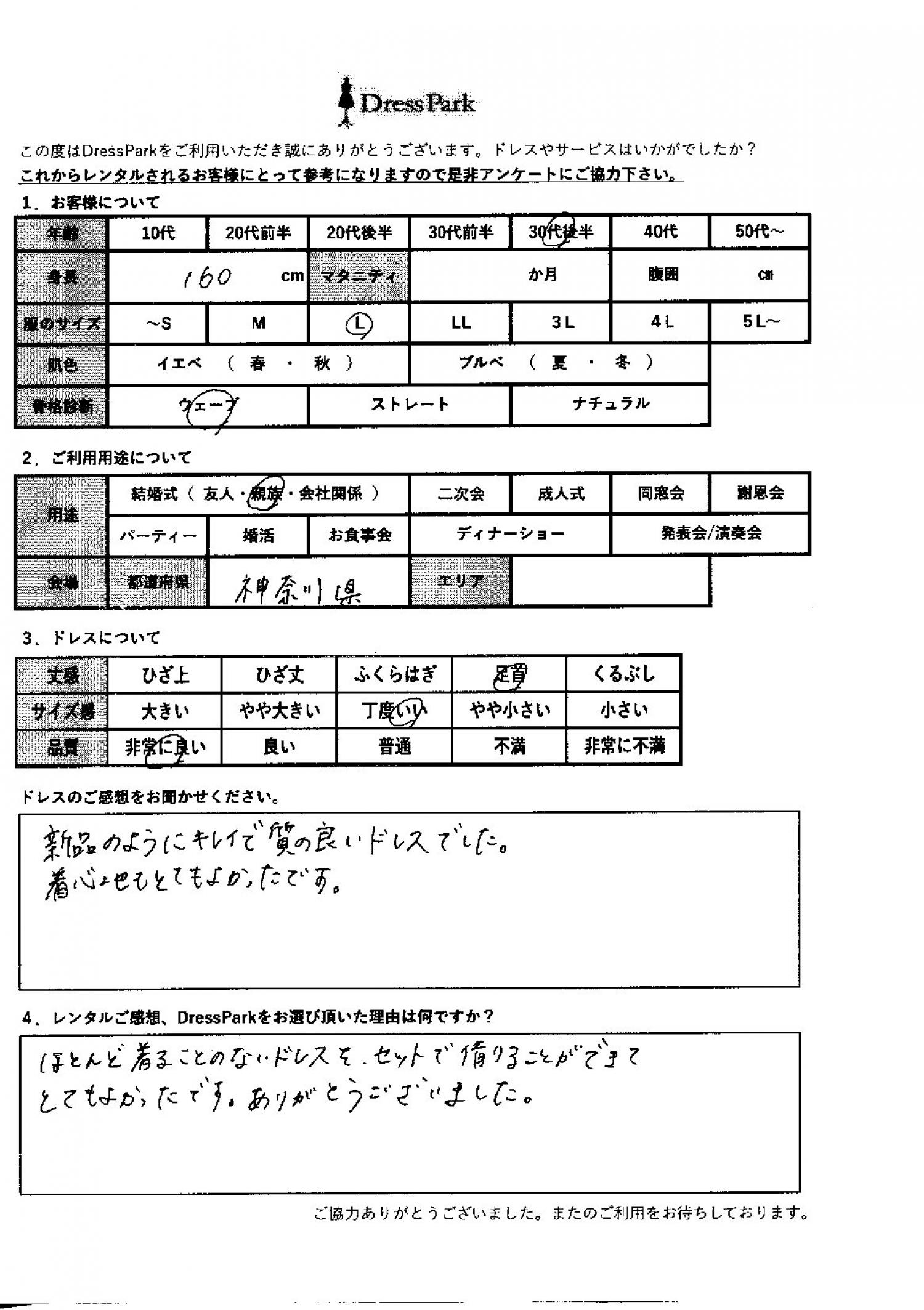 神奈川県 S.M様160㎝ Lサイズ #30代#M/L#160~164㎝#結婚式(親族)#神奈川県 ◆レンタルしたドレスはこちら ◆レンタルしたサイズは:M ◆レンタルした日付:2025/11/16 ドレスの着用感 ◆点数: (5点) ◆丈感:足首 ◆サイズ感:丁度いい ◆品質:非常に良い ◆骨格診断:ウェーブ ドレスの感想 新品のように綺麗で質の良いドレスでした。着心地もとても良かったです。 レンタルのご感想、DressParkをお選び頂いた理由 ほとんど着ることのないドレスをセットで借りることができてとても良かったです。ありがとうございました。 CUSTOMER REVIEWS お客様の声 気になるカテゴリー別にご利用の感想をチェック! ◆AGE 年代で見る 10代 20代 30代 40代 50代~ ◆SIZE サイズで見る SS/S M/L 大きいサイズLL~ ◆HIGHT 身長で見る 140~149㎝ 150~154㎝ 155~159㎝ 160~164㎝ 165~169㎝ 170㎝以上 ◆マタニティ ~3か月 4~6か月 7~8か月 9~10か月 ◆肌色 イエベ ブルべ ◆骨格診断 ウェーブ ストレート ナチュラル ◆利用シーン 結婚式(友人) 結婚式(親族) 結婚式(会社関係) 二次会 成人式 謝恩会 パーティー その他 CUSTOMER REVIEWS都道府県別お客様の声 都道府県別にのお客様の声をチェック! 北海道 青森県 岩手県 宮城県 秋田県 山形県 福島県 茨城県 栃木県 群馬県 埼玉県 千葉県 東京都 神奈川県 新潟県 富山県 石川県 福井県 山梨県 長野県 岐阜県 静岡県 愛知県 三重県 滋賀県 京都府 大阪府 兵庫県 奈良県 和歌山県 鳥取県 島根県 岡山県 広島県 山口県 徳島県 香川県 愛媛県 高知県 福岡県 佐賀県 長崎県 熊本県 大分県 宮崎県 鹿児島県 沖縄県 CUSTOMER REVIEWSエリア別お客様の声 都道府県別にのお客様の声をチェック! 札幌 仙台 名古屋 軽井沢 金沢 神戸・芦屋 博多 那覇 梅田・新大阪 難波・心斎橋 鎌倉・湘南 横浜・みなとみらい 舞浜・浦安・幕張 大宮・浦和 青山・表参道 六本木・麻布 渋谷・恵比寿 新宿 池袋 銀座・丸の内 お台場・汐留 鹿児島市 郡山市 福島市 東予 甲府・石和 LINEでお問い合わせ このサイトではJavaScriptを使用しています