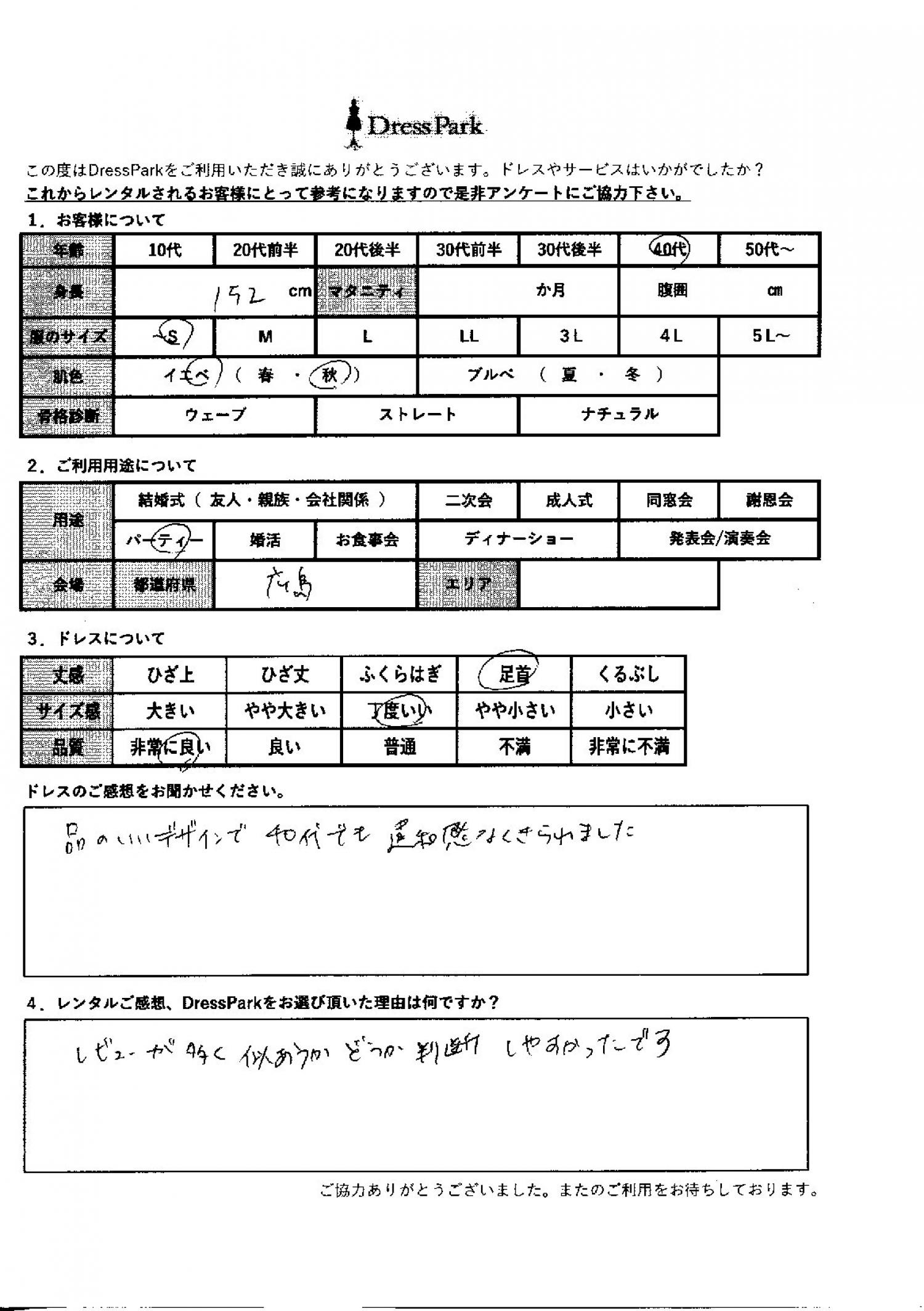 広島県 K.K様152㎝ ~Sサイズ #40代#SS/S#150~154㎝#パーティー#広島県 ◆レンタルしたドレスはこちら ◆レンタルしたサイズは:M ◆レンタルした日付:2025/11/15 ドレスの着用感 ◆点数: (5点) ◆丈感:足首 ◆サイズ感:丁度いい ◆品質:非常に良い ◆肌色:イエベ ドレスの感想 品の良いデザインで、40代でも違和感なく着られました。 レンタルのご感想、DressParkをお選び頂いた理由 レビューが多く似合うかどうか判断しやすかったです。 CUSTOMER REVIEWS お客様の声 気になるカテゴリー別にご利用の感想をチェック! ◆AGE 年代で見る 10代 20代 30代 40代 50代~ ◆SIZE サイズで見る SS/S M/L 大きいサイズLL~ ◆HIGHT 身長で見る 140~149㎝ 150~154㎝ 155~159㎝ 160~164㎝ 165~169㎝ 170㎝以上 ◆マタニティ ~3か月 4~6か月 7~8か月 9~10か月 ◆肌色 イエベ ブルべ ◆骨格診断 ウェーブ ストレート ナチュラル ◆利用シーン 結婚式(友人) 結婚式(親族) 結婚式(会社関係) 二次会 成人式 謝恩会 パーティー その他 CUSTOMER REVIEWS都道府県別お客様の声 都道府県別にのお客様の声をチェック! 北海道 青森県 岩手県 宮城県 秋田県 山形県 福島県 茨城県 栃木県 群馬県 埼玉県 千葉県 東京都 神奈川県 新潟県 富山県 石川県 福井県 山梨県 長野県 岐阜県 静岡県 愛知県 三重県 滋賀県 京都府 大阪府 兵庫県 奈良県 和歌山県 鳥取県 島根県 岡山県 広島県 山口県 徳島県 香川県 愛媛県 高知県 福岡県 佐賀県 長崎県 熊本県 大分県 宮崎県 鹿児島県 沖縄県 CUSTOMER REVIEWSエリア別お客様の声 都道府県別にのお客様の声をチェック! 札幌 仙台 名古屋 軽井沢 金沢 神戸・芦屋 博多 那覇 梅田・新大阪 難波・心斎橋 鎌倉・湘南 横浜・みなとみらい 舞浜・浦安・幕張 大宮・浦和 青山・表参道 六本木・麻布 渋谷・恵比寿 新宿 池袋 銀座・丸の内 お台場・汐留 鹿児島市 郡山市 福島市 東予 甲府・石和 LINEでお問い合わせ このサイトではJavaScriptを使用しています