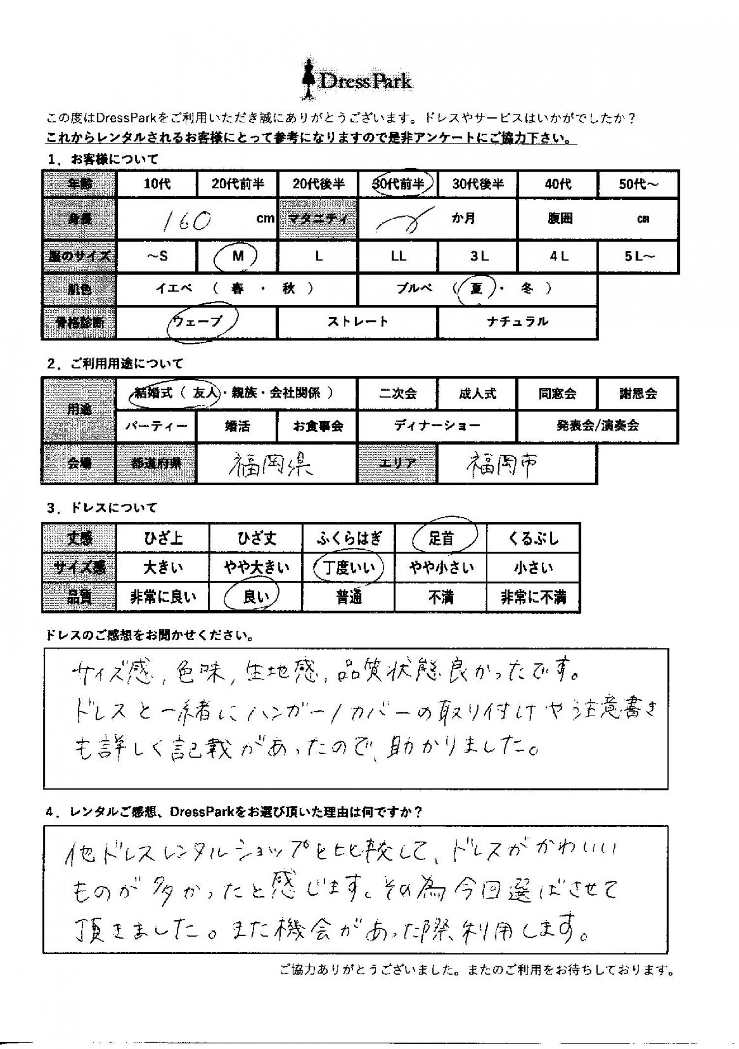 福岡県 M.O様160㎝ Mサイズ #30代#M/L#160~164㎝#結婚式(友人)#福岡県 ◆レンタルしたドレスはこちら ◆レンタルしたサイズは:M ◆レンタルした日付:2025/11/15 ドレスの着用感 ◆点数: (4点) ◆丈感:足首 ◆サイズ感:丁度いい ◆品質:良い ◆肌色:ブルべ ◆骨格診断:ウェーブ ドレスの感想 サイズ感、色味、生地感、品質状態よかったです。ドレスと一緒にハンガー、カバーの取り付けや注意書きも詳しく記載があったので助かりました。 レンタルのご感想、DressParkをお選び頂いた理由 他ドレスレンタルショップと比較して、ドレスが可愛いものが多かったと感じます。そのため、今回選ばさせていただきました。また機会があった際、利用します。 CUSTOMER REVIEWS お客様の声 気になるカテゴリー別にご利用の感想をチェック! ◆AGE 年代で見る 10代 20代 30代 40代 50代~ ◆SIZE サイズで見る SS/S M/L 大きいサイズLL~ ◆HIGHT 身長で見る 140~149㎝ 150~154㎝ 155~159㎝ 160~164㎝ 165~169㎝ 170㎝以上 ◆マタニティ ~3か月 4~6か月 7~8か月 9~10か月 ◆肌色 イエベ ブルべ ◆骨格診断 ウェーブ ストレート ナチュラル ◆利用シーン 結婚式(友人) 結婚式(親族) 結婚式(会社関係) 二次会 成人式 謝恩会 パーティー その他 CUSTOMER REVIEWS都道府県別お客様の声 都道府県別にのお客様の声をチェック! 北海道 青森県 岩手県 宮城県 秋田県 山形県 福島県 茨城県 栃木県 群馬県 埼玉県 千葉県 東京都 神奈川県 新潟県 富山県 石川県 福井県 山梨県 長野県 岐阜県 静岡県 愛知県 三重県 滋賀県 京都府 大阪府 兵庫県 奈良県 和歌山県 鳥取県 島根県 岡山県 広島県 山口県 徳島県 香川県 愛媛県 高知県 福岡県 佐賀県 長崎県 熊本県 大分県 宮崎県 鹿児島県 沖縄県 CUSTOMER REVIEWSエリア別お客様の声 都道府県別にのお客様の声をチェック! 札幌 仙台 名古屋 軽井沢 金沢 神戸・芦屋 博多 那覇 梅田・新大阪 難波・心斎橋 鎌倉・湘南 横浜・みなとみらい 舞浜・浦安・幕張 大宮・浦和 青山・表参道 六本木・麻布 渋谷・恵比寿 新宿 池袋 銀座・丸の内 お台場・汐留 鹿児島市 郡山市 福島市 東予 甲府・石和 LINEでお問い合わせ このサイトではJavaScriptを使用しています