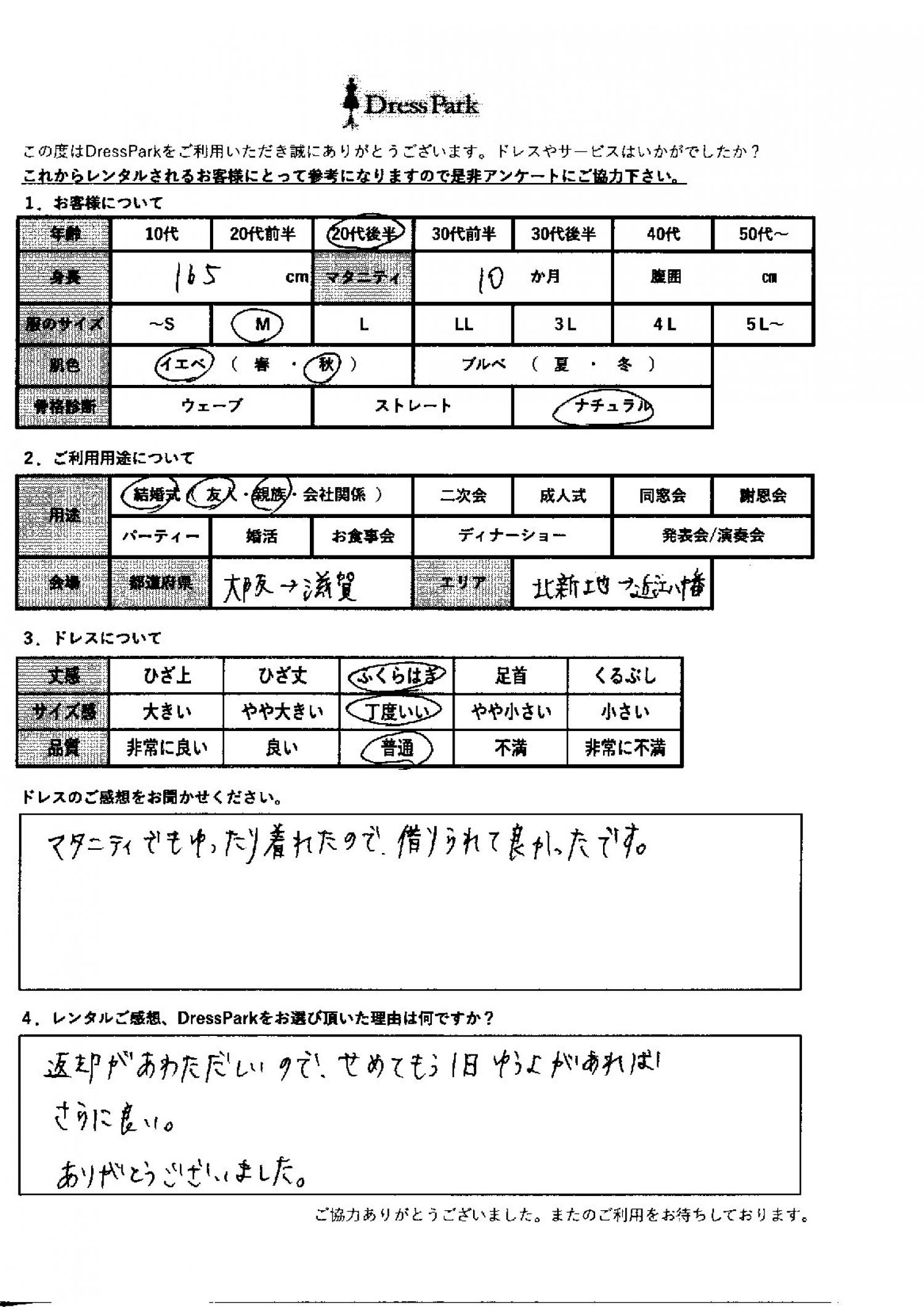 滋賀県 S.S様165㎝ Mサイズ マタニティ #20代#M/L#165~169㎝#結婚式(友人)#滋賀県 ◆レンタルしたドレスはこちら ◆レンタルしたサイズは:M ◆レンタルした日付:20225/11/16 ドレスの着用感 ◆点数: (4点) ◆丈感:ふくらはぎ ◆サイズ感:丁度いい ◆品質:普通 ◆マタニティ: ◆肌色:イエベ ◆骨格診断:ナチュラル ドレスの感想 マタニティーでもゆったり着られたので借りられてよかったです。 レンタルのご感想、DressParkをお選び頂いた理由 返却が慌ただしいので、せめてもう1日余裕があればさらに良い。ありがとうございました。 CUSTOMER REVIEWS お客様の声 気になるカテゴリー別にご利用の感想をチェック! ◆AGE 年代で見る 10代 20代 30代 40代 50代~ ◆SIZE サイズで見る SS/S M/L 大きいサイズLL~ ◆HIGHT 身長で見る 140~149㎝ 150~154㎝ 155~159㎝ 160~164㎝ 165~169㎝ 170㎝以上 ◆マタニティ ~3か月 4~6か月 7~8か月 9~10か月 ◆肌色 イエベ ブルべ ◆骨格診断 ウェーブ ストレート ナチュラル ◆利用シーン 結婚式(友人) 結婚式(親族) 結婚式(会社関係) 二次会 成人式 謝恩会 パーティー その他 CUSTOMER REVIEWS都道府県別お客様の声 都道府県別にのお客様の声をチェック! 北海道 青森県 岩手県 宮城県 秋田県 山形県 福島県 茨城県 栃木県 群馬県 埼玉県 千葉県 東京都 神奈川県 新潟県 富山県 石川県 福井県 山梨県 長野県 岐阜県 静岡県 愛知県 三重県 滋賀県 京都府 大阪府 兵庫県 奈良県 和歌山県 鳥取県 島根県 岡山県 広島県 山口県 徳島県 香川県 愛媛県 高知県 福岡県 佐賀県 長崎県 熊本県 大分県 宮崎県 鹿児島県 沖縄県 CUSTOMER REVIEWSエリア別お客様の声 都道府県別にのお客様の声をチェック! 札幌 仙台 名古屋 軽井沢 金沢 神戸・芦屋 博多 那覇 梅田・新大阪 難波・心斎橋 鎌倉・湘南 横浜・みなとみらい 舞浜・浦安・幕張 大宮・浦和 青山・表参道 六本木・麻布 渋谷・恵比寿 新宿 池袋 銀座・丸の内 お台場・汐留 鹿児島市 郡山市 福島市 東予 甲府・石和 LINEでお問い合わせ このサイトではJavaScriptを使用しています