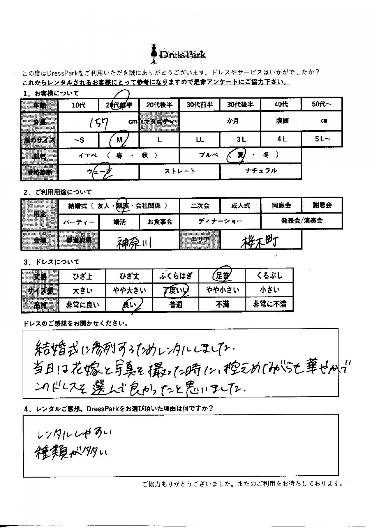 神奈川県 K.K様157㎝ Mサイズ横浜・みなとみらい #20代#M/L#155~159㎝#結婚式(親族)#神奈川県#横浜・みなとみらい ◆レンタルしたドレスはこちら ◆レンタルしたサイズは:M ◆レンタルした日付:2025/11/16 ドレスの着用感 ◆点数: (4点) ◆丈感:足首 ◆サイズ感:丁度いい ◆品質:良い ◆肌色:ブルべ ◆骨格診断:ウェーブ ドレスの感想 結婚式に参列するためレンタルしました。当日は花嫁と写真を撮ったときに、控えめながらも華やかでこのドレスを選んで良かったと思いました。 レンタルのご感想、DressParkをお選び頂いた理由 レンタルしやすい。種類が多い。 CUSTOMER REVIEWS お客様の声 気になるカテゴリー別にご利用の感想をチェック! ◆AGE 年代で見る 10代 20代 30代 40代 50代~ ◆SIZE サイズで見る SS/S M/L 大きいサイズLL~ ◆HIGHT 身長で見る 140~149㎝ 150~154㎝ 155~159㎝ 160~164㎝ 165~169㎝ 170㎝以上 ◆マタニティ ~3か月 4~6か月 7~8か月 9~10か月 ◆肌色 イエベ ブルべ ◆骨格診断 ウェーブ ストレート ナチュラル ◆利用シーン 結婚式(友人) 結婚式(親族) 結婚式(会社関係) 二次会 成人式 謝恩会 パーティー その他 CUSTOMER REVIEWS都道府県別お客様の声 都道府県別にのお客様の声をチェック! 北海道 青森県 岩手県 宮城県 秋田県 山形県 福島県 茨城県 栃木県 群馬県 埼玉県 千葉県 東京都 神奈川県 新潟県 富山県 石川県 福井県 山梨県 長野県 岐阜県 静岡県 愛知県 三重県 滋賀県 京都府 大阪府 兵庫県 奈良県 和歌山県 鳥取県 島根県 岡山県 広島県 山口県 徳島県 香川県 愛媛県 高知県 福岡県 佐賀県 長崎県 熊本県 大分県 宮崎県 鹿児島県 沖縄県 CUSTOMER REVIEWSエリア別お客様の声 都道府県別にのお客様の声をチェック! 札幌 仙台 名古屋 軽井沢 金沢 神戸・芦屋 博多 那覇 梅田・新大阪 難波・心斎橋 鎌倉・湘南 横浜・みなとみらい 舞浜・浦安・幕張 大宮・浦和 青山・表参道 六本木・麻布 渋谷・恵比寿 新宿 池袋 銀座・丸の内 お台場・汐留 鹿児島市 郡山市 福島市 東予 甲府・石和 LINEでお問い合わせ このサイトではJavaScriptを使用しています