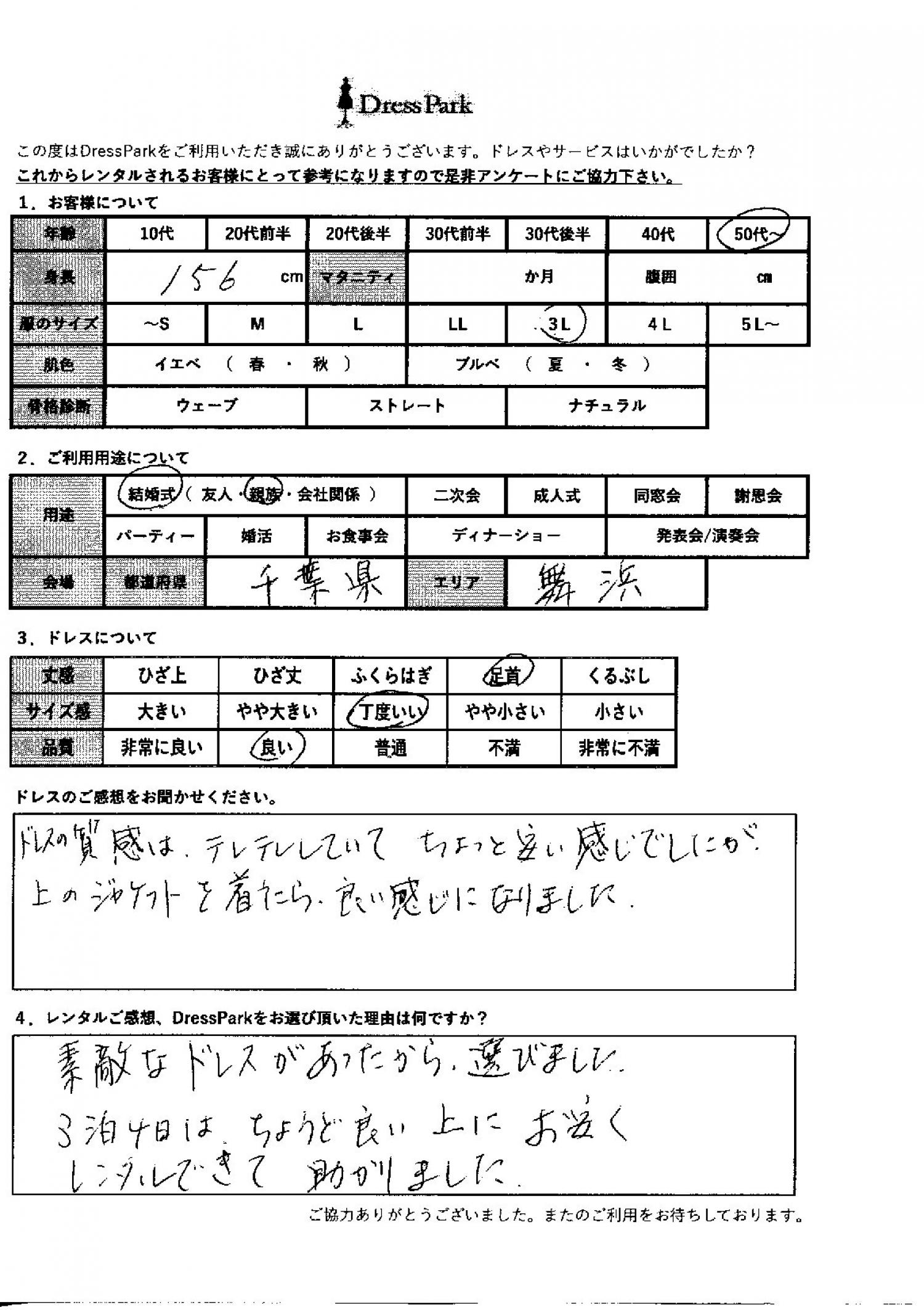 千葉県 I.M様156㎝ 3Lサイズ舞浜・浦安・幕張 #50代~#大きいサイズLL~#155~159㎝#結婚式(親族)#千葉県#舞浜・浦安・幕張 ◆レンタルしたドレスはこちら ◆レンタルしたサイズは:3L ◆レンタルした日付:2025/11/16 ドレスの着用感 ◆点数: (4点) ◆丈感:足首 ◆サイズ感:丁度いい ◆品質:良い ドレスの感想 ドレスの質感はテレテレしていて、ちょっと安い感じでしたが、上のジャケットを着たらいい感じになりました。 レンタルのご感想、DressParkをお選び頂いた理由 素敵なドレスがあったから選びました。3泊4日はちょうど良い上に、お安くレンタルできて助かりました。 CUSTOMER REVIEWS お客様の声 気になるカテゴリー別にご利用の感想をチェック! ◆AGE 年代で見る 10代 20代 30代 40代 50代~ ◆SIZE サイズで見る SS/S M/L 大きいサイズLL~ ◆HIGHT 身長で見る 140~149㎝ 150~154㎝ 155~159㎝ 160~164㎝ 165~169㎝ 170㎝以上 ◆マタニティ ~3か月 4~6か月 7~8か月 9~10か月 ◆肌色 イエベ ブルべ ◆骨格診断 ウェーブ ストレート ナチュラル ◆利用シーン 結婚式(友人) 結婚式(親族) 結婚式(会社関係) 二次会 成人式 謝恩会 パーティー その他 CUSTOMER REVIEWS都道府県別お客様の声 都道府県別にのお客様の声をチェック! 北海道 青森県 岩手県 宮城県 秋田県 山形県 福島県 茨城県 栃木県 群馬県 埼玉県 千葉県 東京都 神奈川県 新潟県 富山県 石川県 福井県 山梨県 長野県 岐阜県 静岡県 愛知県 三重県 滋賀県 京都府 大阪府 兵庫県 奈良県 和歌山県 鳥取県 島根県 岡山県 広島県 山口県 徳島県 香川県 愛媛県 高知県 福岡県 佐賀県 長崎県 熊本県 大分県 宮崎県 鹿児島県 沖縄県 CUSTOMER REVIEWSエリア別お客様の声 都道府県別にのお客様の声をチェック! 札幌 仙台 名古屋 軽井沢 金沢 神戸・芦屋 博多 那覇 梅田・新大阪 難波・心斎橋 鎌倉・湘南 横浜・みなとみらい 舞浜・浦安・幕張 大宮・浦和 青山・表参道 六本木・麻布 渋谷・恵比寿 新宿 池袋 銀座・丸の内 お台場・汐留 鹿児島市 郡山市 福島市 東予 甲府・石和 LINEでお問い合わせ このサイトではJavaScriptを使用しています