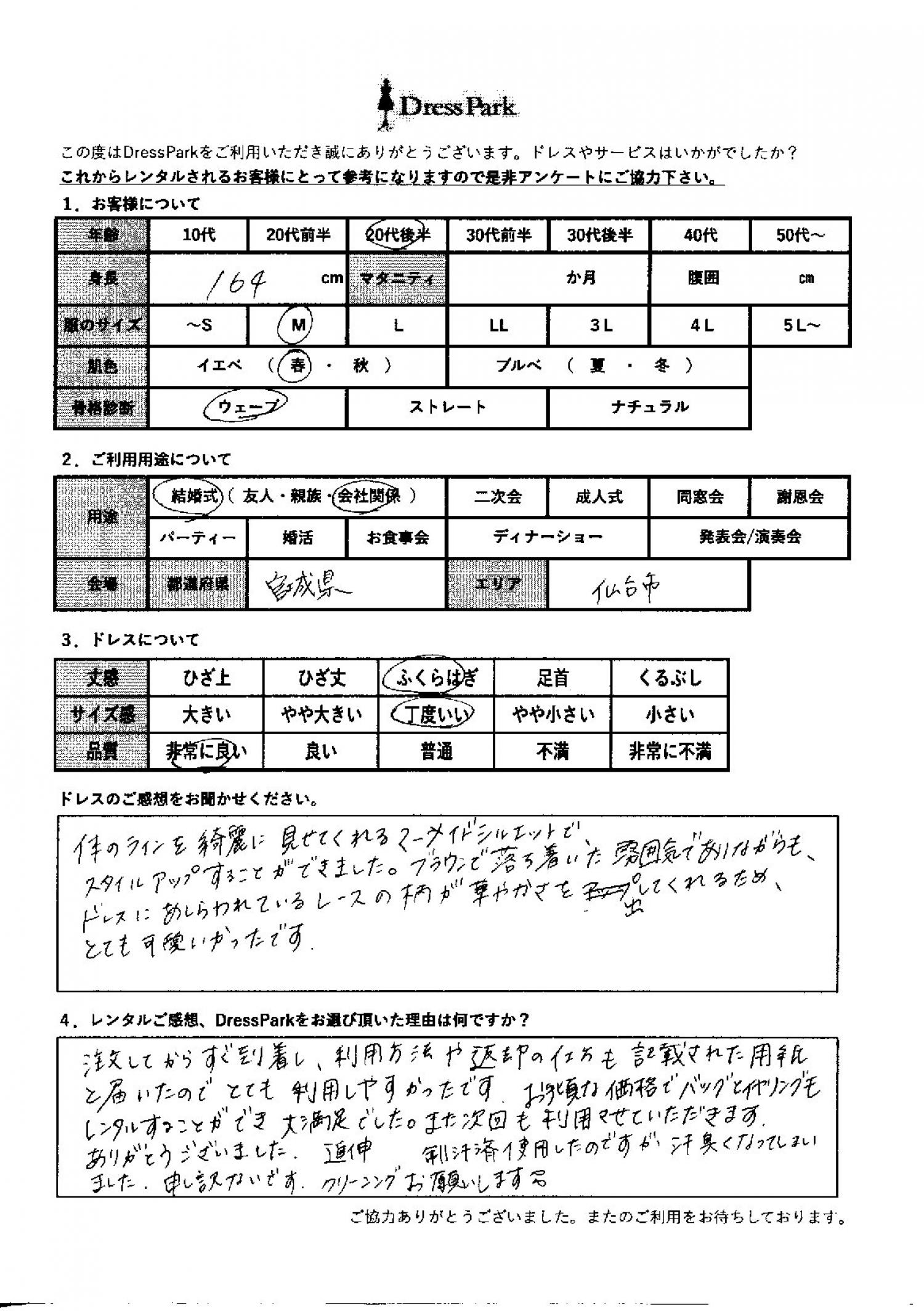 宮城県 H.S様164㎝ Mサイズ仙台 #20代#M/L#160~164㎝#結婚式(会社関係)#宮城県#仙台 ◆レンタルしたドレスはこちら ◆レンタルしたサイズは:M ◆レンタルした日付:2025/11/16 ドレスの着用感 ◆点数: (5点) ◆丈感:ふくらはぎ ◆サイズ感:丁度いい ◆品質:非常に良い ◆肌色:イエベ ◆骨格診断:ウェーブ ドレスの感想 体のラインをきれいに見せてくれるマーメイドシルエットで、スタイルアップすることができました。ブラウンで落ち着いた雰囲気でありながらも、ドレスにあしらわれているレースの柄が華やかさを出してくれるため、とても可愛かったです。 レンタルのご感想、DressParkをお選び頂いた理由 注文してからすぐ到着し、利用方法や返却の仕方も記載された用紙が一緒に届いたので、とても利用しやすかったです。お手頃なネット価格でバッグとイヤリングもレンタルすることができ大満足でした。また次回も利用させていただきます。ありがとうございました。 CUSTOMER REVIEWS お客様の声 気になるカテゴリー別にご利用の感想をチェック! ◆AGE 年代で見る 10代 20代 30代 40代 50代~ ◆SIZE サイズで見る SS/S M/L 大きいサイズLL~ ◆HIGHT 身長で見る 140~149㎝ 150~154㎝ 155~159㎝ 160~164㎝ 165~169㎝ 170㎝以上 ◆マタニティ ~3か月 4~6か月 7~8か月 9~10か月 ◆肌色 イエベ ブルべ ◆骨格診断 ウェーブ ストレート ナチュラル ◆利用シーン 結婚式(友人) 結婚式(親族) 結婚式(会社関係) 二次会 成人式 謝恩会 パーティー その他 CUSTOMER REVIEWS都道府県別お客様の声 都道府県別にのお客様の声をチェック! 北海道 青森県 岩手県 宮城県 秋田県 山形県 福島県 茨城県 栃木県 群馬県 埼玉県 千葉県 東京都 神奈川県 新潟県 富山県 石川県 福井県 山梨県 長野県 岐阜県 静岡県 愛知県 三重県 滋賀県 京都府 大阪府 兵庫県 奈良県 和歌山県 鳥取県 島根県 岡山県 広島県 山口県 徳島県 香川県 愛媛県 高知県 福岡県 佐賀県 長崎県 熊本県 大分県 宮崎県 鹿児島県 沖縄県 CUSTOMER REVIEWSエリア別お客様の声 都道府県別にのお客様の声をチェック! 札幌 仙台 名古屋 軽井沢 金沢 神戸・芦屋 博多 那覇 梅田・新大阪 難波・心斎橋 鎌倉・湘南 横浜・みなとみらい 舞浜・浦安・幕張 大宮・浦和 青山・表参道 六本木・麻布 渋谷・恵比寿 新宿 池袋 銀座・丸の内 お台場・汐留 鹿児島市 郡山市 福島市 東予 甲府・石和 LINEでお問い合わせ このサイトではJavaScriptを使用しています