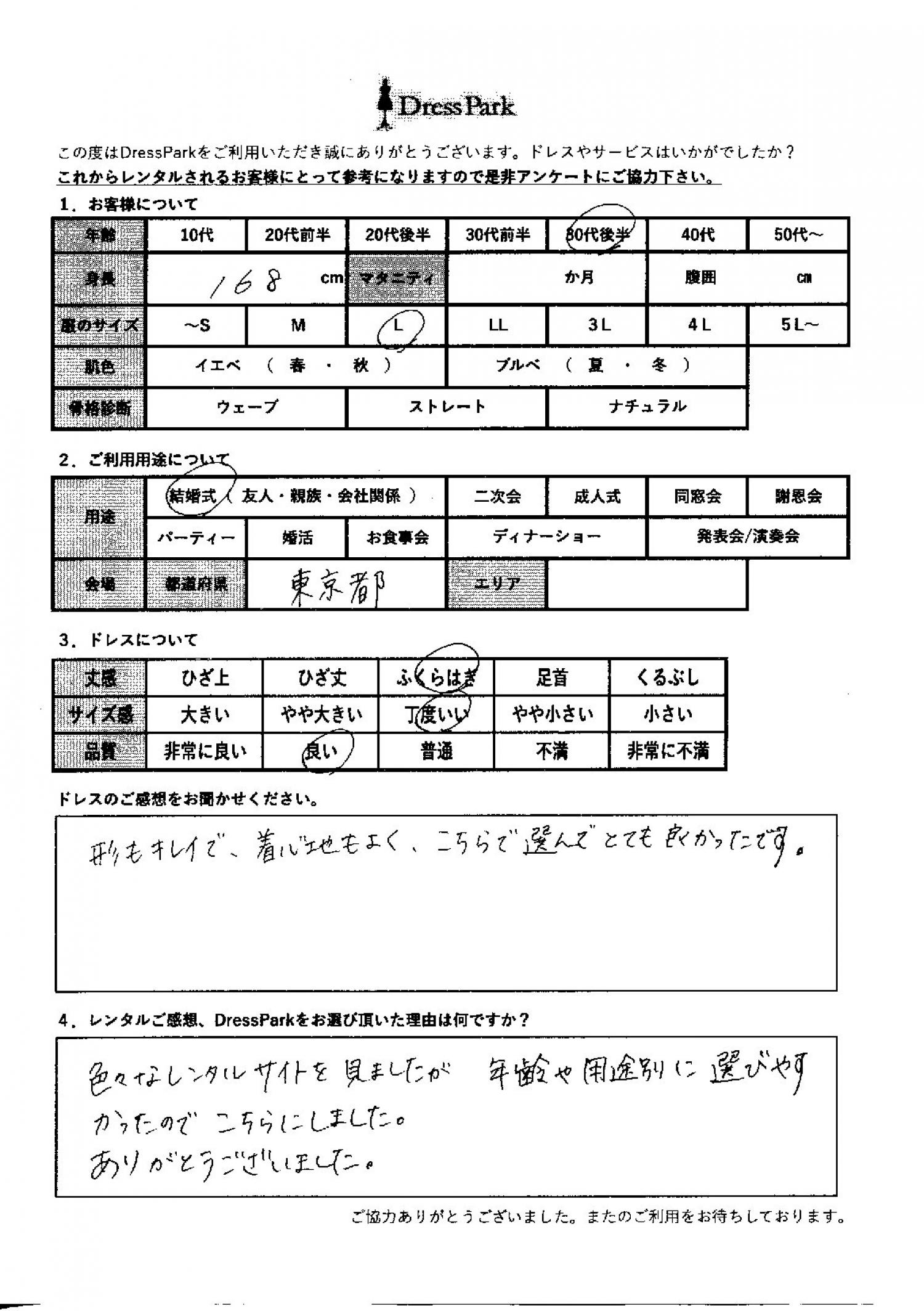 東京都 I.H様168㎝ Lサイズ #30代#M/L#165~169㎝#結婚式(友人)#東京都 ◆レンタルしたドレスはこちら ◆レンタルしたサイズは:L ◆レンタルした日付:2025/11/16 ドレスの着用感 ◆点数: (4点) ◆丈感:ふくらはぎ ◆サイズ感:丁度いい ◆品質:良い ドレスの感想 形も綺麗で着心地も良く、こちらで選んでとても良かったです。 レンタルのご感想、DressParkをお選び頂いた理由 いろいろなレンタルサイトを見ましたが、年齢や用途別に選びやすかったので、こちらにしました。ありがとうございました。 CUSTOMER REVIEWS お客様の声 気になるカテゴリー別にご利用の感想をチェック! ◆AGE 年代で見る 10代 20代 30代 40代 50代~ ◆SIZE サイズで見る SS/S M/L 大きいサイズLL~ ◆HIGHT 身長で見る 140~149㎝ 150~154㎝ 155~159㎝ 160~164㎝ 165~169㎝ 170㎝以上 ◆マタニティ ~3か月 4~6か月 7~8か月 9~10か月 ◆肌色 イエベ ブルべ ◆骨格診断 ウェーブ ストレート ナチュラル ◆利用シーン 結婚式(友人) 結婚式(親族) 結婚式(会社関係) 二次会 成人式 謝恩会 パーティー その他 CUSTOMER REVIEWS都道府県別お客様の声 都道府県別にのお客様の声をチェック! 北海道 青森県 岩手県 宮城県 秋田県 山形県 福島県 茨城県 栃木県 群馬県 埼玉県 千葉県 東京都 神奈川県 新潟県 富山県 石川県 福井県 山梨県 長野県 岐阜県 静岡県 愛知県 三重県 滋賀県 京都府 大阪府 兵庫県 奈良県 和歌山県 鳥取県 島根県 岡山県 広島県 山口県 徳島県 香川県 愛媛県 高知県 福岡県 佐賀県 長崎県 熊本県 大分県 宮崎県 鹿児島県 沖縄県 CUSTOMER REVIEWSエリア別お客様の声 都道府県別にのお客様の声をチェック! 札幌 仙台 名古屋 軽井沢 金沢 神戸・芦屋 博多 那覇 梅田・新大阪 難波・心斎橋 鎌倉・湘南 横浜・みなとみらい 舞浜・浦安・幕張 大宮・浦和 青山・表参道 六本木・麻布 渋谷・恵比寿 新宿 池袋 銀座・丸の内 お台場・汐留 鹿児島市 郡山市 福島市 東予 甲府・石和 LINEでお問い合わせ このサイトではJavaScriptを使用しています