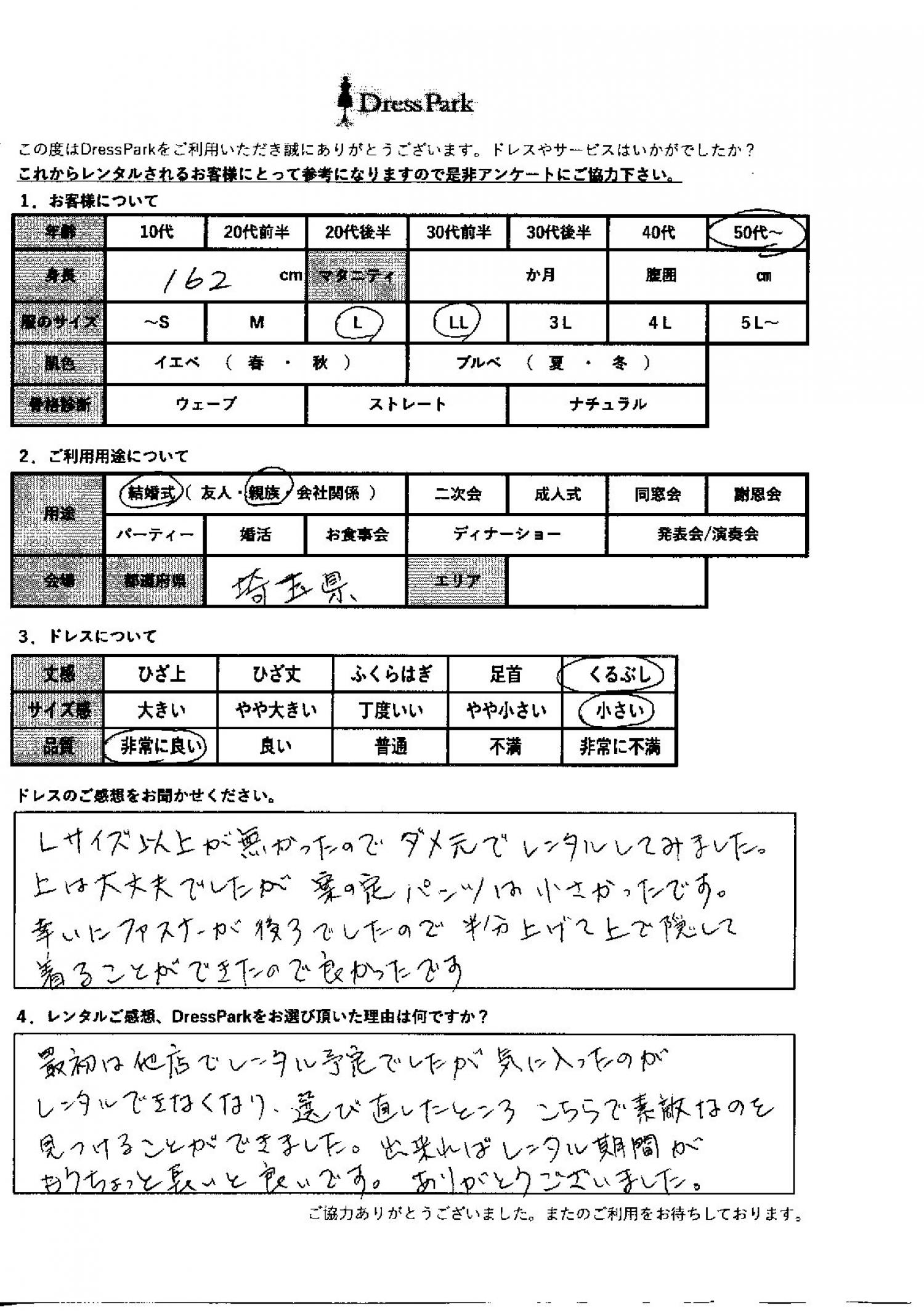 埼玉県 N.O様162㎝ LLサイズ #50代~#大きいサイズLL~#160~164㎝#結婚式(親族)#埼玉県 ◆レンタルしたドレスはこちら ◆レンタルしたサイズは:L ◆レンタルした日付:2025/11/16 ドレスの着用感 ◆点数: (5点) ◆丈感:くるぶし ◆サイズ感:小さい ◆品質:非常に良い ドレスの感想 Lサイズ以上がなかったので、ダメ元でレンタルしてみました。上は大丈夫でしたが、案の定パンツは小さかったです。幸いにファスナーが後ろでしたので、半分あげて上で隠して着ることができたのでよかったです。 レンタルのご感想、DressParkをお選び頂いた理由 最初は他店でレンタル予定でしたが、気に入ったのがレンタルできなくなり、選び直したところ、こちらで素敵なのを見つけることができました。できればレンタル期間がもうちょっと長いと良いです。ありがとうございました。 CUSTOMER REVIEWS お客様の声 気になるカテゴリー別にご利用の感想をチェック! ◆AGE 年代で見る 10代 20代 30代 40代 50代~ ◆SIZE サイズで見る SS/S M/L 大きいサイズLL~ ◆HIGHT 身長で見る 140~149㎝ 150~154㎝ 155~159㎝ 160~164㎝ 165~169㎝ 170㎝以上 ◆マタニティ ~3か月 4~6か月 7~8か月 9~10か月 ◆肌色 イエベ ブルべ ◆骨格診断 ウェーブ ストレート ナチュラル ◆利用シーン 結婚式(友人) 結婚式(親族) 結婚式(会社関係) 二次会 成人式 謝恩会 パーティー その他 CUSTOMER REVIEWS都道府県別お客様の声 都道府県別にのお客様の声をチェック! 北海道 青森県 岩手県 宮城県 秋田県 山形県 福島県 茨城県 栃木県 群馬県 埼玉県 千葉県 東京都 神奈川県 新潟県 富山県 石川県 福井県 山梨県 長野県 岐阜県 静岡県 愛知県 三重県 滋賀県 京都府 大阪府 兵庫県 奈良県 和歌山県 鳥取県 島根県 岡山県 広島県 山口県 徳島県 香川県 愛媛県 高知県 福岡県 佐賀県 長崎県 熊本県 大分県 宮崎県 鹿児島県 沖縄県 CUSTOMER REVIEWSエリア別お客様の声 都道府県別にのお客様の声をチェック! 札幌 仙台 名古屋 軽井沢 金沢 神戸・芦屋 博多 那覇 梅田・新大阪 難波・心斎橋 鎌倉・湘南 横浜・みなとみらい 舞浜・浦安・幕張 大宮・浦和 青山・表参道 六本木・麻布 渋谷・恵比寿 新宿 池袋 銀座・丸の内 お台場・汐留 鹿児島市 郡山市 福島市 東予 甲府・石和 LINEでお問い合わせ このサイトではJavaScriptを使用しています