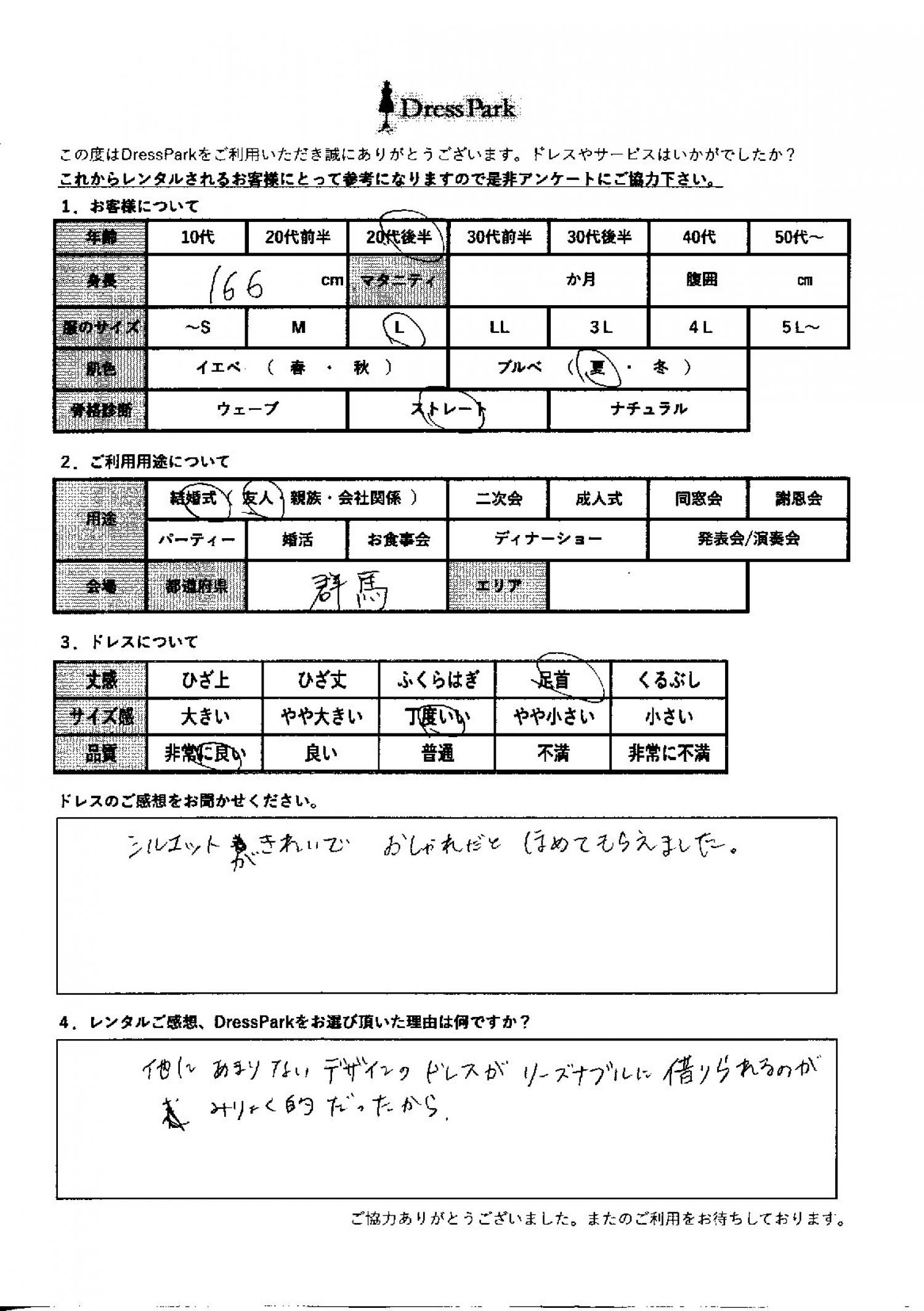 群馬県 M.H様166㎝ Lサイズ #20代#M/L#165~169㎝#結婚式(友人)#群馬県 ◆レンタルしたドレスはこちら ◆レンタルしたサイズは:L ◆レンタルした日付:2025/11/16 ドレスの着用感 ◆点数: (5点) ◆丈感:足首 ◆サイズ感:丁度いい ◆品質:非常に良い ◆肌色:ブルべ ◆骨格診断:ストレート ドレスの感想 シルエットが綺麗でおしゃれだと褒めてもらえました。 レンタルのご感想、DressParkをお選び頂いた理由 他にあまりないデザインのドレスがリーズナブルに借りられるのが魅力的だったから。 CUSTOMER REVIEWS お客様の声 気になるカテゴリー別にご利用の感想をチェック! ◆AGE 年代で見る 10代 20代 30代 40代 50代~ ◆SIZE サイズで見る SS/S M/L 大きいサイズLL~ ◆HIGHT 身長で見る 140~149㎝ 150~154㎝ 155~159㎝ 160~164㎝ 165~169㎝ 170㎝以上 ◆マタニティ ~3か月 4~6か月 7~8か月 9~10か月 ◆肌色 イエベ ブルべ ◆骨格診断 ウェーブ ストレート ナチュラル ◆利用シーン 結婚式(友人) 結婚式(親族) 結婚式(会社関係) 二次会 成人式 謝恩会 パーティー その他 CUSTOMER REVIEWS都道府県別お客様の声 都道府県別にのお客様の声をチェック! 北海道 青森県 岩手県 宮城県 秋田県 山形県 福島県 茨城県 栃木県 群馬県 埼玉県 千葉県 東京都 神奈川県 新潟県 富山県 石川県 福井県 山梨県 長野県 岐阜県 静岡県 愛知県 三重県 滋賀県 京都府 大阪府 兵庫県 奈良県 和歌山県 鳥取県 島根県 岡山県 広島県 山口県 徳島県 香川県 愛媛県 高知県 福岡県 佐賀県 長崎県 熊本県 大分県 宮崎県 鹿児島県 沖縄県 CUSTOMER REVIEWSエリア別お客様の声 都道府県別にのお客様の声をチェック! 札幌 仙台 名古屋 軽井沢 金沢 神戸・芦屋 博多 那覇 梅田・新大阪 難波・心斎橋 鎌倉・湘南 横浜・みなとみらい 舞浜・浦安・幕張 大宮・浦和 青山・表参道 六本木・麻布 渋谷・恵比寿 新宿 池袋 銀座・丸の内 お台場・汐留 鹿児島市 郡山市 福島市 東予 甲府・石和 LINEでお問い合わせ このサイトではJavaScriptを使用しています