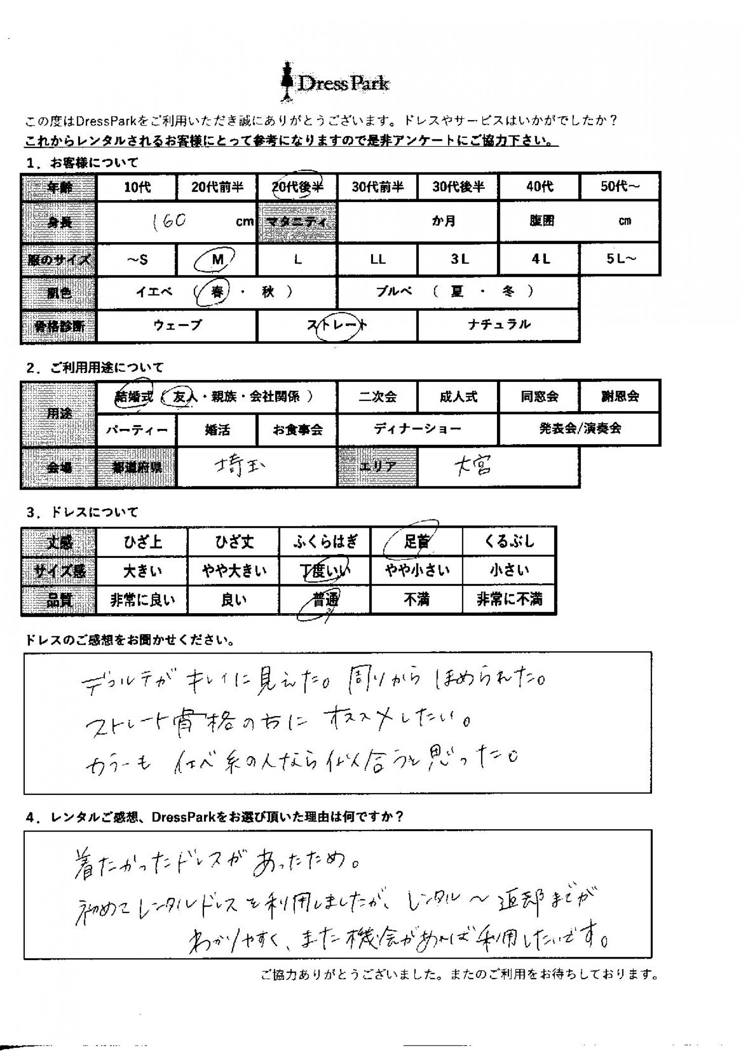 埼玉県 A.I様160㎝ Mサイズ大宮・浦和 #20代#M/L#160~164㎝#結婚式(友人)#埼玉県#大宮・浦和 ◆レンタルしたドレスはこちら ◆レンタルしたサイズは:M ◆レンタルした日付:2025/11/22 ドレスの着用感 ◆点数: (4点) ◆丈感:足首 ◆サイズ感:丁度いい ◆品質:普通 ◆肌色:イエベ ◆骨格診断:ストレート ドレスの感想 デコルテがきれいに見えた。周りから褒められた。ストレート骨格の方にお勧めしたい。カラーもイエベ系の人なら似合うと思った。 レンタルのご感想、DressParkをお選び頂いた理由 着たかったドレスがあったため。初めてレンタルドレスを利用しましたが、レンタルから返却までが分かりやすく、また機会があれば利用したいです。 CUSTOMER REVIEWS お客様の声 気になるカテゴリー別にご利用の感想をチェック! ◆AGE 年代で見る 10代 20代 30代 40代 50代~ ◆SIZE サイズで見る SS/S M/L 大きいサイズLL~ ◆HIGHT 身長で見る 140~149㎝ 150~154㎝ 155~159㎝ 160~164㎝ 165~169㎝ 170㎝以上 ◆マタニティ ~3か月 4~6か月 7~8か月 9~10か月 ◆肌色 イエベ ブルべ ◆骨格診断 ウェーブ ストレート ナチュラル ◆利用シーン 結婚式(友人) 結婚式(親族) 結婚式(会社関係) 二次会 成人式 謝恩会 パーティー その他 CUSTOMER REVIEWS都道府県別お客様の声 都道府県別にのお客様の声をチェック! 北海道 青森県 岩手県 宮城県 秋田県 山形県 福島県 茨城県 栃木県 群馬県 埼玉県 千葉県 東京都 神奈川県 新潟県 富山県 石川県 福井県 山梨県 長野県 岐阜県 静岡県 愛知県 三重県 滋賀県 京都府 大阪府 兵庫県 奈良県 和歌山県 鳥取県 島根県 岡山県 広島県 山口県 徳島県 香川県 愛媛県 高知県 福岡県 佐賀県 長崎県 熊本県 大分県 宮崎県 鹿児島県 沖縄県 CUSTOMER REVIEWSエリア別お客様の声 都道府県別にのお客様の声をチェック! 札幌 仙台 名古屋 軽井沢 金沢 神戸・芦屋 博多 那覇 梅田・新大阪 難波・心斎橋 鎌倉・湘南 横浜・みなとみらい 舞浜・浦安・幕張 大宮・浦和 青山・表参道 六本木・麻布 渋谷・恵比寿 新宿 池袋 銀座・丸の内 お台場・汐留 鹿児島市 郡山市 福島市 東予 甲府・石和 LINEでお問い合わせ このサイトではJavaScriptを使用しています