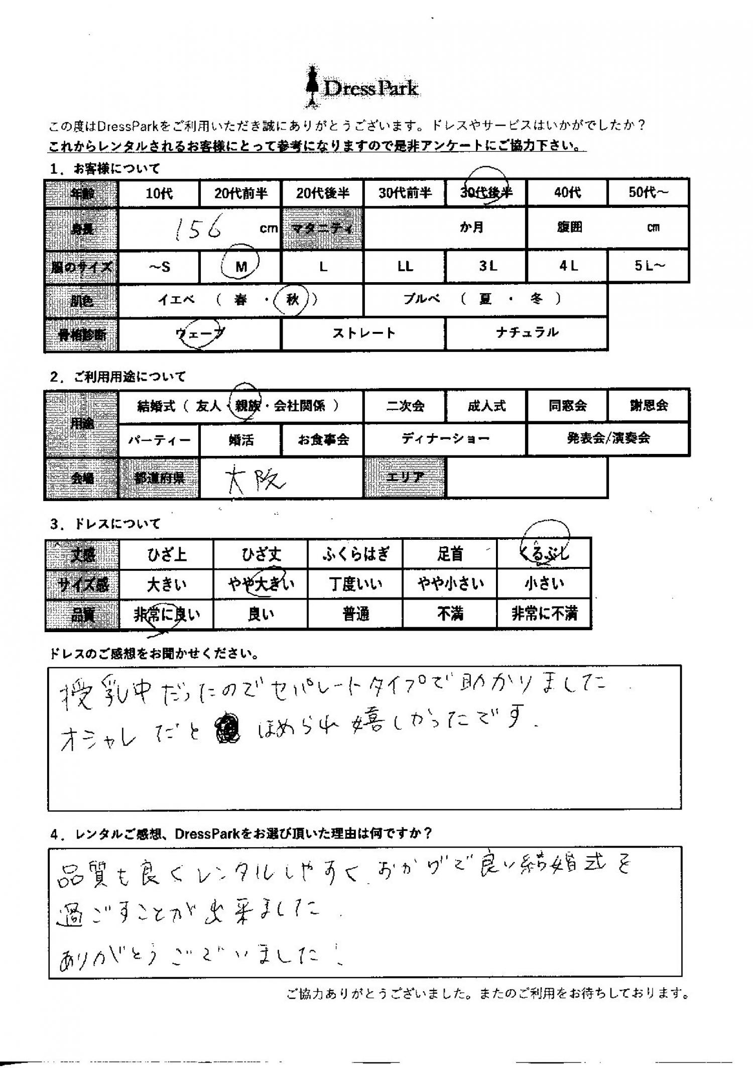 大阪府 H.O様156㎝ Mサイズ #30代#M/L#155~159㎝#結婚式(親族)#大阪府 ◆レンタルしたドレスはこちら ◆レンタルしたサイズは:M ◆レンタルした日付:2025/11/22 ドレスの着用感 ◆点数: (5点) ◆丈感:くるぶし ◆サイズ感:やや大きい ◆品質:非常に良い ◆肌色:イエベ ◆骨格診断:ウェーブ ドレスの感想 授乳中だったので、セパレートタイプで助かりました。おしゃれだと褒められて嬉しかったです。 レンタルのご感想、DressParkをお選び頂いた理由 品質も良くレンタルしやすく、おかげで良い結婚式を過ごすことができました。ありがとうございました! CUSTOMER REVIEWS お客様の声 気になるカテゴリー別にご利用の感想をチェック! ◆AGE 年代で見る 10代 20代 30代 40代 50代~ ◆SIZE サイズで見る SS/S M/L 大きいサイズLL~ ◆HIGHT 身長で見る 140~149㎝ 150~154㎝ 155~159㎝ 160~164㎝ 165~169㎝ 170㎝以上 ◆マタニティ ~3か月 4~6か月 7~8か月 9~10か月 ◆肌色 イエベ ブルべ ◆骨格診断 ウェーブ ストレート ナチュラル ◆利用シーン 結婚式(友人) 結婚式(親族) 結婚式(会社関係) 二次会 成人式 謝恩会 パーティー その他 CUSTOMER REVIEWS都道府県別お客様の声 都道府県別にのお客様の声をチェック! 北海道 青森県 岩手県 宮城県 秋田県 山形県 福島県 茨城県 栃木県 群馬県 埼玉県 千葉県 東京都 神奈川県 新潟県 富山県 石川県 福井県 山梨県 長野県 岐阜県 静岡県 愛知県 三重県 滋賀県 京都府 大阪府 兵庫県 奈良県 和歌山県 鳥取県 島根県 岡山県 広島県 山口県 徳島県 香川県 愛媛県 高知県 福岡県 佐賀県 長崎県 熊本県 大分県 宮崎県 鹿児島県 沖縄県 CUSTOMER REVIEWSエリア別お客様の声 都道府県別にのお客様の声をチェック! 札幌 仙台 名古屋 軽井沢 金沢 神戸・芦屋 博多 那覇 梅田・新大阪 難波・心斎橋 鎌倉・湘南 横浜・みなとみらい 舞浜・浦安・幕張 大宮・浦和 青山・表参道 六本木・麻布 渋谷・恵比寿 新宿 池袋 銀座・丸の内 お台場・汐留 鹿児島市 郡山市 福島市 東予 甲府・石和 LINEでお問い合わせ このサイトではJavaScriptを使用しています