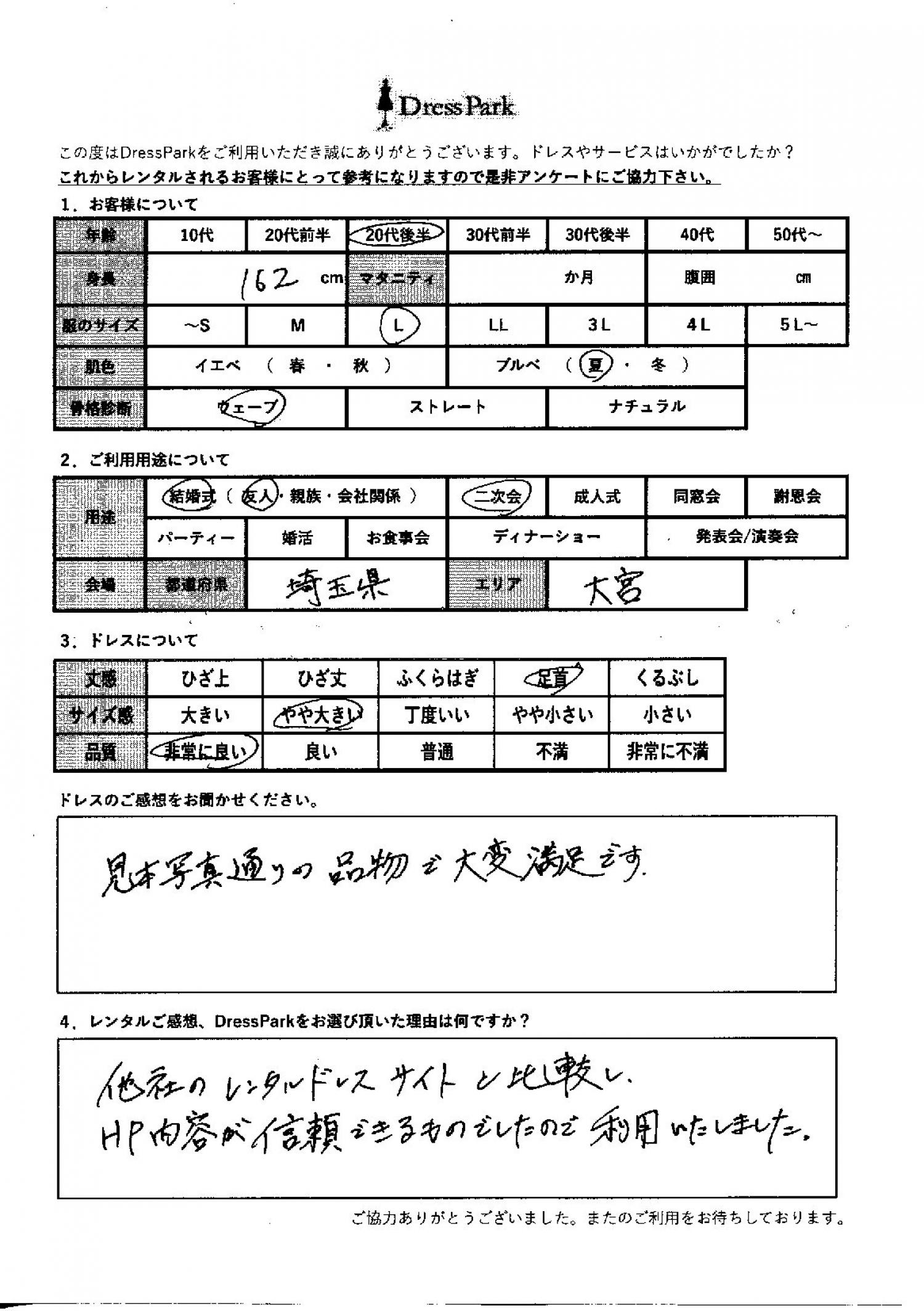 埼玉県 C.A様162㎝ Lサイズ大宮・浦和 #20代#M/L#160~164㎝#結婚式(友人)#埼玉県#大宮・浦和 ◆レンタルしたドレスはこちら ◆レンタルしたサイズは:L ◆レンタルした日付:2025/11/21 ドレスの着用感 ◆点数: (5点) ◆丈感:足首 ◆サイズ感:やや大きい ◆品質:非常に良い ◆肌色:ブルべ ◆骨格診断:ウェーブ ドレスの感想 見本写真通りの品物で大変満足です。 レンタルのご感想、DressParkをお選び頂いた理由 他社のレンタルドレスサイトと比較し、ホームページ内容が信頼できるものでしたので、利用いたしました。 CUSTOMER REVIEWS お客様の声 気になるカテゴリー別にご利用の感想をチェック! ◆AGE 年代で見る 10代 20代 30代 40代 50代~ ◆SIZE サイズで見る SS/S M/L 大きいサイズLL~ ◆HIGHT 身長で見る 140~149㎝ 150~154㎝ 155~159㎝ 160~164㎝ 165~169㎝ 170㎝以上 ◆マタニティ ~3か月 4~6か月 7~8か月 9~10か月 ◆肌色 イエベ ブルべ ◆骨格診断 ウェーブ ストレート ナチュラル ◆利用シーン 結婚式(友人) 結婚式(親族) 結婚式(会社関係) 二次会 成人式 謝恩会 パーティー その他 CUSTOMER REVIEWS都道府県別お客様の声 都道府県別にのお客様の声をチェック! 北海道 青森県 岩手県 宮城県 秋田県 山形県 福島県 茨城県 栃木県 群馬県 埼玉県 千葉県 東京都 神奈川県 新潟県 富山県 石川県 福井県 山梨県 長野県 岐阜県 静岡県 愛知県 三重県 滋賀県 京都府 大阪府 兵庫県 奈良県 和歌山県 鳥取県 島根県 岡山県 広島県 山口県 徳島県 香川県 愛媛県 高知県 福岡県 佐賀県 長崎県 熊本県 大分県 宮崎県 鹿児島県 沖縄県 CUSTOMER REVIEWSエリア別お客様の声 都道府県別にのお客様の声をチェック! 札幌 仙台 名古屋 軽井沢 金沢 神戸・芦屋 博多 那覇 梅田・新大阪 難波・心斎橋 鎌倉・湘南 横浜・みなとみらい 舞浜・浦安・幕張 大宮・浦和 青山・表参道 六本木・麻布 渋谷・恵比寿 新宿 池袋 銀座・丸の内 お台場・汐留 鹿児島市 郡山市 福島市 東予 甲府・石和 LINEでお問い合わせ このサイトではJavaScriptを使用しています