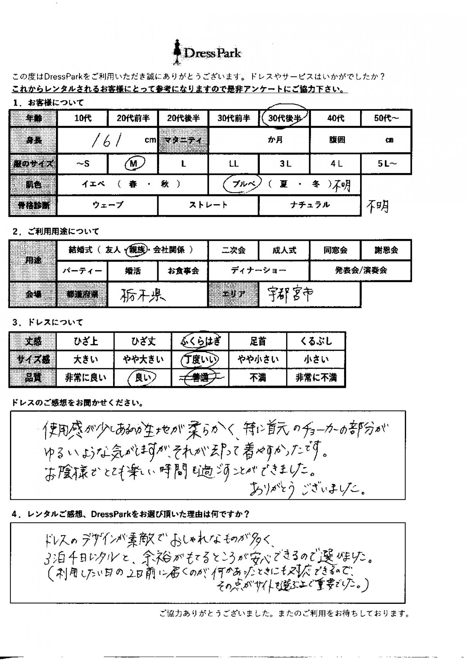栃木県 K.H様161㎝ Mサイズ #30代#M/L#160~164㎝#結婚式(親族)#栃木県 ◆レンタルしたドレスはこちら ◆レンタルしたサイズは:M ◆レンタルした日付:2025/11/22 ドレスの着用感 ◆点数: (4点) ◆丈感:ふくらはぎ ◆サイズ感:丁度いい ◆品質:良い ◆肌色:ブルべ ドレスの感想 使用感が少しあるのか、生地が柔らかく、特に胸元のチョーカーの部分がゆるいような気がしますが、それがかえって着やすかったです。おかげさまでとても楽しい時間を過ごすことができました。ありがとうございました。 レンタルのご感想、DressParkをお選び頂いた理由 ドレスのデザインが素敵で、おしゃれなものが多く、3泊4日レンタルと余裕が持てるところが安心できるので選びました。(利用した日の2日前に届くのが何かあったときに対応できるので、その点がサイトを選ぶ上で重要でした) CUSTOMER REVIEWS お客様の声 気になるカテゴリー別にご利用の感想をチェック! ◆AGE 年代で見る 10代 20代 30代 40代 50代~ ◆SIZE サイズで見る SS/S M/L 大きいサイズLL~ ◆HIGHT 身長で見る 140~149㎝ 150~154㎝ 155~159㎝ 160~164㎝ 165~169㎝ 170㎝以上 ◆マタニティ ~3か月 4~6か月 7~8か月 9~10か月 ◆肌色 イエベ ブルべ ◆骨格診断 ウェーブ ストレート ナチュラル ◆利用シーン 結婚式(友人) 結婚式(親族) 結婚式(会社関係) 二次会 成人式 謝恩会 パーティー その他 CUSTOMER REVIEWS都道府県別お客様の声 都道府県別にのお客様の声をチェック! 北海道 青森県 岩手県 宮城県 秋田県 山形県 福島県 茨城県 栃木県 群馬県 埼玉県 千葉県 東京都 神奈川県 新潟県 富山県 石川県 福井県 山梨県 長野県 岐阜県 静岡県 愛知県 三重県 滋賀県 京都府 大阪府 兵庫県 奈良県 和歌山県 鳥取県 島根県 岡山県 広島県 山口県 徳島県 香川県 愛媛県 高知県 福岡県 佐賀県 長崎県 熊本県 大分県 宮崎県 鹿児島県 沖縄県 CUSTOMER REVIEWSエリア別お客様の声 都道府県別にのお客様の声をチェック! 札幌 仙台 名古屋 軽井沢 金沢 神戸・芦屋 博多 那覇 梅田・新大阪 難波・心斎橋 鎌倉・湘南 横浜・みなとみらい 舞浜・浦安・幕張 大宮・浦和 青山・表参道 六本木・麻布 渋谷・恵比寿 新宿 池袋 銀座・丸の内 お台場・汐留 鹿児島市 郡山市 福島市 東予 甲府・石和 LINEでお問い合わせ このサイトではJavaScriptを使用しています