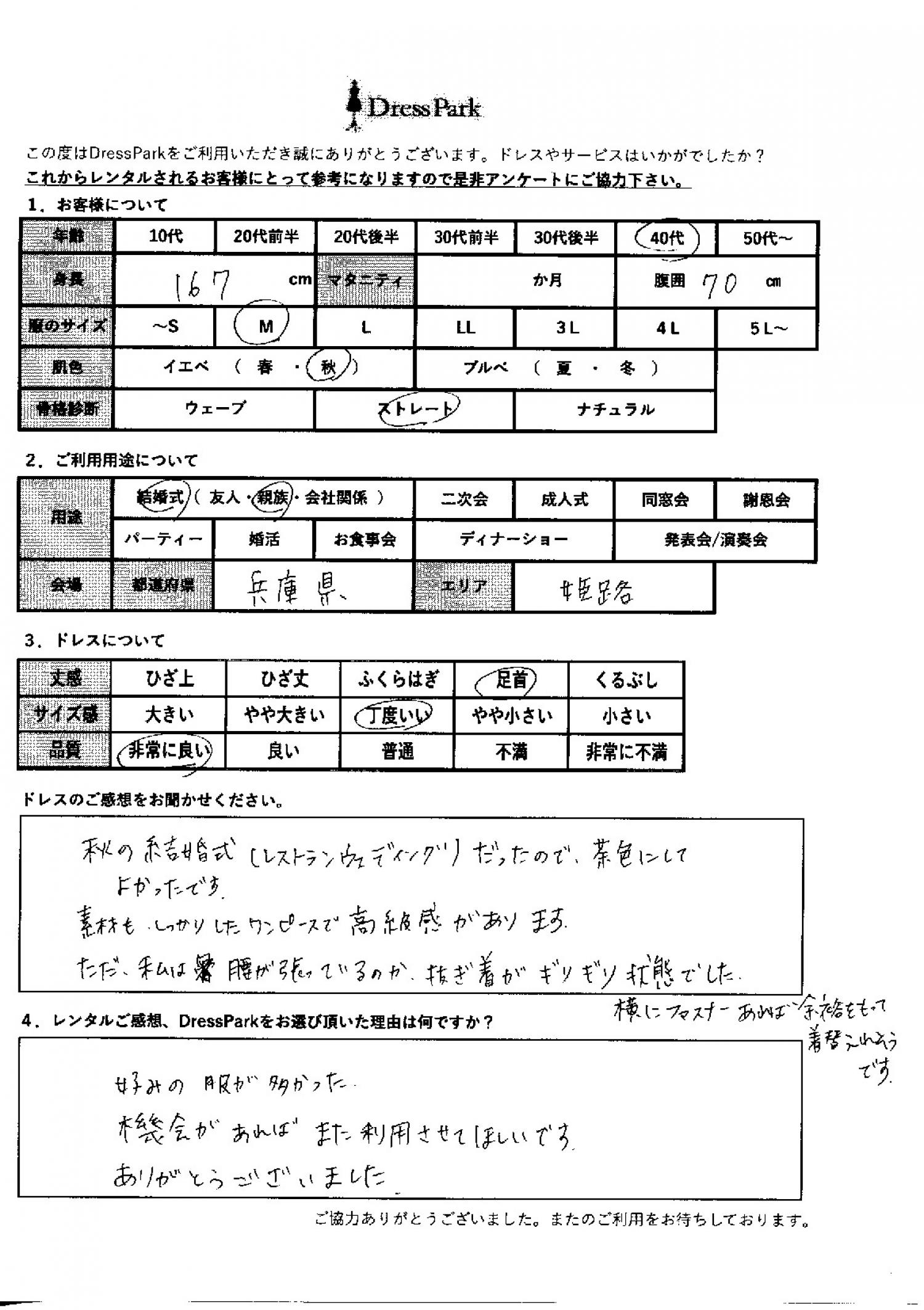 秋の結婚式(レストランウェディング)だったので、茶色にしてよかったです。素材もしっかりしたワンピースで高級感があります。ただ、私は腰が張っているのか、脱ぎ着がギリギリ状態でした。横にファスナーがあれば、余裕を持って着替えられそうです。