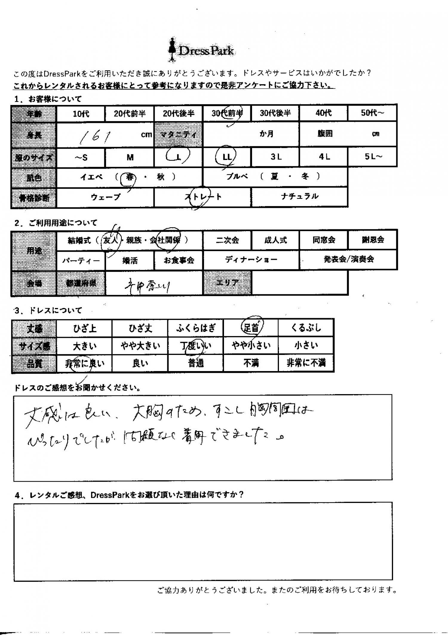 神奈川県 M.I様161㎝ Lサイズ #30代#M/L#160~164㎝#結婚式(会社関係)#神奈川県 ◆レンタルしたドレスはこちら ◆レンタルしたサイズは:M ◆レンタルした日付:2025/11/22 ドレスの着用感 ◆点数: (5点) ◆丈感:足首 ◆サイズ感:丁度いい ◆品質:非常に良い ◆肌色:イエベ ◆骨格診断:ストレート ドレスの感想 丈感は良い。大胸のため少し胸囲はぴったりでしたが、問題なく着用できました。 CUSTOMER REVIEWS お客様の声 気になるカテゴリー別にご利用の感想をチェック! ◆AGE 年代で見る 10代 20代 30代 40代 50代~ ◆SIZE サイズで見る SS/S M/L 大きいサイズLL~ ◆HIGHT 身長で見る 140~149㎝ 150~154㎝ 155~159㎝ 160~164㎝ 165~169㎝ 170㎝以上 ◆マタニティ ~3か月 4~6か月 7~8か月 9~10か月 ◆肌色 イエベ ブルべ ◆骨格診断 ウェーブ ストレート ナチュラル ◆利用シーン 結婚式(友人) 結婚式(親族) 結婚式(会社関係) 二次会 成人式 謝恩会 パーティー その他 CUSTOMER REVIEWS都道府県別お客様の声 都道府県別にのお客様の声をチェック! 北海道 青森県 岩手県 宮城県 秋田県 山形県 福島県 茨城県 栃木県 群馬県 埼玉県 千葉県 東京都 神奈川県 新潟県 富山県 石川県 福井県 山梨県 長野県 岐阜県 静岡県 愛知県 三重県 滋賀県 京都府 大阪府 兵庫県 奈良県 和歌山県 鳥取県 島根県 岡山県 広島県 山口県 徳島県 香川県 愛媛県 高知県 福岡県 佐賀県 長崎県 熊本県 大分県 宮崎県 鹿児島県 沖縄県 CUSTOMER REVIEWSエリア別お客様の声 都道府県別にのお客様の声をチェック! 札幌 仙台 名古屋 軽井沢 金沢 神戸・芦屋 博多 那覇 梅田・新大阪 難波・心斎橋 鎌倉・湘南 横浜・みなとみらい 舞浜・浦安・幕張 大宮・浦和 青山・表参道 六本木・麻布 渋谷・恵比寿 新宿 池袋 銀座・丸の内 お台場・汐留 鹿児島市 郡山市 福島市 東予 甲府・石和 LINEでお問い合わせ このサイトではJavaScriptを使用しています