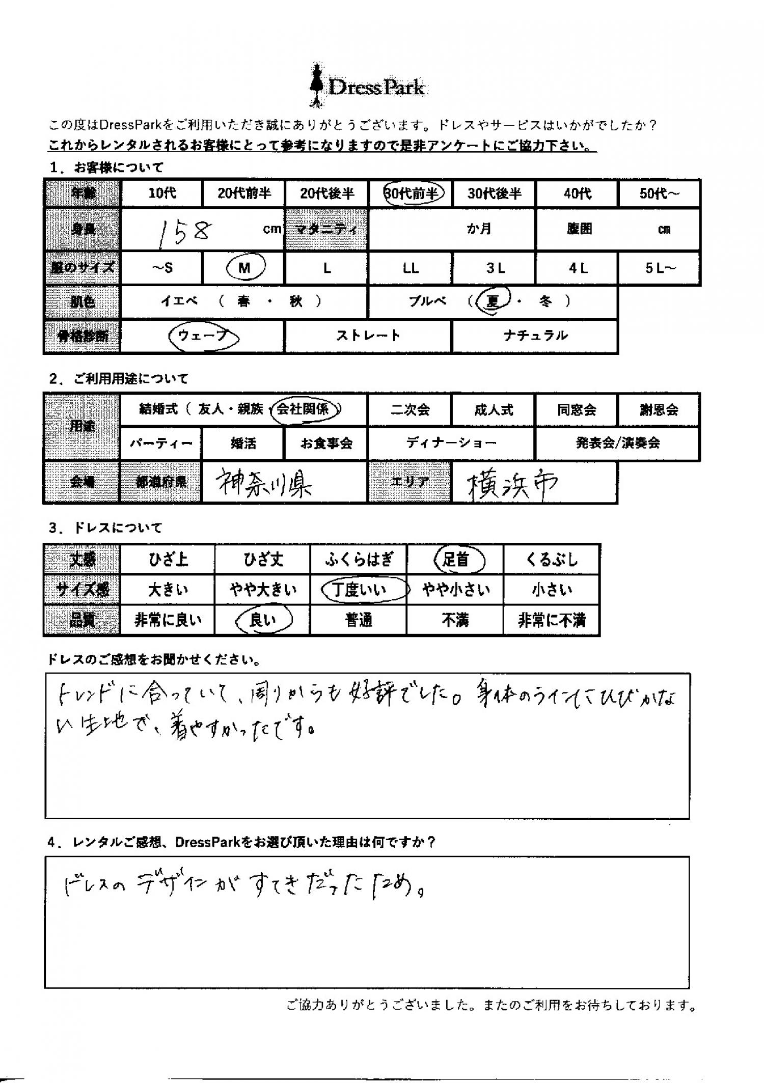 神奈川県 K.H様158㎝ Mサイズ横浜・みなとみらい #30代#M/L#155~159㎝#結婚式(会社関係)#神奈川県#横浜・みなとみらい ◆レンタルしたドレスはこちら ◆レンタルしたサイズは:M ◆レンタルした日付:2025/11/22 ドレスの着用感 ◆点数: (4点) ◆丈感:足首 ◆サイズ感:丁度いい ◆品質:良い ◆肌色:ブルべ ◆骨格診断:ウェーブ ドレスの感想 トレンドに合っていて、周りからも好評でした。体のラインに響かない生地できやすかったです。 レンタルのご感想、DressParkをお選び頂いた理由 ドレスのデザインが素敵だったため。 CUSTOMER REVIEWS お客様の声 気になるカテゴリー別にご利用の感想をチェック! ◆AGE 年代で見る 10代 20代 30代 40代 50代~ ◆SIZE サイズで見る SS/S M/L 大きいサイズLL~ ◆HIGHT 身長で見る 140~149㎝ 150~154㎝ 155~159㎝ 160~164㎝ 165~169㎝ 170㎝以上 ◆マタニティ ~3か月 4~6か月 7~8か月 9~10か月 ◆肌色 イエベ ブルべ ◆骨格診断 ウェーブ ストレート ナチュラル ◆利用シーン 結婚式(友人) 結婚式(親族) 結婚式(会社関係) 二次会 成人式 謝恩会 パーティー その他 CUSTOMER REVIEWS都道府県別お客様の声 都道府県別にのお客様の声をチェック! 北海道 青森県 岩手県 宮城県 秋田県 山形県 福島県 茨城県 栃木県 群馬県 埼玉県 千葉県 東京都 神奈川県 新潟県 富山県 石川県 福井県 山梨県 長野県 岐阜県 静岡県 愛知県 三重県 滋賀県 京都府 大阪府 兵庫県 奈良県 和歌山県 鳥取県 島根県 岡山県 広島県 山口県 徳島県 香川県 愛媛県 高知県 福岡県 佐賀県 長崎県 熊本県 大分県 宮崎県 鹿児島県 沖縄県 CUSTOMER REVIEWSエリア別お客様の声 都道府県別にのお客様の声をチェック! 札幌 仙台 名古屋 軽井沢 金沢 神戸・芦屋 博多 那覇 梅田・新大阪 難波・心斎橋 鎌倉・湘南 横浜・みなとみらい 舞浜・浦安・幕張 大宮・浦和 青山・表参道 六本木・麻布 渋谷・恵比寿 新宿 池袋 銀座・丸の内 お台場・汐留 鹿児島市 郡山市 福島市 東予 甲府・石和 LINEでお問い合わせ このサイトではJavaScriptを使用しています