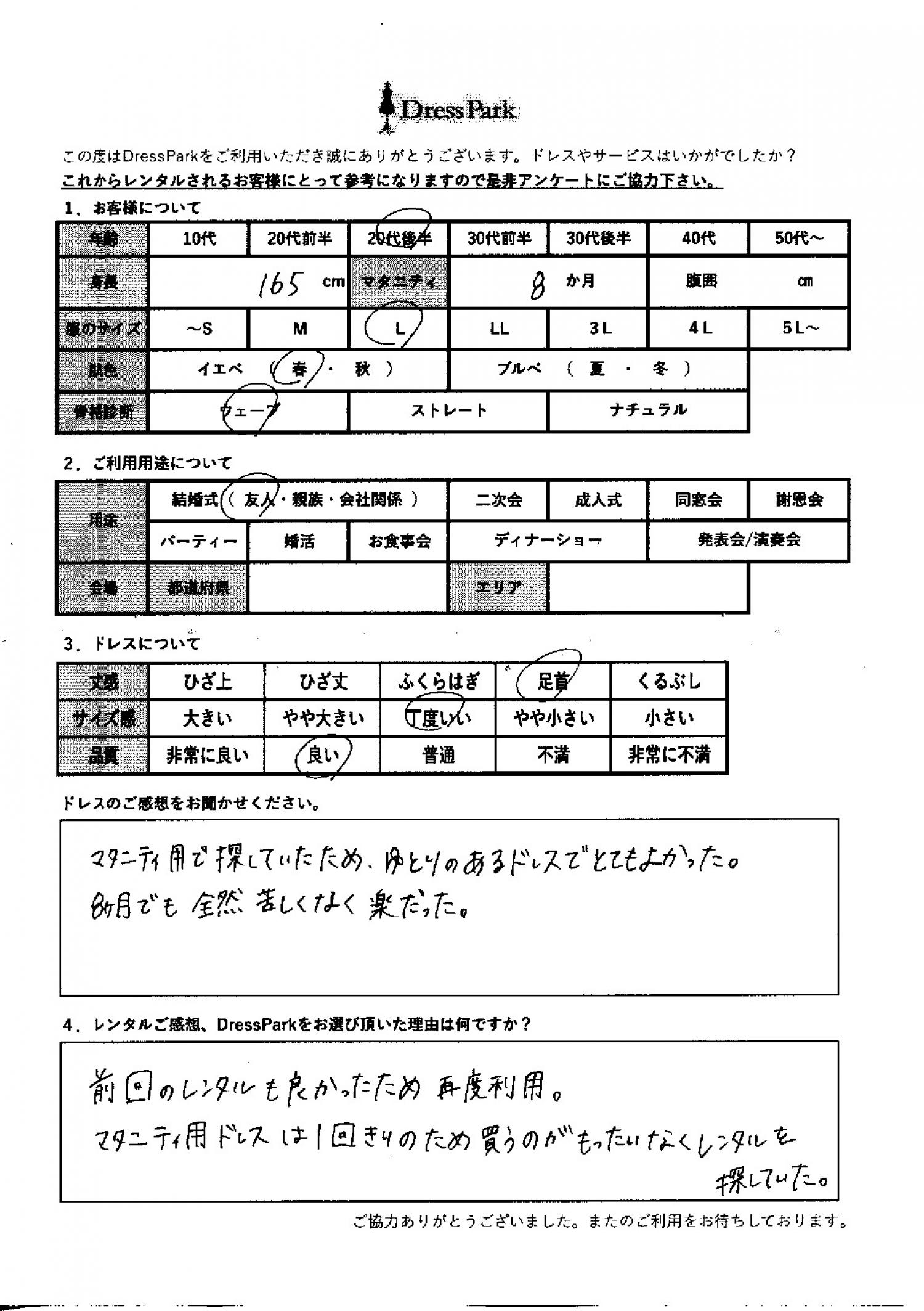 神奈川県 R.T様165㎝ Lサイズ マタニティ #20代#M/L#165~169㎝#結婚式(友人)#神奈川県 ◆レンタルしたドレスはこちら ◆レンタルしたサイズは:L ◆レンタルした日付:2025/11/22 ドレスの着用感 ◆点数: (4点) ◆丈感:足首 ◆サイズ感:丁度いい ◆品質:良い ◆マタニティ: ◆肌色:イエベ ◆骨格診断:ウェーブ ドレスの感想 マタニティー用で探していたため、ゆとりのあるドレスでとても良かった。8ヶ月でも全然苦しくなく楽だった。 レンタルのご感想、DressParkをお選び頂いた理由 前回のレンタルも良かったため再度利用。マタニティー用ドレスは一回切りのため買うのがもったいなくレンタルを探していた。 CUSTOMER REVIEWS お客様の声 気になるカテゴリー別にご利用の感想をチェック! ◆AGE 年代で見る 10代 20代 30代 40代 50代~ ◆SIZE サイズで見る SS/S M/L 大きいサイズLL~ ◆HIGHT 身長で見る 140~149㎝ 150~154㎝ 155~159㎝ 160~164㎝ 165~169㎝ 170㎝以上 ◆マタニティ ~3か月 4~6か月 7~8か月 9~10か月 ◆肌色 イエベ ブルべ ◆骨格診断 ウェーブ ストレート ナチュラル ◆利用シーン 結婚式(友人) 結婚式(親族) 結婚式(会社関係) 二次会 成人式 謝恩会 パーティー その他 CUSTOMER REVIEWS都道府県別お客様の声 都道府県別にのお客様の声をチェック! 北海道 青森県 岩手県 宮城県 秋田県 山形県 福島県 茨城県 栃木県 群馬県 埼玉県 千葉県 東京都 神奈川県 新潟県 富山県 石川県 福井県 山梨県 長野県 岐阜県 静岡県 愛知県 三重県 滋賀県 京都府 大阪府 兵庫県 奈良県 和歌山県 鳥取県 島根県 岡山県 広島県 山口県 徳島県 香川県 愛媛県 高知県 福岡県 佐賀県 長崎県 熊本県 大分県 宮崎県 鹿児島県 沖縄県 CUSTOMER REVIEWSエリア別お客様の声 都道府県別にのお客様の声をチェック! 札幌 仙台 名古屋 軽井沢 金沢 神戸・芦屋 博多 那覇 梅田・新大阪 難波・心斎橋 鎌倉・湘南 横浜・みなとみらい 舞浜・浦安・幕張 大宮・浦和 青山・表参道 六本木・麻布 渋谷・恵比寿 新宿 池袋 銀座・丸の内 お台場・汐留 鹿児島市 郡山市 福島市 東予 甲府・石和 LINEでお問い合わせ このサイトではJavaScriptを使用しています