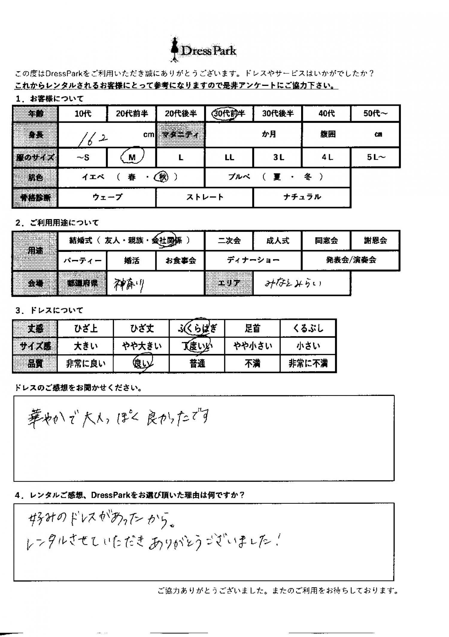 神奈川県 Y.I様162㎝ Mサイズ横浜・みなとみらい #30代#M/L#160~164㎝#結婚式(会社関係)#神奈川県#横浜・みなとみらい ◆レンタルしたドレスはこちら ◆レンタルしたサイズは:M ◆レンタルした日付:2025/11/22 ドレスの着用感 ◆点数: (4点) ◆丈感:ふくらはぎ ◆サイズ感:丁度いい ◆品質:良い ◆肌色:イエベ ドレスの感想 華やかで大人っぽくよかったです。 レンタルのご感想、DressParkをお選び頂いた理由 好みのドレスがあったから。レンタルさせていただきありがとうございました! CUSTOMER REVIEWS お客様の声 気になるカテゴリー別にご利用の感想をチェック! ◆AGE 年代で見る 10代 20代 30代 40代 50代~ ◆SIZE サイズで見る SS/S M/L 大きいサイズLL~ ◆HIGHT 身長で見る 140~149㎝ 150~154㎝ 155~159㎝ 160~164㎝ 165~169㎝ 170㎝以上 ◆マタニティ ~3か月 4~6か月 7~8か月 9~10か月 ◆肌色 イエベ ブルべ ◆骨格診断 ウェーブ ストレート ナチュラル ◆利用シーン 結婚式(友人) 結婚式(親族) 結婚式(会社関係) 二次会 成人式 謝恩会 パーティー その他 CUSTOMER REVIEWS都道府県別お客様の声 都道府県別にのお客様の声をチェック! 北海道 青森県 岩手県 宮城県 秋田県 山形県 福島県 茨城県 栃木県 群馬県 埼玉県 千葉県 東京都 神奈川県 新潟県 富山県 石川県 福井県 山梨県 長野県 岐阜県 静岡県 愛知県 三重県 滋賀県 京都府 大阪府 兵庫県 奈良県 和歌山県 鳥取県 島根県 岡山県 広島県 山口県 徳島県 香川県 愛媛県 高知県 福岡県 佐賀県 長崎県 熊本県 大分県 宮崎県 鹿児島県 沖縄県 CUSTOMER REVIEWSエリア別お客様の声 都道府県別にのお客様の声をチェック! 札幌 仙台 名古屋 軽井沢 金沢 神戸・芦屋 博多 那覇 梅田・新大阪 難波・心斎橋 鎌倉・湘南 横浜・みなとみらい 舞浜・浦安・幕張 大宮・浦和 青山・表参道 六本木・麻布 渋谷・恵比寿 新宿 池袋 銀座・丸の内 お台場・汐留 鹿児島市 郡山市 福島市 東予 甲府・石和 LINEでお問い合わせ このサイトではJavaScriptを使用しています
