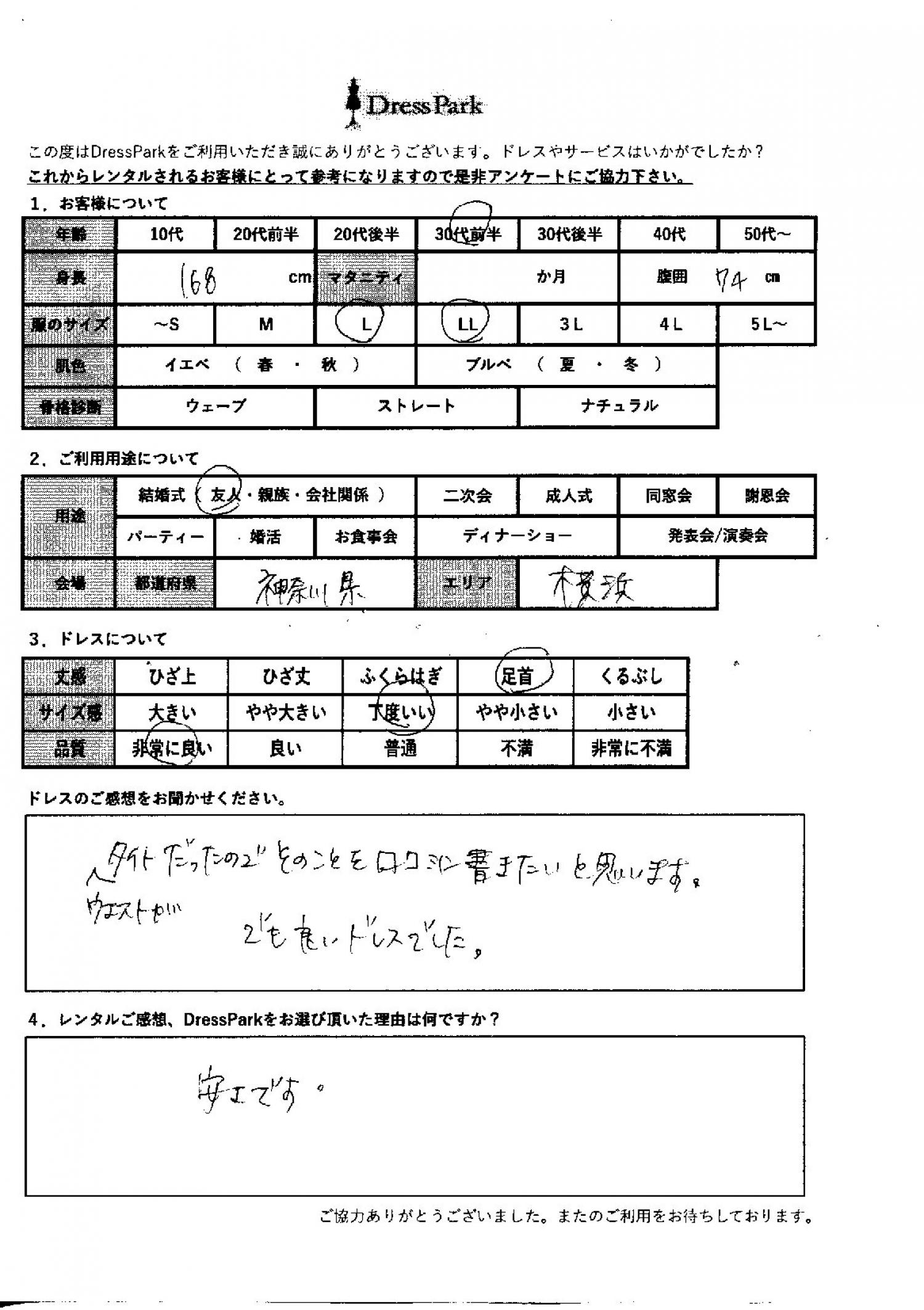 神奈川県 R.N様168㎝ Lサイズ横浜・みなとみらい #30代#M/L#165~169㎝#結婚式(友人)#神奈川県#横浜・みなとみらい ◆レンタルしたドレスはこちら ◆レンタルしたサイズは:L ◆レンタルした日付:2025/11/21 ドレスの着用感 ◆点数: (5点) ◆丈感:足首 ◆サイズ感:丁度いい ◆品質:非常に良い ドレスの感想 ウェストがタイトだったので、そこを口コミに書きたいと思います。でも良いドレスでした。 レンタルのご感想、DressParkをお選び頂いた理由 安さです。 CUSTOMER REVIEWS お客様の声 気になるカテゴリー別にご利用の感想をチェック! ◆AGE 年代で見る 10代 20代 30代 40代 50代~ ◆SIZE サイズで見る SS/S M/L 大きいサイズLL~ ◆HIGHT 身長で見る 140~149㎝ 150~154㎝ 155~159㎝ 160~164㎝ 165~169㎝ 170㎝以上 ◆マタニティ ~3か月 4~6か月 7~8か月 9~10か月 ◆肌色 イエベ ブルべ ◆骨格診断 ウェーブ ストレート ナチュラル ◆利用シーン 結婚式(友人) 結婚式(親族) 結婚式(会社関係) 二次会 成人式 謝恩会 パーティー その他 CUSTOMER REVIEWS都道府県別お客様の声 都道府県別にのお客様の声をチェック! 北海道 青森県 岩手県 宮城県 秋田県 山形県 福島県 茨城県 栃木県 群馬県 埼玉県 千葉県 東京都 神奈川県 新潟県 富山県 石川県 福井県 山梨県 長野県 岐阜県 静岡県 愛知県 三重県 滋賀県 京都府 大阪府 兵庫県 奈良県 和歌山県 鳥取県 島根県 岡山県 広島県 山口県 徳島県 香川県 愛媛県 高知県 福岡県 佐賀県 長崎県 熊本県 大分県 宮崎県 鹿児島県 沖縄県 CUSTOMER REVIEWSエリア別お客様の声 都道府県別にのお客様の声をチェック! 札幌 仙台 名古屋 軽井沢 金沢 神戸・芦屋 博多 那覇 梅田・新大阪 難波・心斎橋 鎌倉・湘南 横浜・みなとみらい 舞浜・浦安・幕張 大宮・浦和 青山・表参道 六本木・麻布 渋谷・恵比寿 新宿 池袋 銀座・丸の内 お台場・汐留 鹿児島市 郡山市 福島市 東予 甲府・石和 LINEでお問い合わせ このサイトではJavaScriptを使用しています