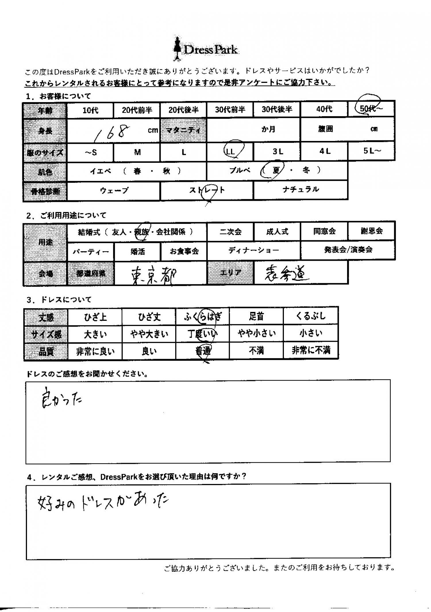 東京都 E.O様168㎝ LLサイズ青山・表参道 #50代~#大きいサイズLL~#165~169㎝#結婚式(親族)#東京都#青山・表参道 ◆レンタルしたドレスはこちら ◆レンタルしたサイズは:LL ◆レンタルした日付:2025/11/22 ドレスの着用感 ◆点数: (4点) ◆丈感:ふくらはぎ ◆サイズ感:丁度いい ◆品質:普通 ◆肌色:ブルべ ◆骨格診断:ストレート ドレスの感想 よかった。 レンタルのご感想、DressParkをお選び頂いた理由 好みのドレスがあった。 CUSTOMER REVIEWS お客様の声 気になるカテゴリー別にご利用の感想をチェック! ◆AGE 年代で見る 10代 20代 30代 40代 50代~ ◆SIZE サイズで見る SS/S M/L 大きいサイズLL~ ◆HIGHT 身長で見る 140~149㎝ 150~154㎝ 155~159㎝ 160~164㎝ 165~169㎝ 170㎝以上 ◆マタニティ ~3か月 4~6か月 7~8か月 9~10か月 ◆肌色 イエベ ブルべ ◆骨格診断 ウェーブ ストレート ナチュラル ◆利用シーン 結婚式(友人) 結婚式(親族) 結婚式(会社関係) 二次会 成人式 謝恩会 パーティー その他 CUSTOMER REVIEWS都道府県別お客様の声 都道府県別にのお客様の声をチェック! 北海道 青森県 岩手県 宮城県 秋田県 山形県 福島県 茨城県 栃木県 群馬県 埼玉県 千葉県 東京都 神奈川県 新潟県 富山県 石川県 福井県 山梨県 長野県 岐阜県 静岡県 愛知県 三重県 滋賀県 京都府 大阪府 兵庫県 奈良県 和歌山県 鳥取県 島根県 岡山県 広島県 山口県 徳島県 香川県 愛媛県 高知県 福岡県 佐賀県 長崎県 熊本県 大分県 宮崎県 鹿児島県 沖縄県 CUSTOMER REVIEWSエリア別お客様の声 都道府県別にのお客様の声をチェック! 札幌 仙台 名古屋 軽井沢 金沢 神戸・芦屋 博多 那覇 梅田・新大阪 難波・心斎橋 鎌倉・湘南 横浜・みなとみらい 舞浜・浦安・幕張 大宮・浦和 青山・表参道 六本木・麻布 渋谷・恵比寿 新宿 池袋 銀座・丸の内 お台場・汐留 鹿児島市 郡山市 福島市 東予 甲府・石和 LINEでお問い合わせ このサイトではJavaScriptを使用しています