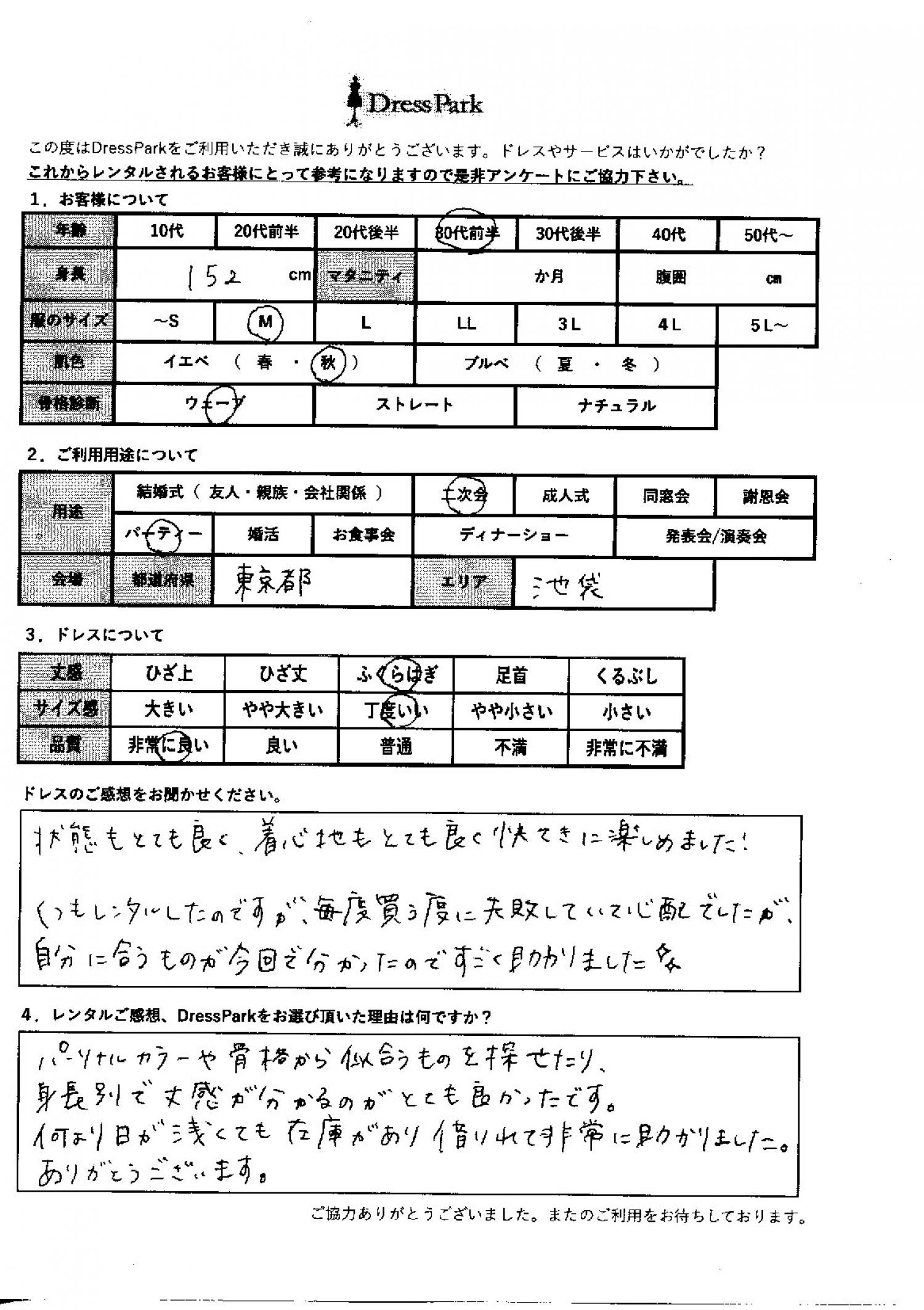 東京都 M.S様152㎝ Mサイズ池袋 #30代#M/L#150~154㎝#二次会#東京都#池袋 ◆レンタルしたドレスはこちら ◆レンタルしたサイズは:M ◆レンタルした日付:2025/11/22 ドレスの着用感 ◆点数: (5点) ◆丈感:ふくらはぎ ◆サイズ感:丁度いい ◆品質:非常に良い ◆肌色:イエベ ◆骨格診断:ウェーブ ドレスの感想 状態もとても良く、着心地もとても良く、快適に楽しめました!靴もレンタルしたのですが、毎度買うたびに失敗していて心配でしたが、自分に合うものが今回でわかったので、すごく助かりました。 レンタルのご感想、DressParkをお選び頂いた理由 パーソナルカラーや骨格から似合うものを探せたり、身長別で丈感がわかるのがとても良かったです。何より日が浅くても在庫があり、借りれて非常に助かりました。ありがとうございます。 CUSTOMER REVIEWS お客様の声 気になるカテゴリー別にご利用の感想をチェック! ◆AGE 年代で見る 10代 20代 30代 40代 50代~ ◆SIZE サイズで見る SS/S M/L 大きいサイズLL~ ◆HIGHT 身長で見る 140~149㎝ 150~154㎝ 155~159㎝ 160~164㎝ 165~169㎝ 170㎝以上 ◆マタニティ ~3か月 4~6か月 7~8か月 9~10か月 ◆肌色 イエベ ブルべ ◆骨格診断 ウェーブ ストレート ナチュラル ◆利用シーン 結婚式(友人) 結婚式(親族) 結婚式(会社関係) 二次会 成人式 謝恩会 パーティー その他 CUSTOMER REVIEWS都道府県別お客様の声 都道府県別にのお客様の声をチェック! 北海道 青森県 岩手県 宮城県 秋田県 山形県 福島県 茨城県 栃木県 群馬県 埼玉県 千葉県 東京都 神奈川県 新潟県 富山県 石川県 福井県 山梨県 長野県 岐阜県 静岡県 愛知県 三重県 滋賀県 京都府 大阪府 兵庫県 奈良県 和歌山県 鳥取県 島根県 岡山県 広島県 山口県 徳島県 香川県 愛媛県 高知県 福岡県 佐賀県 長崎県 熊本県 大分県 宮崎県 鹿児島県 沖縄県 CUSTOMER REVIEWSエリア別お客様の声 都道府県別にのお客様の声をチェック! 札幌 仙台 名古屋 軽井沢 金沢 神戸・芦屋 博多 那覇 梅田・新大阪 難波・心斎橋 鎌倉・湘南 横浜・みなとみらい 舞浜・浦安・幕張 大宮・浦和 青山・表参道 六本木・麻布 渋谷・恵比寿 新宿 池袋 銀座・丸の内 お台場・汐留 鹿児島市 郡山市 福島市 東予 甲府・石和 LINEでお問い合わせ このサイトではJavaScriptを使用しています