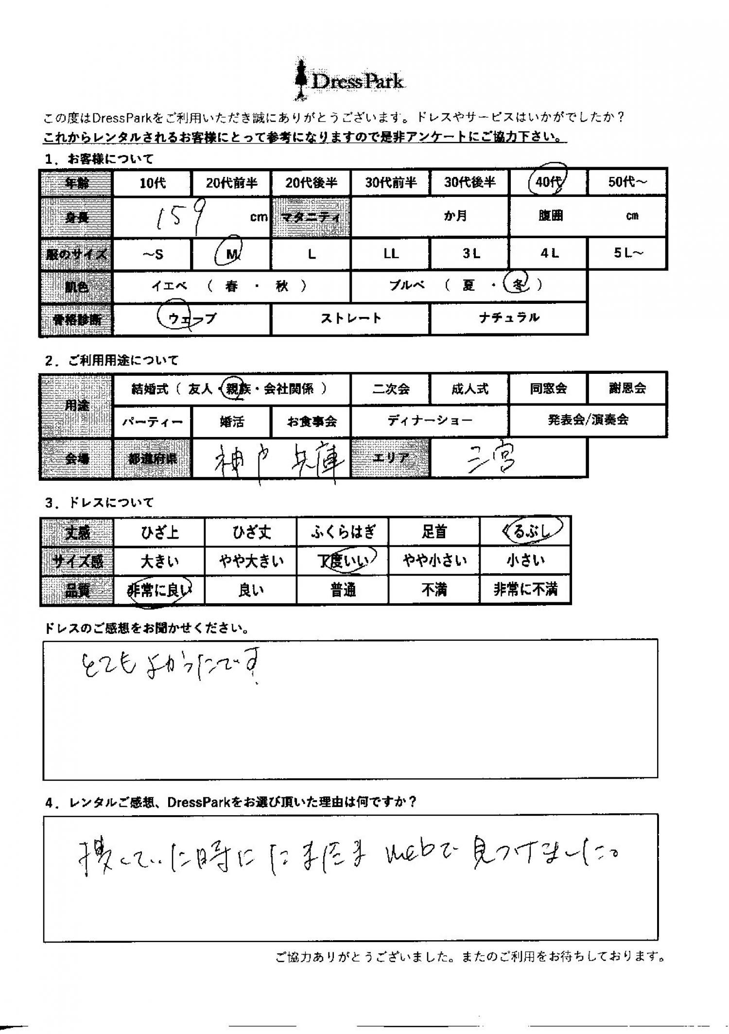 兵庫県 R.M様159㎝ Mサイズ神戸・芦屋 #40代#M/L#155~159㎝#結婚式(親族)#兵庫県#神戸・芦屋 ◆レンタルしたドレスはこちら ◆レンタルしたサイズは:M ◆レンタルした日付:2025/11/22 ドレスの着用感 ◆点数: (5点) ◆丈感:くるぶし ◆サイズ感:丁度いい ◆品質:非常に良い ◆肌色:ブルべ ◆骨格診断:ウェーブ ドレスの感想 とても良かったです。 レンタルのご感想、DressParkをお選び頂いた理由 探していた時にたまたまウェブで見つけました。 CUSTOMER REVIEWS お客様の声 気になるカテゴリー別にご利用の感想をチェック! ◆AGE 年代で見る 10代 20代 30代 40代 50代~ ◆SIZE サイズで見る SS/S M/L 大きいサイズLL~ ◆HIGHT 身長で見る 140~149㎝ 150~154㎝ 155~159㎝ 160~164㎝ 165~169㎝ 170㎝以上 ◆マタニティ ~3か月 4~6か月 7~8か月 9~10か月 ◆肌色 イエベ ブルべ ◆骨格診断 ウェーブ ストレート ナチュラル ◆利用シーン 結婚式(友人) 結婚式(親族) 結婚式(会社関係) 二次会 成人式 謝恩会 パーティー その他 CUSTOMER REVIEWS都道府県別お客様の声 都道府県別にのお客様の声をチェック! 北海道 青森県 岩手県 宮城県 秋田県 山形県 福島県 茨城県 栃木県 群馬県 埼玉県 千葉県 東京都 神奈川県 新潟県 富山県 石川県 福井県 山梨県 長野県 岐阜県 静岡県 愛知県 三重県 滋賀県 京都府 大阪府 兵庫県 奈良県 和歌山県 鳥取県 島根県 岡山県 広島県 山口県 徳島県 香川県 愛媛県 高知県 福岡県 佐賀県 長崎県 熊本県 大分県 宮崎県 鹿児島県 沖縄県 CUSTOMER REVIEWSエリア別お客様の声 都道府県別にのお客様の声をチェック! 札幌 仙台 名古屋 軽井沢 金沢 神戸・芦屋 博多 那覇 梅田・新大阪 難波・心斎橋 鎌倉・湘南 横浜・みなとみらい 舞浜・浦安・幕張 大宮・浦和 青山・表参道 六本木・麻布 渋谷・恵比寿 新宿 池袋 銀座・丸の内 お台場・汐留 鹿児島市 郡山市 福島市 東予 甲府・石和 LINEでお問い合わせ このサイトではJavaScriptを使用しています
