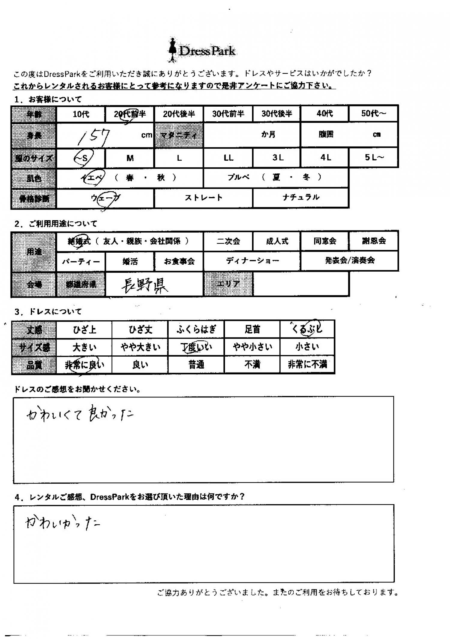 長野県 R.K様157㎝ ~Sサイズ #20代#SS/S#155~159㎝#結婚式(友人)#長野県 ◆レンタルしたドレスはこちら ◆レンタルしたサイズは:S ◆レンタルした日付:2025/11/17 ドレスの着用感 ◆点数: (5点) ◆丈感:くるぶし ◆サイズ感:丁度いい ◆品質:非常に良い ◆肌色:イエベ ◆骨格診断:ウェーブ ドレスの感想 可愛くてよかった。 レンタルのご感想、DressParkをお選び頂いた理由 可愛かった。 CUSTOMER REVIEWS お客様の声 気になるカテゴリー別にご利用の感想をチェック! ◆AGE 年代で見る 10代 20代 30代 40代 50代~ ◆SIZE サイズで見る SS/S M/L 大きいサイズLL~ ◆HIGHT 身長で見る 140~149㎝ 150~154㎝ 155~159㎝ 160~164㎝ 165~169㎝ 170㎝以上 ◆マタニティ ~3か月 4~6か月 7~8か月 9~10か月 ◆肌色 イエベ ブルべ ◆骨格診断 ウェーブ ストレート ナチュラル ◆利用シーン 結婚式(友人) 結婚式(親族) 結婚式(会社関係) 二次会 成人式 謝恩会 パーティー その他 CUSTOMER REVIEWS都道府県別お客様の声 都道府県別にのお客様の声をチェック! 北海道 青森県 岩手県 宮城県 秋田県 山形県 福島県 茨城県 栃木県 群馬県 埼玉県 千葉県 東京都 神奈川県 新潟県 富山県 石川県 福井県 山梨県 長野県 岐阜県 静岡県 愛知県 三重県 滋賀県 京都府 大阪府 兵庫県 奈良県 和歌山県 鳥取県 島根県 岡山県 広島県 山口県 徳島県 香川県 愛媛県 高知県 福岡県 佐賀県 長崎県 熊本県 大分県 宮崎県 鹿児島県 沖縄県 CUSTOMER REVIEWSエリア別お客様の声 都道府県別にのお客様の声をチェック! 札幌 仙台 名古屋 軽井沢 金沢 神戸・芦屋 博多 那覇 梅田・新大阪 難波・心斎橋 鎌倉・湘南 横浜・みなとみらい 舞浜・浦安・幕張 大宮・浦和 青山・表参道 六本木・麻布 渋谷・恵比寿 新宿 池袋 銀座・丸の内 お台場・汐留 鹿児島市 郡山市 福島市 東予 甲府・石和 LINEでお問い合わせ このサイトではJavaScriptを使用しています