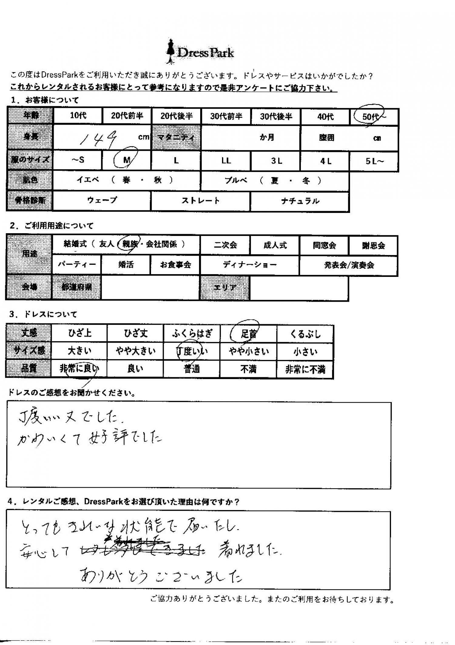 愛知県 T.F様149㎝ Mサイズ #50代~#M/L#140~149㎝#結婚式(親族)#愛知県 ◆レンタルしたドレスはこちら ◆レンタルしたサイズは:M ◆レンタルした日付:2025/11/16 ドレスの着用感 ◆点数: (5点) ◆丈感:足首 ◆サイズ感:丁度いい ◆品質:非常に良い ドレスの感想 ちょうどでした。可愛くて好評でした。 レンタルのご感想、DressParkをお選び頂いた理由 とってもきれいな状態で届いたし、安心して着られました。ありがとうございました。 CUSTOMER REVIEWS お客様の声 気になるカテゴリー別にご利用の感想をチェック! ◆AGE 年代で見る 10代 20代 30代 40代 50代~ ◆SIZE サイズで見る SS/S M/L 大きいサイズLL~ ◆HIGHT 身長で見る 140~149㎝ 150~154㎝ 155~159㎝ 160~164㎝ 165~169㎝ 170㎝以上 ◆マタニティ ~3か月 4~6か月 7~8か月 9~10か月 ◆肌色 イエベ ブルべ ◆骨格診断 ウェーブ ストレート ナチュラル ◆利用シーン 結婚式(友人) 結婚式(親族) 結婚式(会社関係) 二次会 成人式 謝恩会 パーティー その他 CUSTOMER REVIEWS都道府県別お客様の声 都道府県別にのお客様の声をチェック! 北海道 青森県 岩手県 宮城県 秋田県 山形県 福島県 茨城県 栃木県 群馬県 埼玉県 千葉県 東京都 神奈川県 新潟県 富山県 石川県 福井県 山梨県 長野県 岐阜県 静岡県 愛知県 三重県 滋賀県 京都府 大阪府 兵庫県 奈良県 和歌山県 鳥取県 島根県 岡山県 広島県 山口県 徳島県 香川県 愛媛県 高知県 福岡県 佐賀県 長崎県 熊本県 大分県 宮崎県 鹿児島県 沖縄県 CUSTOMER REVIEWSエリア別お客様の声 都道府県別にのお客様の声をチェック! 札幌 仙台 名古屋 軽井沢 金沢 神戸・芦屋 博多 那覇 梅田・新大阪 難波・心斎橋 鎌倉・湘南 横浜・みなとみらい 舞浜・浦安・幕張 大宮・浦和 青山・表参道 六本木・麻布 渋谷・恵比寿 新宿 池袋 銀座・丸の内 お台場・汐留 鹿児島市 郡山市 福島市 東予 甲府・石和 LINEでお問い合わせ このサイトではJavaScriptを使用しています