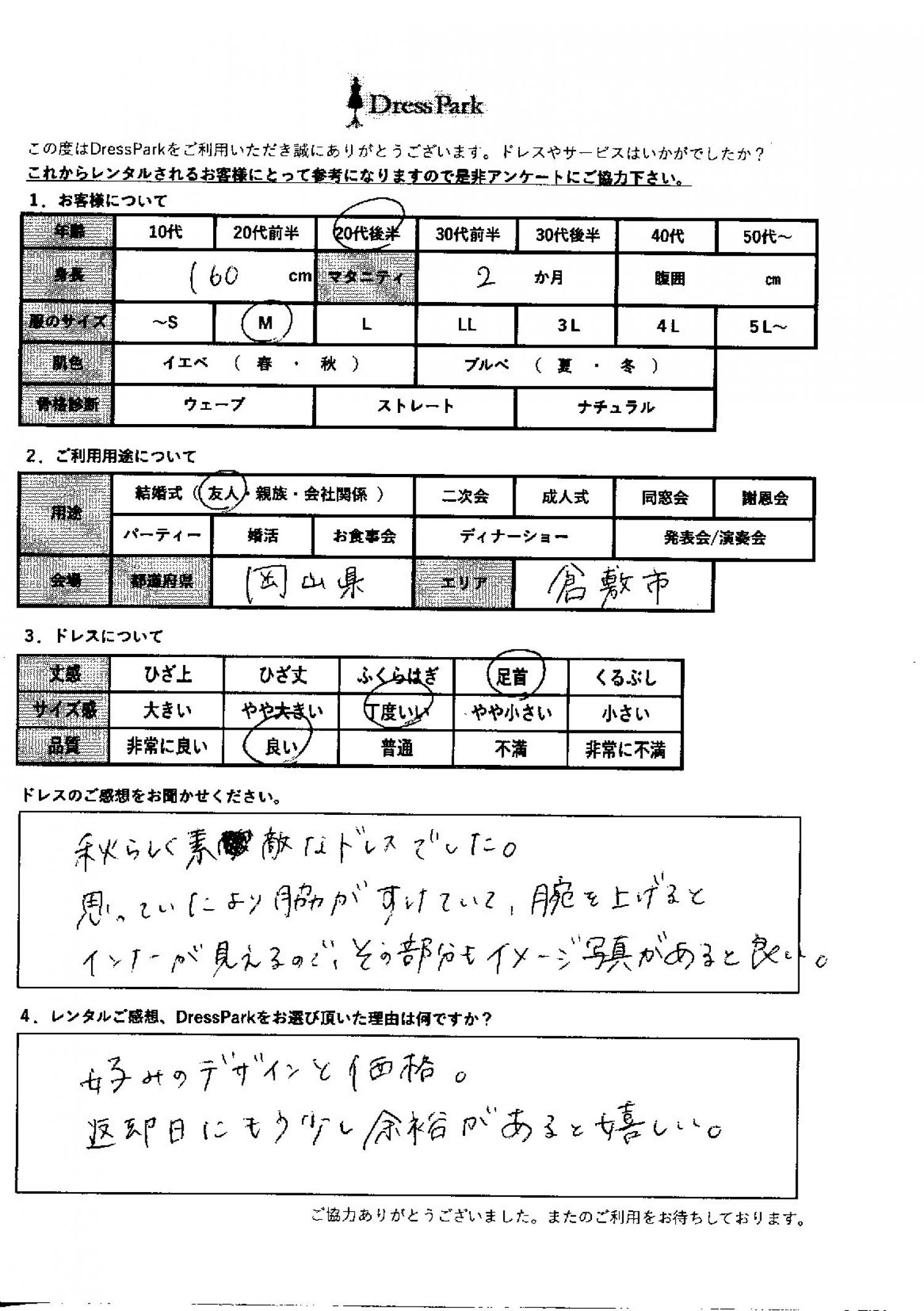 岡山県 M.I様160㎝ Mサイズ マタニティ #20代#M/L#160~164㎝#結婚式(友人)#岡山県 ◆レンタルしたドレスはこちら ◆レンタルしたサイズは:M ◆レンタルした日付:2025/11/16 ドレスの着用感 ◆点数: (4点) ◆丈感:足首 ◆サイズ感:丁度いい ◆品質:良い ◆マタニティ: ドレスの感想 秋らしく素敵なドレスでした。思っていたより脇が透けていて、腕を上げるとインナーが見えるので、その部分もイメージ写真があると良い。 レンタルのご感想、DressParkをお選び頂いた理由 好みのデザインと価格。返却日にもう少し余裕があると嬉しい。 CUSTOMER REVIEWS お客様の声 気になるカテゴリー別にご利用の感想をチェック! ◆AGE 年代で見る 10代 20代 30代 40代 50代~ ◆SIZE サイズで見る SS/S M/L 大きいサイズLL~ ◆HIGHT 身長で見る 140~149㎝ 150~154㎝ 155~159㎝ 160~164㎝ 165~169㎝ 170㎝以上 ◆マタニティ ~3か月 4~6か月 7~8か月 9~10か月 ◆肌色 イエベ ブルべ ◆骨格診断 ウェーブ ストレート ナチュラル ◆利用シーン 結婚式(友人) 結婚式(親族) 結婚式(会社関係) 二次会 成人式 謝恩会 パーティー その他 CUSTOMER REVIEWS都道府県別お客様の声 都道府県別にのお客様の声をチェック! 北海道 青森県 岩手県 宮城県 秋田県 山形県 福島県 茨城県 栃木県 群馬県 埼玉県 千葉県 東京都 神奈川県 新潟県 富山県 石川県 福井県 山梨県 長野県 岐阜県 静岡県 愛知県 三重県 滋賀県 京都府 大阪府 兵庫県 奈良県 和歌山県 鳥取県 島根県 岡山県 広島県 山口県 徳島県 香川県 愛媛県 高知県 福岡県 佐賀県 長崎県 熊本県 大分県 宮崎県 鹿児島県 沖縄県 CUSTOMER REVIEWSエリア別お客様の声 都道府県別にのお客様の声をチェック! 札幌 仙台 名古屋 軽井沢 金沢 神戸・芦屋 博多 那覇 梅田・新大阪 難波・心斎橋 鎌倉・湘南 横浜・みなとみらい 舞浜・浦安・幕張 大宮・浦和 青山・表参道 六本木・麻布 渋谷・恵比寿 新宿 池袋 銀座・丸の内 お台場・汐留 鹿児島市 郡山市 福島市 東予 甲府・石和 LINEでお問い合わせ このサイトではJavaScriptを使用しています
