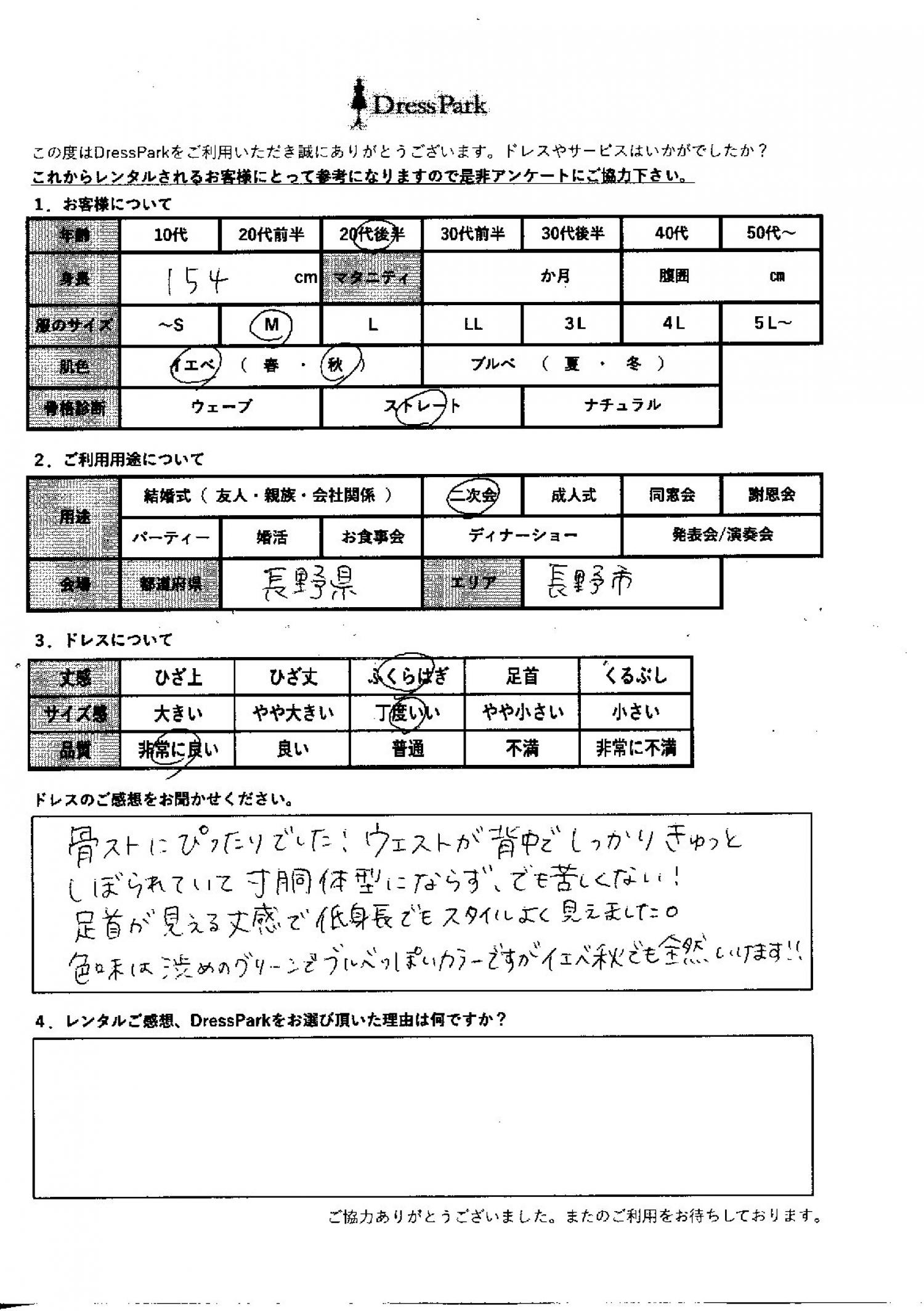 長野県 N.T様154㎝ Mサイズ #20代#M/L#150~154㎝#二次会#長野県 ◆レンタルしたドレスはこちら ◆レンタルしたサイズは:M ◆レンタルした日付:2025/11/18 ドレスの着用感 ◆点数: (5点) ◆丈感:ふくらはぎ ◆サイズ感:丁度いい ◆品質:非常に良い ◆肌色:イエベ ◆骨格診断:ストレート ドレスの感想 骨格ストレートにぴったりでした!ウェストが背中でしっかりきゅっと絞られていて、寸胴体型にならず、でも苦しくない!足首が見える丈感で、低身長でもスタイルよく見えました。色味は渋めのグリーンでブルベっぽいカラーですが、イエベ秋でも全然いけます! CUSTOMER REVIEWS お客様の声 気になるカテゴリー別にご利用の感想をチェック! ◆AGE 年代で見る 10代 20代 30代 40代 50代~ ◆SIZE サイズで見る SS/S M/L 大きいサイズLL~ ◆HIGHT 身長で見る 140~149㎝ 150~154㎝ 155~159㎝ 160~164㎝ 165~169㎝ 170㎝以上 ◆マタニティ ~3か月 4~6か月 7~8か月 9~10か月 ◆肌色 イエベ ブルべ ◆骨格診断 ウェーブ ストレート ナチュラル ◆利用シーン 結婚式(友人) 結婚式(親族) 結婚式(会社関係) 二次会 成人式 謝恩会 パーティー その他 CUSTOMER REVIEWS都道府県別お客様の声 都道府県別にのお客様の声をチェック! 北海道 青森県 岩手県 宮城県 秋田県 山形県 福島県 茨城県 栃木県 群馬県 埼玉県 千葉県 東京都 神奈川県 新潟県 富山県 石川県 福井県 山梨県 長野県 岐阜県 静岡県 愛知県 三重県 滋賀県 京都府 大阪府 兵庫県 奈良県 和歌山県 鳥取県 島根県 岡山県 広島県 山口県 徳島県 香川県 愛媛県 高知県 福岡県 佐賀県 長崎県 熊本県 大分県 宮崎県 鹿児島県 沖縄県 CUSTOMER REVIEWSエリア別お客様の声 都道府県別にのお客様の声をチェック! 札幌 仙台 名古屋 軽井沢 金沢 神戸・芦屋 博多 那覇 梅田・新大阪 難波・心斎橋 鎌倉・湘南 横浜・みなとみらい 舞浜・浦安・幕張 大宮・浦和 青山・表参道 六本木・麻布 渋谷・恵比寿 新宿 池袋 銀座・丸の内 お台場・汐留 鹿児島市 郡山市 福島市 東予 甲府・石和 LINEでお問い合わせ このサイトではJavaScriptを使用しています