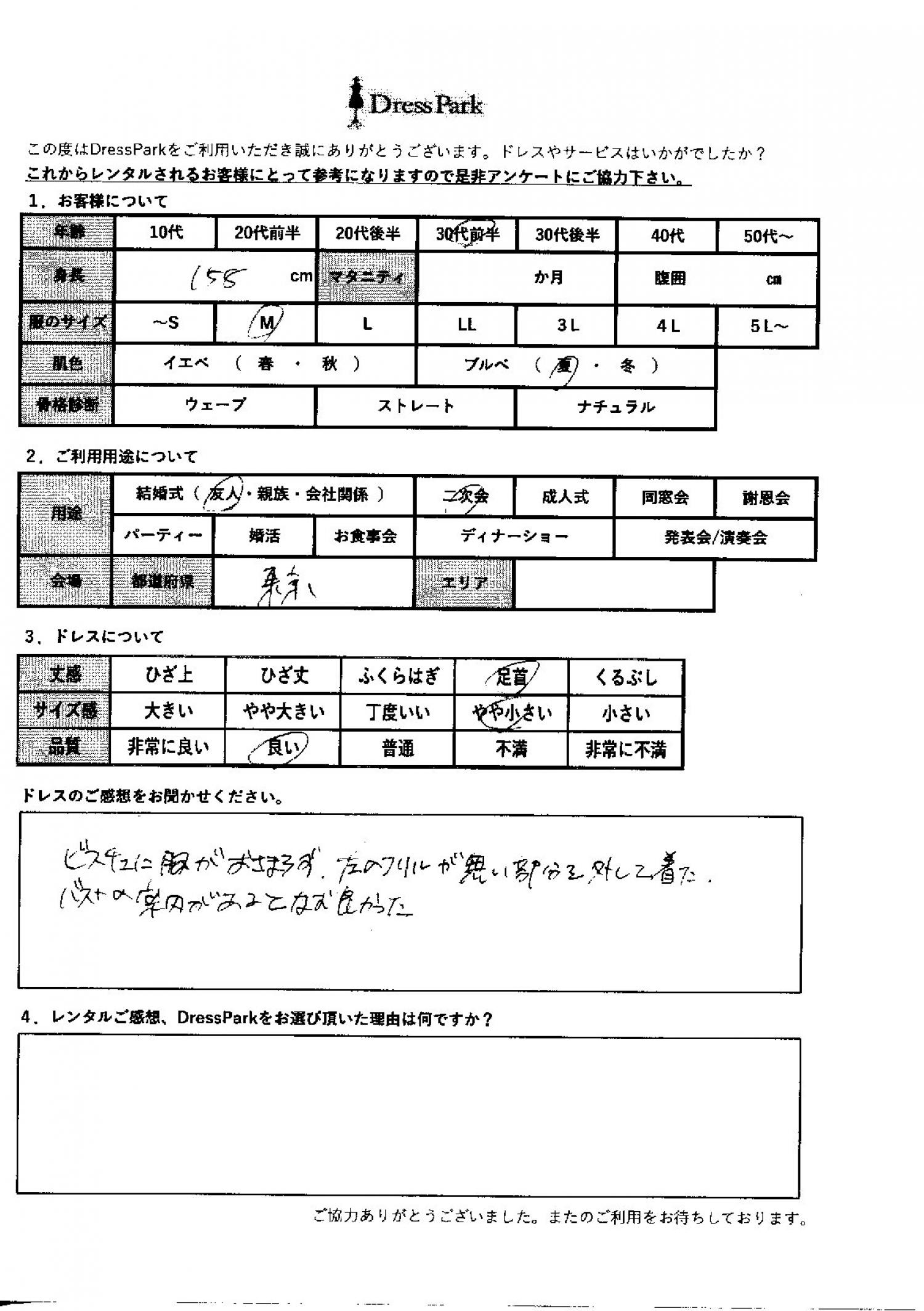 東京都 A.N様155㎝ Mサイズ #30代#M/L#155~159㎝#結婚式(友人)#東京都 ◆レンタルしたドレスはこちら ◆レンタルしたサイズは:M ◆レンタルした日付:2025/11/23 ドレスの着用感 ◆点数: (4点) ◆丈感:足首 ◆サイズ感:やや小さい ◆品質:良い ◆肌色:ブルべ ドレスの感想 ビスチェに胸が収まらず、左のフリルがない部分を外してきた。バストの案内があるとなおよかった。 【スタッフより】 この度はご利用ありがとうございました。商品ページにドレス実寸サイズの詳細が記載されています。サイズ選びの際にぜひご確認下さいませ。 CUSTOMER REVIEWS お客様の声 気になるカテゴリー別にご利用の感想をチェック! ◆AGE 年代で見る 10代 20代 30代 40代 50代~ ◆SIZE サイズで見る SS/S M/L 大きいサイズLL~ ◆HIGHT 身長で見る 140~149㎝ 150~154㎝ 155~159㎝ 160~164㎝ 165~169㎝ 170㎝以上 ◆マタニティ ~3か月 4~6か月 7~8か月 9~10か月 ◆肌色 イエベ ブルべ ◆骨格診断 ウェーブ ストレート ナチュラル ◆利用シーン 結婚式(友人) 結婚式(親族) 結婚式(会社関係) 二次会 成人式 謝恩会 パーティー その他 CUSTOMER REVIEWS都道府県別お客様の声 都道府県別にのお客様の声をチェック! 北海道 青森県 岩手県 宮城県 秋田県 山形県 福島県 茨城県 栃木県 群馬県 埼玉県 千葉県 東京都 神奈川県 新潟県 富山県 石川県 福井県 山梨県 長野県 岐阜県 静岡県 愛知県 三重県 滋賀県 京都府 大阪府 兵庫県 奈良県 和歌山県 鳥取県 島根県 岡山県 広島県 山口県 徳島県 香川県 愛媛県 高知県 福岡県 佐賀県 長崎県 熊本県 大分県 宮崎県 鹿児島県 沖縄県 CUSTOMER REVIEWSエリア別お客様の声 都道府県別にのお客様の声をチェック! 札幌 仙台 名古屋 軽井沢 金沢 神戸・芦屋 博多 那覇 梅田・新大阪 難波・心斎橋 鎌倉・湘南 横浜・みなとみらい 舞浜・浦安・幕張 大宮・浦和 青山・表参道 六本木・麻布 渋谷・恵比寿 新宿 池袋 銀座・丸の内 お台場・汐留 鹿児島市 郡山市 福島市 東予 甲府・石和 LINEでお問い合わせ このサイトではJavaScriptを使用しています