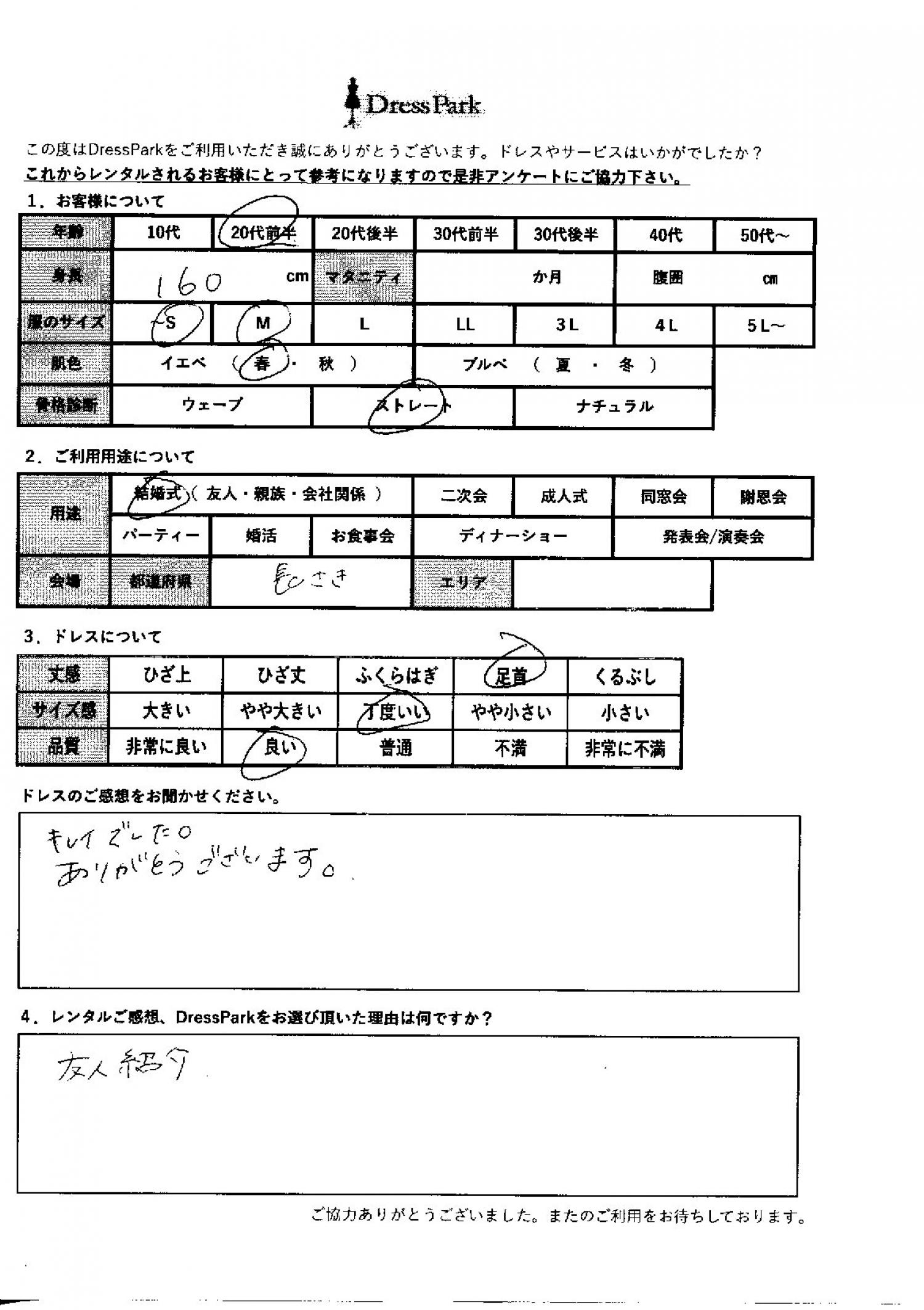 長崎県 H.S様160㎝ ~Sサイズ #20代#SS/S#160~164㎝#結婚式(友人)#長崎県 ◆レンタルしたドレスはこちら ◆レンタルしたサイズは:M ◆レンタルした日付:2025/11/22 ドレスの着用感 ◆点数: (4点) ◆丈感:足首 ◆サイズ感:丁度いい ◆品質:良い ◆肌色:イエベ ◆骨格診断:ストレート ドレスの感想 きれいでした。ありがとうございます。 レンタルのご感想、DressParkをお選び頂いた理由 友人の紹介 CUSTOMER REVIEWS お客様の声 気になるカテゴリー別にご利用の感想をチェック! ◆AGE 年代で見る 10代 20代 30代 40代 50代~ ◆SIZE サイズで見る SS/S M/L 大きいサイズLL~ ◆HIGHT 身長で見る 140~149㎝ 150~154㎝ 155~159㎝ 160~164㎝ 165~169㎝ 170㎝以上 ◆マタニティ ~3か月 4~6か月 7~8か月 9~10か月 ◆肌色 イエベ ブルべ ◆骨格診断 ウェーブ ストレート ナチュラル ◆利用シーン 結婚式(友人) 結婚式(親族) 結婚式(会社関係) 二次会 成人式 謝恩会 パーティー その他 CUSTOMER REVIEWS都道府県別お客様の声 都道府県別にのお客様の声をチェック! 北海道 青森県 岩手県 宮城県 秋田県 山形県 福島県 茨城県 栃木県 群馬県 埼玉県 千葉県 東京都 神奈川県 新潟県 富山県 石川県 福井県 山梨県 長野県 岐阜県 静岡県 愛知県 三重県 滋賀県 京都府 大阪府 兵庫県 奈良県 和歌山県 鳥取県 島根県 岡山県 広島県 山口県 徳島県 香川県 愛媛県 高知県 福岡県 佐賀県 長崎県 熊本県 大分県 宮崎県 鹿児島県 沖縄県 CUSTOMER REVIEWSエリア別お客様の声 都道府県別にのお客様の声をチェック! 札幌 仙台 名古屋 軽井沢 金沢 神戸・芦屋 博多 那覇 梅田・新大阪 難波・心斎橋 鎌倉・湘南 横浜・みなとみらい 舞浜・浦安・幕張 大宮・浦和 青山・表参道 六本木・麻布 渋谷・恵比寿 新宿 池袋 銀座・丸の内 お台場・汐留 鹿児島市 郡山市 福島市 東予 甲府・石和 LINEでお問い合わせ このサイトではJavaScriptを使用しています