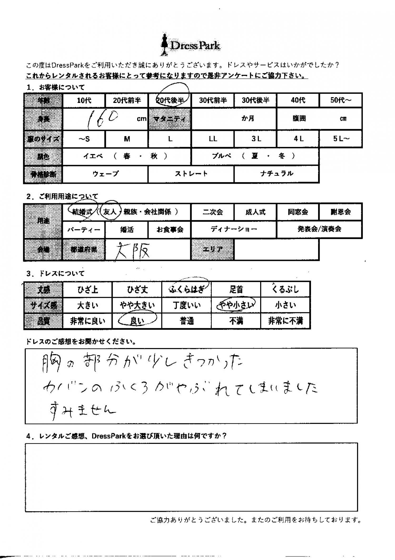 大阪府 R.A様160㎝ Lサイズ #20代#M/L#160~164㎝#結婚式(友人)#大阪府 ◆レンタルしたドレスはこちら ◆レンタルしたサイズは:L ◆レンタルした日付:2025/11/23 ドレスの着用感 ◆点数: (4点) ◆丈感:ふくらはぎ ◆サイズ感:やや小さい ◆品質:良い ドレスの感想 胸の部分が少しきつかった。カバンの袋が破れてしまいました。すみません。 CUSTOMER REVIEWS お客様の声 気になるカテゴリー別にご利用の感想をチェック! ◆AGE 年代で見る 10代 20代 30代 40代 50代~ ◆SIZE サイズで見る SS/S M/L 大きいサイズLL~ ◆HIGHT 身長で見る 140~149㎝ 150~154㎝ 155~159㎝ 160~164㎝ 165~169㎝ 170㎝以上 ◆マタニティ ~3か月 4~6か月 7~8か月 9~10か月 ◆肌色 イエベ ブルべ ◆骨格診断 ウェーブ ストレート ナチュラル ◆利用シーン 結婚式(友人) 結婚式(親族) 結婚式(会社関係) 二次会 成人式 謝恩会 パーティー その他 CUSTOMER REVIEWS都道府県別お客様の声 都道府県別にのお客様の声をチェック! 北海道 青森県 岩手県 宮城県 秋田県 山形県 福島県 茨城県 栃木県 群馬県 埼玉県 千葉県 東京都 神奈川県 新潟県 富山県 石川県 福井県 山梨県 長野県 岐阜県 静岡県 愛知県 三重県 滋賀県 京都府 大阪府 兵庫県 奈良県 和歌山県 鳥取県 島根県 岡山県 広島県 山口県 徳島県 香川県 愛媛県 高知県 福岡県 佐賀県 長崎県 熊本県 大分県 宮崎県 鹿児島県 沖縄県 CUSTOMER REVIEWSエリア別お客様の声 都道府県別にのお客様の声をチェック! 札幌 仙台 名古屋 軽井沢 金沢 神戸・芦屋 博多 那覇 梅田・新大阪 難波・心斎橋 鎌倉・湘南 横浜・みなとみらい 舞浜・浦安・幕張 大宮・浦和 青山・表参道 六本木・麻布 渋谷・恵比寿 新宿 池袋 銀座・丸の内 お台場・汐留 鹿児島市 郡山市 福島市 東予 甲府・石和 LINEでお問い合わせ このサイトではJavaScriptを使用しています
