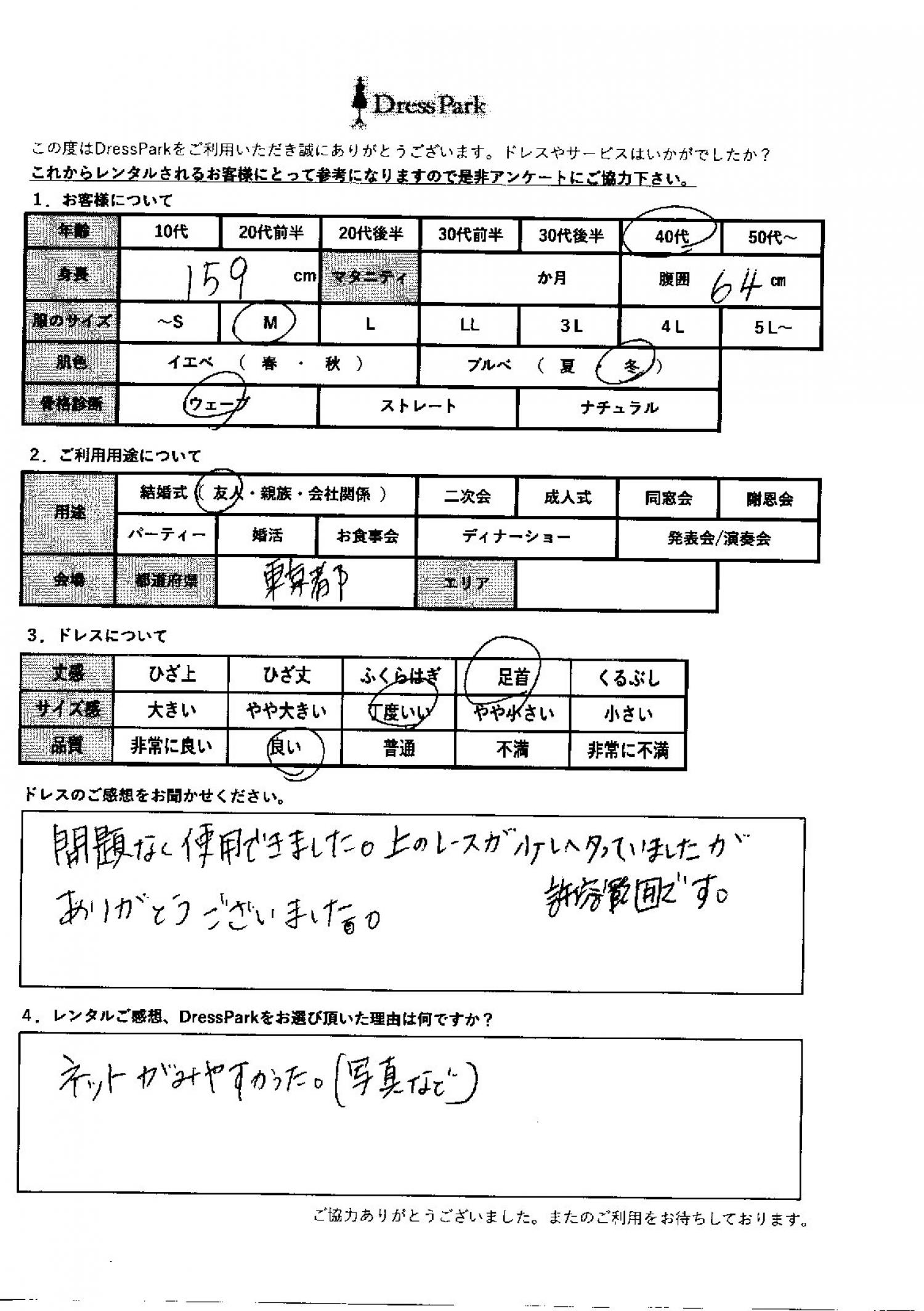 東京都 M.K様159㎝ Mサイズ #40代#M/L#155~159㎝#結婚式(友人)#東京都 ◆レンタルしたドレスはこちら ◆レンタルしたサイズは:M ◆レンタルした日付:2025/11/23 ドレスの着用感 ◆点数: (4点) ◆丈感:足首 ◆サイズ感:丁度いい ◆品質:良い ◆肌色:ブルべ ◆骨格診断:ウェーブ ドレスの感想 題なく使用できました。上のレースが少し下手っていましたが、許容範囲です。ありがとうございました。 レンタルのご感想、DressParkをお選び頂いた理由 ネットが見やすかった(写真など)。 CUSTOMER REVIEWS お客様の声 気になるカテゴリー別にご利用の感想をチェック! ◆AGE 年代で見る 10代 20代 30代 40代 50代~ ◆SIZE サイズで見る SS/S M/L 大きいサイズLL~ ◆HIGHT 身長で見る 140~149㎝ 150~154㎝ 155~159㎝ 160~164㎝ 165~169㎝ 170㎝以上 ◆マタニティ ~3か月 4~6か月 7~8か月 9~10か月 ◆肌色 イエベ ブルべ ◆骨格診断 ウェーブ ストレート ナチュラル ◆利用シーン 結婚式(友人) 結婚式(親族) 結婚式(会社関係) 二次会 成人式 謝恩会 パーティー その他 CUSTOMER REVIEWS都道府県別お客様の声 都道府県別にのお客様の声をチェック! 北海道 青森県 岩手県 宮城県 秋田県 山形県 福島県 茨城県 栃木県 群馬県 埼玉県 千葉県 東京都 神奈川県 新潟県 富山県 石川県 福井県 山梨県 長野県 岐阜県 静岡県 愛知県 三重県 滋賀県 京都府 大阪府 兵庫県 奈良県 和歌山県 鳥取県 島根県 岡山県 広島県 山口県 徳島県 香川県 愛媛県 高知県 福岡県 佐賀県 長崎県 熊本県 大分県 宮崎県 鹿児島県 沖縄県 CUSTOMER REVIEWSエリア別お客様の声 都道府県別にのお客様の声をチェック! 札幌 仙台 名古屋 軽井沢 金沢 神戸・芦屋 博多 那覇 梅田・新大阪 難波・心斎橋 鎌倉・湘南 横浜・みなとみらい 舞浜・浦安・幕張 大宮・浦和 青山・表参道 六本木・麻布 渋谷・恵比寿 新宿 池袋 銀座・丸の内 お台場・汐留 鹿児島市 郡山市 福島市 東予 甲府・石和 LINEでお問い合わせ このサイトではJavaScriptを使用しています