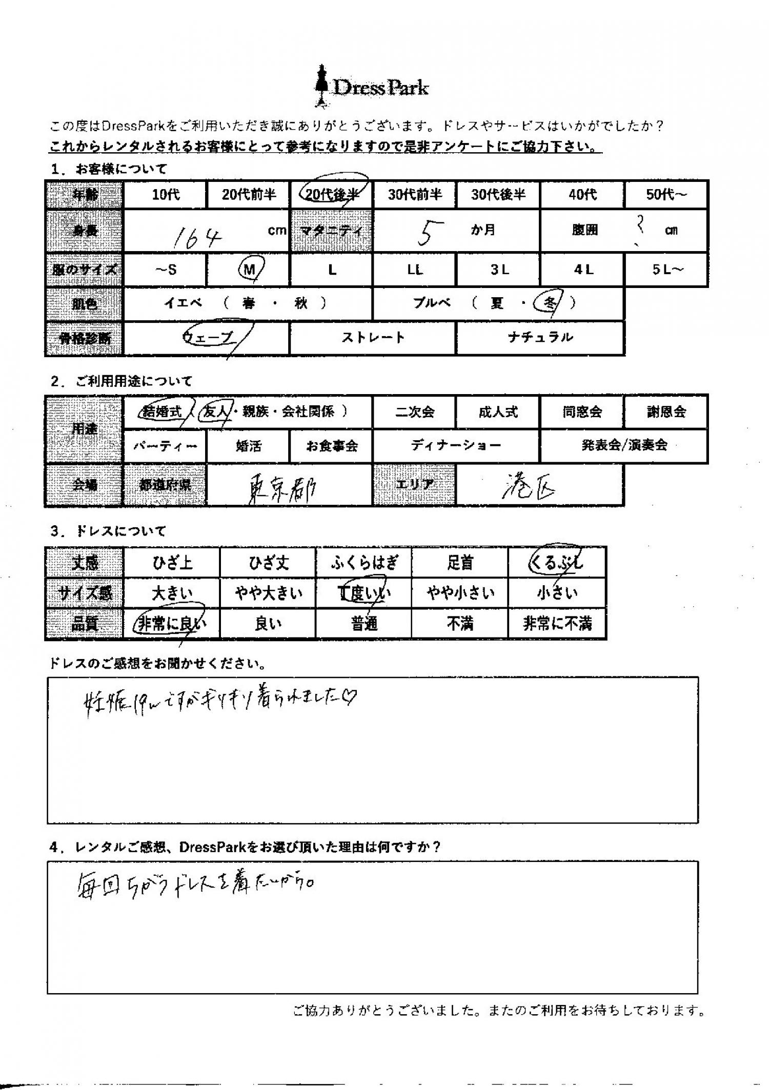 東京都 Y.E様164㎝ Mサイズ六本木・麻布 マタニティ #20代#M/L#160~164㎝#結婚式(友人)#東京都#六本木・麻布 ◆レンタルしたドレスはこちら ◆レンタルしたサイズは:M ◆レンタルした日付:2025/11/24 ドレスの着用感 ◆点数: (5点) ◆丈感:くるぶし ◆サイズ感:丁度いい ◆品質:非常に良い ◆マタニティ: ◆肌色:ブルべ ◆骨格診断:ウェーブ ドレスの感想 妊娠19週目ですが、ギリギリ着られました♡ レンタルのご感想、DressParkをお選び頂いた理由 毎回違うドレスを着たいから。 CUSTOMER REVIEWS お客様の声 気になるカテゴリー別にご利用の感想をチェック! ◆AGE 年代で見る 10代 20代 30代 40代 50代~ ◆SIZE サイズで見る SS/S M/L 大きいサイズLL~ ◆HIGHT 身長で見る 140~149㎝ 150~154㎝ 155~159㎝ 160~164㎝ 165~169㎝ 170㎝以上 ◆マタニティ ~3か月 4~6か月 7~8か月 9~10か月 ◆肌色 イエベ ブルべ ◆骨格診断 ウェーブ ストレート ナチュラル ◆利用シーン 結婚式(友人) 結婚式(親族) 結婚式(会社関係) 二次会 成人式 謝恩会 パーティー その他 CUSTOMER REVIEWS都道府県別お客様の声 都道府県別にのお客様の声をチェック! 北海道 青森県 岩手県 宮城県 秋田県 山形県 福島県 茨城県 栃木県 群馬県 埼玉県 千葉県 東京都 神奈川県 新潟県 富山県 石川県 福井県 山梨県 長野県 岐阜県 静岡県 愛知県 三重県 滋賀県 京都府 大阪府 兵庫県 奈良県 和歌山県 鳥取県 島根県 岡山県 広島県 山口県 徳島県 香川県 愛媛県 高知県 福岡県 佐賀県 長崎県 熊本県 大分県 宮崎県 鹿児島県 沖縄県 CUSTOMER REVIEWSエリア別お客様の声 都道府県別にのお客様の声をチェック! 札幌 仙台 名古屋 軽井沢 金沢 神戸・芦屋 博多 那覇 梅田・新大阪 難波・心斎橋 鎌倉・湘南 横浜・みなとみらい 舞浜・浦安・幕張 大宮・浦和 青山・表参道 六本木・麻布 渋谷・恵比寿 新宿 池袋 銀座・丸の内 お台場・汐留 鹿児島市 郡山市 福島市 東予 甲府・石和 LINEでお問い合わせ このサイトではJavaScriptを使用しています