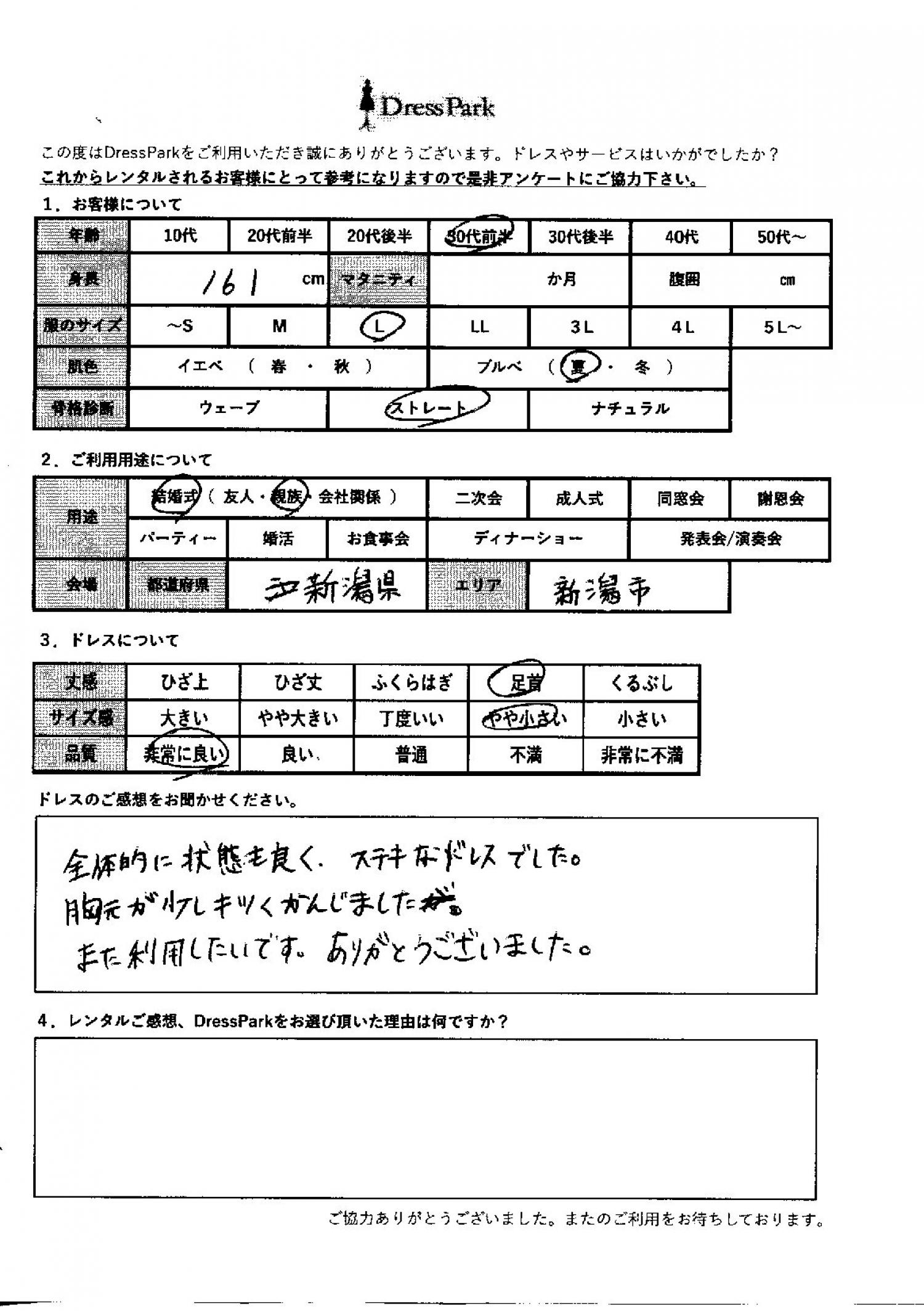 新潟県 K.O様161㎝ Lサイズ #30代#M/L#160~164㎝#結婚式(親族)#新潟県 ◆レンタルしたドレスはこちら ◆レンタルしたサイズは:L ◆レンタルした日付:2025/11/23 ドレスの着用感 ◆点数: (5点) ◆丈感:足首 ◆サイズ感:やや小さい ◆品質:非常に良い ◆肌色:ブルべ ◆骨格診断:ストレート ドレスの感想 全体的に状態も良く、素敵なドレスでした。胸元が少しきつく感じましたが。また利用したいです。ありがとうございました。 CUSTOMER REVIEWS お客様の声 気になるカテゴリー別にご利用の感想をチェック! ◆AGE 年代で見る 10代 20代 30代 40代 50代~ ◆SIZE サイズで見る SS/S M/L 大きいサイズLL~ ◆HIGHT 身長で見る 140~149㎝ 150~154㎝ 155~159㎝ 160~164㎝ 165~169㎝ 170㎝以上 ◆マタニティ ~3か月 4~6か月 7~8か月 9~10か月 ◆肌色 イエベ ブルべ ◆骨格診断 ウェーブ ストレート ナチュラル ◆利用シーン 結婚式(友人) 結婚式(親族) 結婚式(会社関係) 二次会 成人式 謝恩会 パーティー その他 CUSTOMER REVIEWS都道府県別お客様の声 都道府県別にのお客様の声をチェック! 北海道 青森県 岩手県 宮城県 秋田県 山形県 福島県 茨城県 栃木県 群馬県 埼玉県 千葉県 東京都 神奈川県 新潟県 富山県 石川県 福井県 山梨県 長野県 岐阜県 静岡県 愛知県 三重県 滋賀県 京都府 大阪府 兵庫県 奈良県 和歌山県 鳥取県 島根県 岡山県 広島県 山口県 徳島県 香川県 愛媛県 高知県 福岡県 佐賀県 長崎県 熊本県 大分県 宮崎県 鹿児島県 沖縄県 CUSTOMER REVIEWSエリア別お客様の声 都道府県別にのお客様の声をチェック! 札幌 仙台 名古屋 軽井沢 金沢 神戸・芦屋 博多 那覇 梅田・新大阪 難波・心斎橋 鎌倉・湘南 横浜・みなとみらい 舞浜・浦安・幕張 大宮・浦和 青山・表参道 六本木・麻布 渋谷・恵比寿 新宿 池袋 銀座・丸の内 お台場・汐留 鹿児島市 郡山市 福島市 東予 甲府・石和 LINEでお問い合わせ このサイトではJavaScriptを使用しています