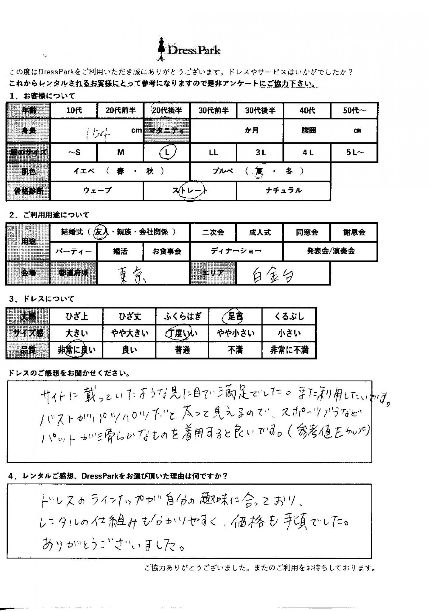 ドレスのラインナップが自分の趣味に合っており、レンタルの仕組みもわかりやすく、価格も手頃でした。ありがとうございました。
