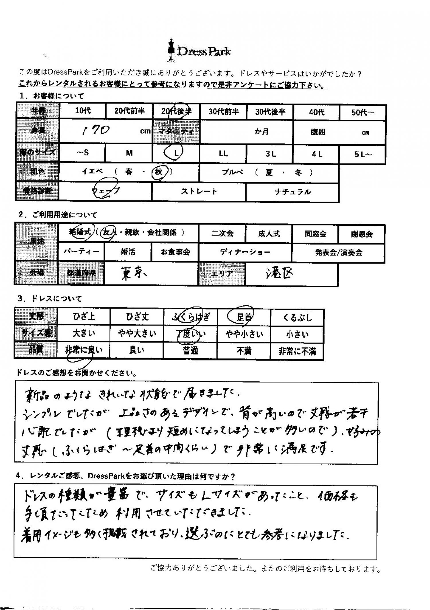東京都 M.K様170㎝ Lサイズ六本木・麻布 #20代#M/L#170㎝以上#結婚式(友人)#東京都#六本木・麻布 ◆レンタルしたドレスはこちら ◆レンタルしたサイズは:L ◆レンタルした日付:2025/11/24 ドレスの着用感 ◆点数: (5点) ◆丈感:ふくらはぎ ◆サイズ感:丁度いい ◆品質:非常に良い ◆肌色:イエベ ◆骨格診断:ウェーブ ドレスの感想 新品のような綺麗な状態で届きました。シンプルでしたが、上品さのあるデザインで、背が高いので、丈感が若干失敗でしたが、(理想より短めになってしまうことが多いので)好みの丈感(ふくらはぎから足首の中間位)で非常に満足です。 レンタルのご感想、DressParkをお選び頂いた理由 ドレスの種類が豊富で、サイズもLサイズがあったこと、価格も手頃だったため、利用させていただきました。着用イメージも多く掲載されており、選ぶのにとても参考になりました。 CUSTOMER REVIEWS お客様の声 気になるカテゴリー別にご利用の感想をチェック! ◆AGE 年代で見る 10代 20代 30代 40代 50代~ ◆SIZE サイズで見る SS/S M/L 大きいサイズLL~ ◆HIGHT 身長で見る 140~149㎝ 150~154㎝ 155~159㎝ 160~164㎝ 165~169㎝ 170㎝以上 ◆マタニティ ~3か月 4~6か月 7~8か月 9~10か月 ◆肌色 イエベ ブルべ ◆骨格診断 ウェーブ ストレート ナチュラル ◆利用シーン 結婚式(友人) 結婚式(親族) 結婚式(会社関係) 二次会 成人式 謝恩会 パーティー その他 CUSTOMER REVIEWS都道府県別お客様の声 都道府県別にのお客様の声をチェック! 北海道 青森県 岩手県 宮城県 秋田県 山形県 福島県 茨城県 栃木県 群馬県 埼玉県 千葉県 東京都 神奈川県 新潟県 富山県 石川県 福井県 山梨県 長野県 岐阜県 静岡県 愛知県 三重県 滋賀県 京都府 大阪府 兵庫県 奈良県 和歌山県 鳥取県 島根県 岡山県 広島県 山口県 徳島県 香川県 愛媛県 高知県 福岡県 佐賀県 長崎県 熊本県 大分県 宮崎県 鹿児島県 沖縄県 CUSTOMER REVIEWSエリア別お客様の声 都道府県別にのお客様の声をチェック! 札幌 仙台 名古屋 軽井沢 金沢 神戸・芦屋 博多 那覇 梅田・新大阪 難波・心斎橋 鎌倉・湘南 横浜・みなとみらい 舞浜・浦安・幕張 大宮・浦和 青山・表参道 六本木・麻布 渋谷・恵比寿 新宿 池袋 銀座・丸の内 お台場・汐留 鹿児島市 郡山市 福島市 東予 甲府・石和 LINEでお問い合わせ このサイトではJavaScriptを使用しています