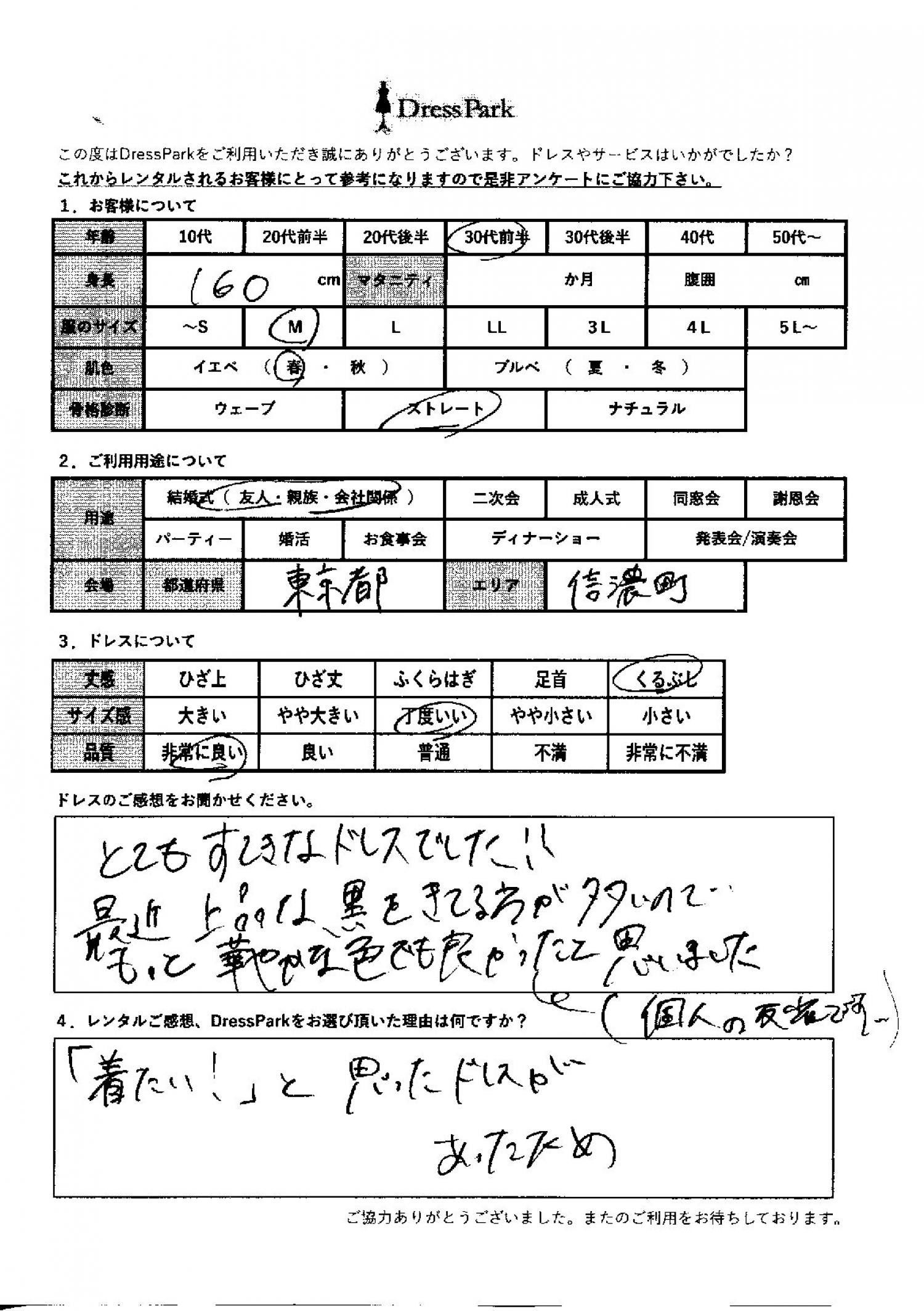 東京都 M.I様160㎝ Mサイズ #30代#M/L#160~164㎝#結婚式(友人)#東京都 ◆レンタルしたドレスはこちら ◆レンタルしたサイズは:M ◆レンタルした日付:2025/11/24 ドレスの着用感 ◆点数: (5点) ◆丈感:くるぶし ◆サイズ感:丁度いい ◆品質:非常に良い ◆肌色:イエベ ◆骨格診断:ストレート ドレスの感想 とても素敵なドレスでした!最近上品な黒を着ている方が多いので、もっと華やかな色でも良かったと思いました。(個人の反省です) レンタルのご感想、DressParkをお選び頂いた理由 「着たい!」と思ったドレスがあったため。 CUSTOMER REVIEWS お客様の声 気になるカテゴリー別にご利用の感想をチェック! ◆AGE 年代で見る 10代 20代 30代 40代 50代~ ◆SIZE サイズで見る SS/S M/L 大きいサイズLL~ ◆HIGHT 身長で見る 140~149㎝ 150~154㎝ 155~159㎝ 160~164㎝ 165~169㎝ 170㎝以上 ◆マタニティ ~3か月 4~6か月 7~8か月 9~10か月 ◆肌色 イエベ ブルべ ◆骨格診断 ウェーブ ストレート ナチュラル ◆利用シーン 結婚式(友人) 結婚式(親族) 結婚式(会社関係) 二次会 成人式 謝恩会 パーティー その他 CUSTOMER REVIEWS都道府県別お客様の声 都道府県別にのお客様の声をチェック! 北海道 青森県 岩手県 宮城県 秋田県 山形県 福島県 茨城県 栃木県 群馬県 埼玉県 千葉県 東京都 神奈川県 新潟県 富山県 石川県 福井県 山梨県 長野県 岐阜県 静岡県 愛知県 三重県 滋賀県 京都府 大阪府 兵庫県 奈良県 和歌山県 鳥取県 島根県 岡山県 広島県 山口県 徳島県 香川県 愛媛県 高知県 福岡県 佐賀県 長崎県 熊本県 大分県 宮崎県 鹿児島県 沖縄県 CUSTOMER REVIEWSエリア別お客様の声 都道府県別にのお客様の声をチェック! 札幌 仙台 名古屋 軽井沢 金沢 神戸・芦屋 博多 那覇 梅田・新大阪 難波・心斎橋 鎌倉・湘南 横浜・みなとみらい 舞浜・浦安・幕張 大宮・浦和 青山・表参道 六本木・麻布 渋谷・恵比寿 新宿 池袋 銀座・丸の内 お台場・汐留 鹿児島市 郡山市 福島市 東予 甲府・石和 LINEでお問い合わせ このサイトではJavaScriptを使用しています