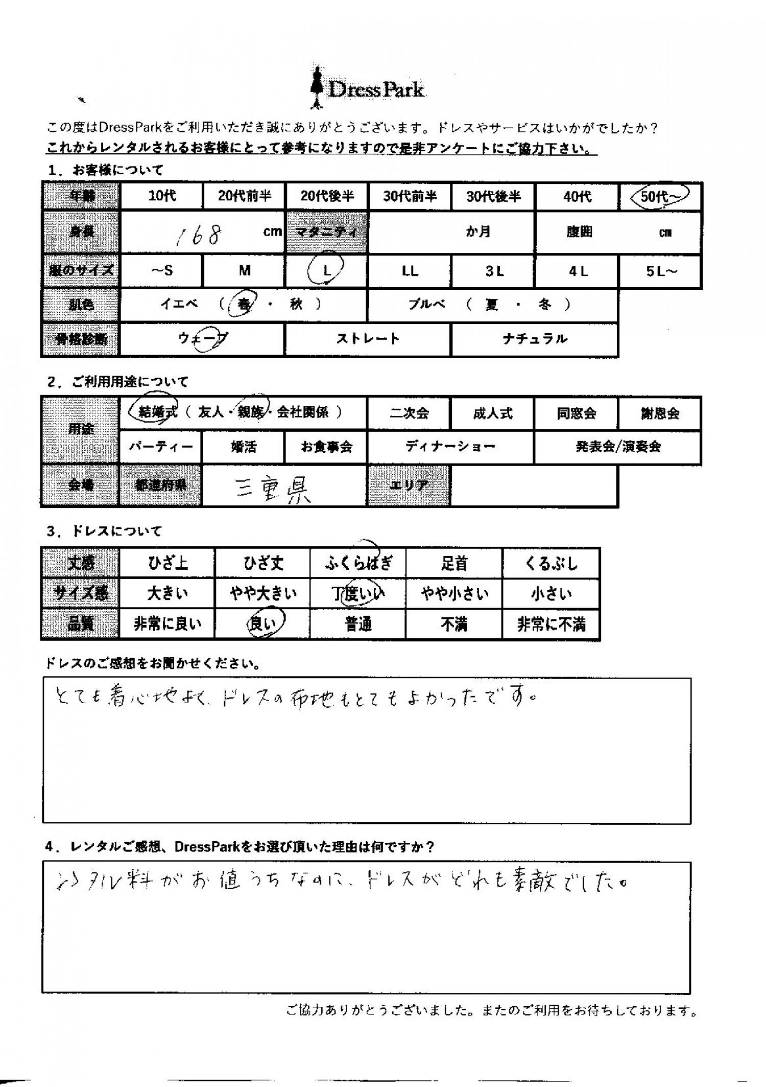三重県 S.U様168㎝ Lサイズ #50代~#M/L#165~169㎝#結婚式(親族)#三重県 ◆レンタルしたドレスはこちら ◆レンタルしたサイズは:L ◆レンタルした日付:2025/11/23 ドレスの着用感 ◆点数: (4点) ◆丈感:ふくらはぎ ◆サイズ感:丁度いい ◆品質:良い ◆肌色:イエベ ◆骨格診断:ウェーブ ドレスの感想 とても着心地良く、ドレスの布地もとても良かったです。 レンタルのご感想、DressParkをお選び頂いた理由 レンタル料がお値打ちなのに、ドレスがどれも素敵でした。 CUSTOMER REVIEWS お客様の声 気になるカテゴリー別にご利用の感想をチェック! ◆AGE 年代で見る 10代 20代 30代 40代 50代~ ◆SIZE サイズで見る SS/S M/L 大きいサイズLL~ ◆HIGHT 身長で見る 140~149㎝ 150~154㎝ 155~159㎝ 160~164㎝ 165~169㎝ 170㎝以上 ◆マタニティ ~3か月 4~6か月 7~8か月 9~10か月 ◆肌色 イエベ ブルべ ◆骨格診断 ウェーブ ストレート ナチュラル ◆利用シーン 結婚式(友人) 結婚式(親族) 結婚式(会社関係) 二次会 成人式 謝恩会 パーティー その他 CUSTOMER REVIEWS都道府県別お客様の声 都道府県別にのお客様の声をチェック! 北海道 青森県 岩手県 宮城県 秋田県 山形県 福島県 茨城県 栃木県 群馬県 埼玉県 千葉県 東京都 神奈川県 新潟県 富山県 石川県 福井県 山梨県 長野県 岐阜県 静岡県 愛知県 三重県 滋賀県 京都府 大阪府 兵庫県 奈良県 和歌山県 鳥取県 島根県 岡山県 広島県 山口県 徳島県 香川県 愛媛県 高知県 福岡県 佐賀県 長崎県 熊本県 大分県 宮崎県 鹿児島県 沖縄県 CUSTOMER REVIEWSエリア別お客様の声 都道府県別にのお客様の声をチェック! 札幌 仙台 名古屋 軽井沢 金沢 神戸・芦屋 博多 那覇 梅田・新大阪 難波・心斎橋 鎌倉・湘南 横浜・みなとみらい 舞浜・浦安・幕張 大宮・浦和 青山・表参道 六本木・麻布 渋谷・恵比寿 新宿 池袋 銀座・丸の内 お台場・汐留 鹿児島市 郡山市 福島市 東予 甲府・石和 LINEでお問い合わせ このサイトではJavaScriptを使用しています