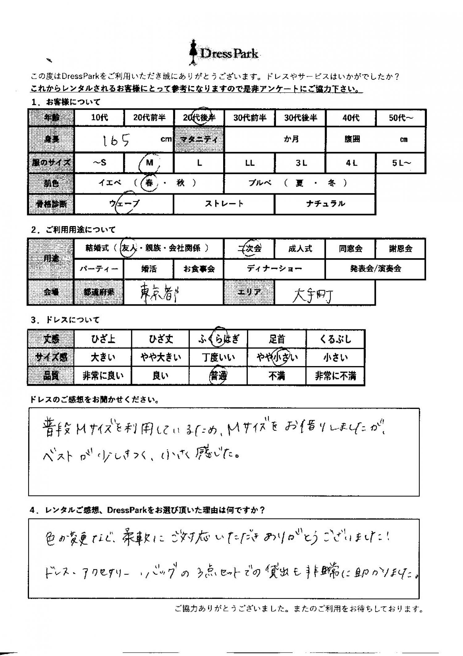 東京都 M.T様165㎝ Mサイズ銀座・丸の内 #20代#M/L#165~169㎝#結婚式(友人)#東京都#銀座・丸の内 ◆レンタルしたドレスはこちら ◆レンタルしたサイズは:M ◆レンタルした日付:2025/11/24 ドレスの着用感 ◆点数: (4点) ◆丈感:ふくらはぎ ◆サイズ感:やや小さい ◆品質:普通 ◆肌色:イエベ ◆骨格診断:ウェーブ ドレスの感想 普段Mサイズを利用しているため、Mサイズをお借りしましたが、ベストが少しきつく小さく感じた。 レンタルのご感想、DressParkをお選び頂いた理由 色の変更など柔軟にご対応いただきありがとうございました!ドレス、アクセサリー、バッグの3点セットでの貸し出しも非常に助かりました。 CUSTOMER REVIEWS お客様の声 気になるカテゴリー別にご利用の感想をチェック! ◆AGE 年代で見る 10代 20代 30代 40代 50代~ ◆SIZE サイズで見る SS/S M/L 大きいサイズLL~ ◆HIGHT 身長で見る 140~149㎝ 150~154㎝ 155~159㎝ 160~164㎝ 165~169㎝ 170㎝以上 ◆マタニティ ~3か月 4~6か月 7~8か月 9~10か月 ◆肌色 イエベ ブルべ ◆骨格診断 ウェーブ ストレート ナチュラル ◆利用シーン 結婚式(友人) 結婚式(親族) 結婚式(会社関係) 二次会 成人式 謝恩会 パーティー その他 CUSTOMER REVIEWS都道府県別お客様の声 都道府県別にのお客様の声をチェック! 北海道 青森県 岩手県 宮城県 秋田県 山形県 福島県 茨城県 栃木県 群馬県 埼玉県 千葉県 東京都 神奈川県 新潟県 富山県 石川県 福井県 山梨県 長野県 岐阜県 静岡県 愛知県 三重県 滋賀県 京都府 大阪府 兵庫県 奈良県 和歌山県 鳥取県 島根県 岡山県 広島県 山口県 徳島県 香川県 愛媛県 高知県 福岡県 佐賀県 長崎県 熊本県 大分県 宮崎県 鹿児島県 沖縄県 CUSTOMER REVIEWSエリア別お客様の声 都道府県別にのお客様の声をチェック! 札幌 仙台 名古屋 軽井沢 金沢 神戸・芦屋 博多 那覇 梅田・新大阪 難波・心斎橋 鎌倉・湘南 横浜・みなとみらい 舞浜・浦安・幕張 大宮・浦和 青山・表参道 六本木・麻布 渋谷・恵比寿 新宿 池袋 銀座・丸の内 お台場・汐留 鹿児島市 郡山市 福島市 東予 甲府・石和 LINEでお問い合わせ このサイトではJavaScriptを使用しています