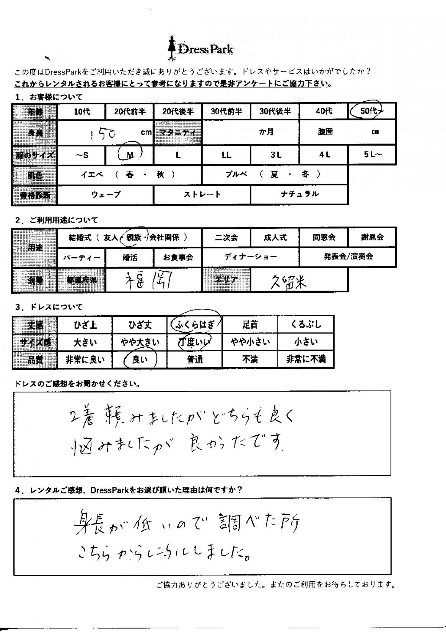 福岡県 A.K様150㎝ Mサイズ #50代~#M/L#150~154㎝#結婚式(親族)#福岡県 ◆レンタルしたドレスはこちら ◆レンタルしたサイズは:M ◆レンタルした日付:2025/11/23 ドレスの着用感 ◆点数: (4点) ◆丈感:ふくらはぎ ◆サイズ感:丁度いい ◆品質:良い ドレスの感想 2着頼みましたが、どちらもよく悩みましたがよかったです。 レンタルのご感想、DressParkをお選び頂いた理由 身長が低いので調べたところ、こちらからレンタルしました。 CUSTOMER REVIEWS お客様の声 気になるカテゴリー別にご利用の感想をチェック! ◆AGE 年代で見る 10代 20代 30代 40代 50代~ ◆SIZE サイズで見る SS/S M/L 大きいサイズLL~ ◆HIGHT 身長で見る 140~149㎝ 150~154㎝ 155~159㎝ 160~164㎝ 165~169㎝ 170㎝以上 ◆マタニティ ~3か月 4~6か月 7~8か月 9~10か月 ◆肌色 イエベ ブルべ ◆骨格診断 ウェーブ ストレート ナチュラル ◆利用シーン 結婚式(友人) 結婚式(親族) 結婚式(会社関係) 二次会 成人式 謝恩会 パーティー その他 CUSTOMER REVIEWS都道府県別お客様の声 都道府県別にのお客様の声をチェック! 北海道 青森県 岩手県 宮城県 秋田県 山形県 福島県 茨城県 栃木県 群馬県 埼玉県 千葉県 東京都 神奈川県 新潟県 富山県 石川県 福井県 山梨県 長野県 岐阜県 静岡県 愛知県 三重県 滋賀県 京都府 大阪府 兵庫県 奈良県 和歌山県 鳥取県 島根県 岡山県 広島県 山口県 徳島県 香川県 愛媛県 高知県 福岡県 佐賀県 長崎県 熊本県 大分県 宮崎県 鹿児島県 沖縄県 CUSTOMER REVIEWSエリア別お客様の声 都道府県別にのお客様の声をチェック! 札幌 仙台 名古屋 軽井沢 金沢 神戸・芦屋 博多 那覇 梅田・新大阪 難波・心斎橋 鎌倉・湘南 横浜・みなとみらい 舞浜・浦安・幕張 大宮・浦和 青山・表参道 六本木・麻布 渋谷・恵比寿 新宿 池袋 銀座・丸の内 お台場・汐留 鹿児島市 郡山市 福島市 東予 甲府・石和 LINEでお問い合わせ このサイトではJavaScriptを使用しています