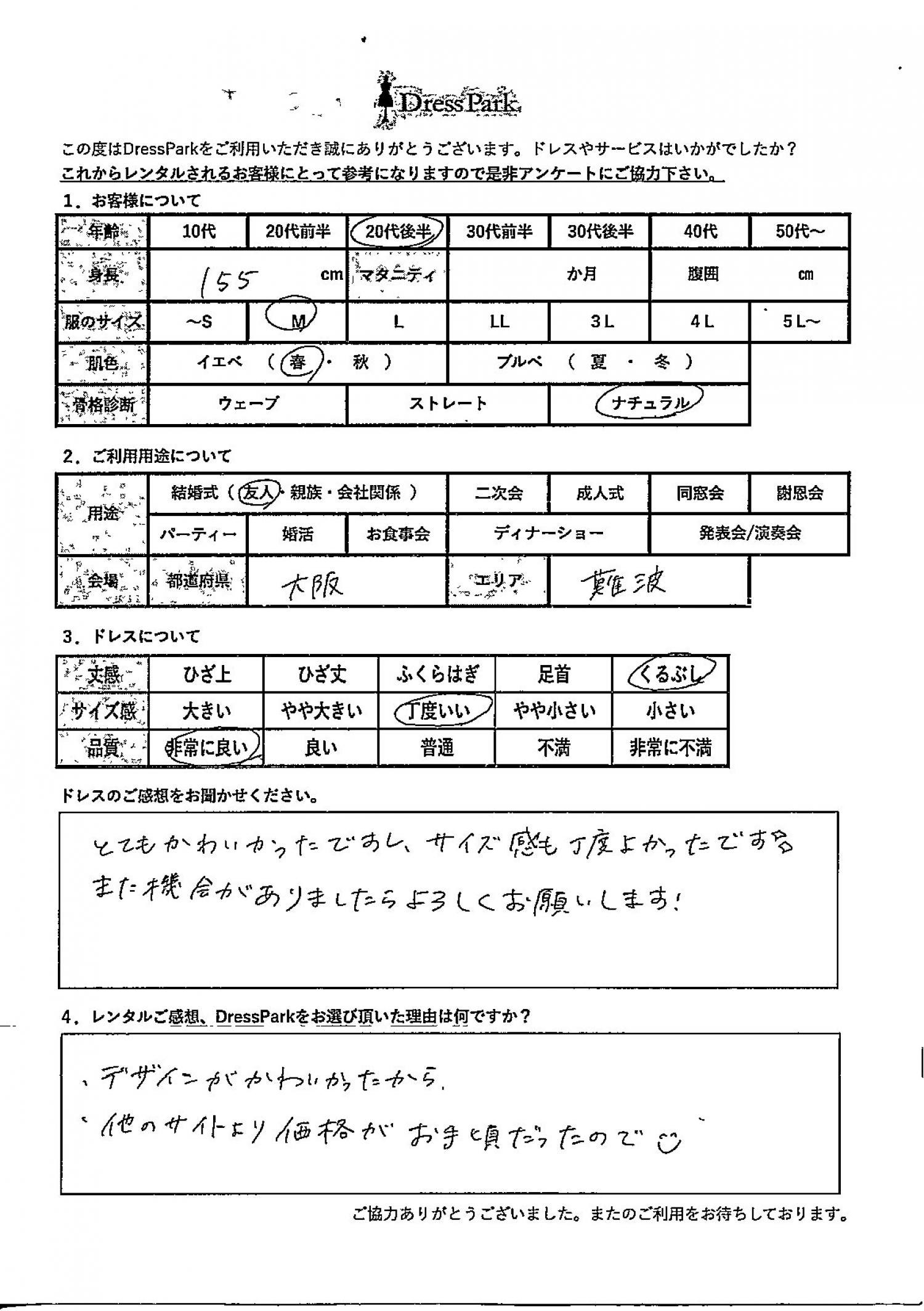 大阪府 H.N様155㎝ Mサイズ難波・心斎橋 #20代#M/L#155~159㎝#結婚式(友人)#大阪府#難波・心斎橋 ◆レンタルしたドレスはこちら ◆レンタルしたサイズは:M ◆レンタルした日付:2025/11/24 ドレスの着用感 ◆点数: (5点) ◆丈感:くるぶし ◆サイズ感:丁度いい ◆品質:非常に良い ◆肌色:イエベ ◆骨格診断:ナチュラル ドレスの感想 とてもかわいかったですし、サイズ感も丁度よかったです✨ また機会がありましたらよろしくお願いします! レンタルのご感想、DressParkをお選び頂いた理由 デザインがかわいかったから 他のサイトより価格がお手頃だったので☺ CUSTOMER REVIEWS お客様の声 気になるカテゴリー別にご利用の感想をチェック! ◆AGE 年代で見る 10代 20代 30代 40代 50代~ ◆SIZE サイズで見る SS/S M/L 大きいサイズLL~ ◆HIGHT 身長で見る 140~149㎝ 150~154㎝ 155~159㎝ 160~164㎝ 165~169㎝ 170㎝以上 ◆マタニティ ~3か月 4~6か月 7~8か月 9~10か月 ◆肌色 イエベ ブルべ ◆骨格診断 ウェーブ ストレート ナチュラル ◆利用シーン 結婚式(友人) 結婚式(親族) 結婚式(会社関係) 二次会 成人式 謝恩会 パーティー その他 CUSTOMER REVIEWS都道府県別お客様の声 都道府県別にのお客様の声をチェック! 北海道 青森県 岩手県 宮城県 秋田県 山形県 福島県 茨城県 栃木県 群馬県 埼玉県 千葉県 東京都 神奈川県 新潟県 富山県 石川県 福井県 山梨県 長野県 岐阜県 静岡県 愛知県 三重県 滋賀県 京都府 大阪府 兵庫県 奈良県 和歌山県 鳥取県 島根県 岡山県 広島県 山口県 徳島県 香川県 愛媛県 高知県 福岡県 佐賀県 長崎県 熊本県 大分県 宮崎県 鹿児島県 沖縄県 CUSTOMER REVIEWSエリア別お客様の声 都道府県別にのお客様の声をチェック! 札幌 仙台 名古屋 軽井沢 金沢 神戸・芦屋 博多 那覇 梅田・新大阪 難波・心斎橋 鎌倉・湘南 横浜・みなとみらい 舞浜・浦安・幕張 大宮・浦和 青山・表参道 六本木・麻布 渋谷・恵比寿 新宿 池袋 銀座・丸の内 お台場・汐留 鹿児島市 郡山市 福島市 東予 甲府・石和 LINEでお問い合わせ このサイトではJavaScriptを使用しています