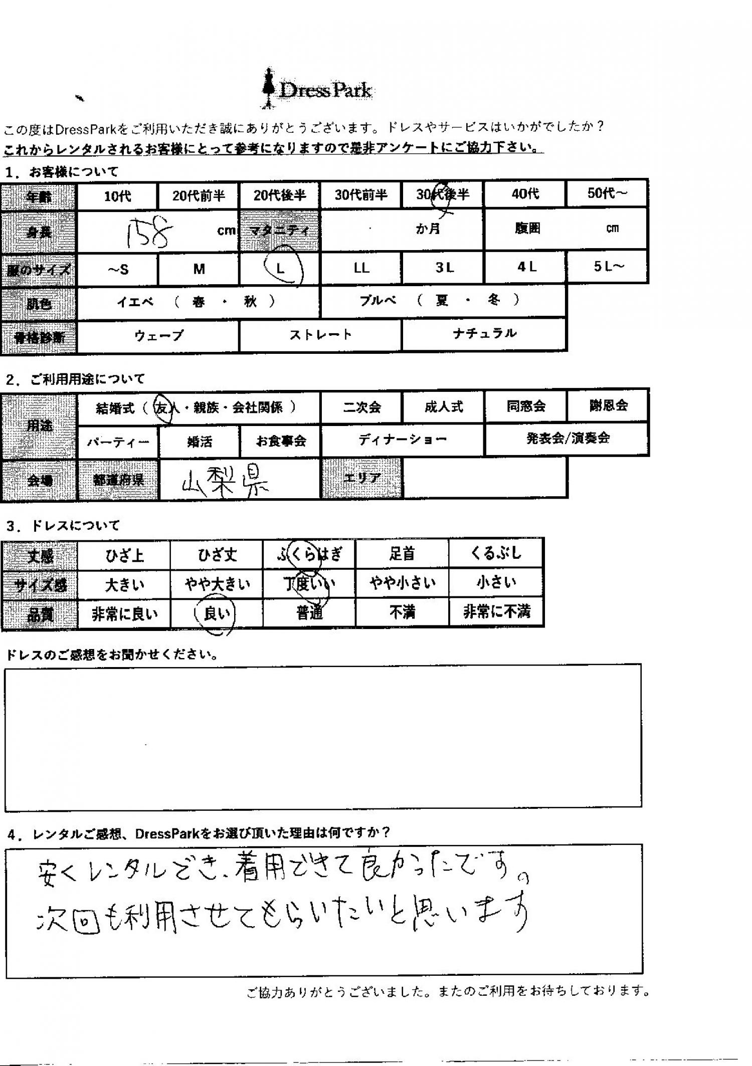 山梨県 Y.M様158㎝ Lサイズ #30代#M/L#155~159㎝#結婚式(友人)#山梨県 ◆レンタルしたドレスはこちら ◆レンタルしたサイズは:L ◆レンタルした日付:2025/11/29 ドレスの着用感 ◆点数: (4点) ◆丈感:ふくらはぎ ◆サイズ感:丁度いい ◆品質:良い レンタルのご感想、DressParkをお選び頂いた理由 安くレンタルでき、着用できてよかったです。次回も利用させていただきたいと思います。 CUSTOMER REVIEWS お客様の声 気になるカテゴリー別にご利用の感想をチェック! ◆AGE 年代で見る 10代 20代 30代 40代 50代~ ◆SIZE サイズで見る SS/S M/L 大きいサイズLL~ ◆HIGHT 身長で見る 140~149㎝ 150~154㎝ 155~159㎝ 160~164㎝ 165~169㎝ 170㎝以上 ◆マタニティ ~3か月 4~6か月 7~8か月 9~10か月 ◆肌色 イエベ ブルべ ◆骨格診断 ウェーブ ストレート ナチュラル ◆利用シーン 結婚式(友人) 結婚式(親族) 結婚式(会社関係) 二次会 成人式 謝恩会 パーティー その他 CUSTOMER REVIEWS都道府県別お客様の声 都道府県別にのお客様の声をチェック! 北海道 青森県 岩手県 宮城県 秋田県 山形県 福島県 茨城県 栃木県 群馬県 埼玉県 千葉県 東京都 神奈川県 新潟県 富山県 石川県 福井県 山梨県 長野県 岐阜県 静岡県 愛知県 三重県 滋賀県 京都府 大阪府 兵庫県 奈良県 和歌山県 鳥取県 島根県 岡山県 広島県 山口県 徳島県 香川県 愛媛県 高知県 福岡県 佐賀県 長崎県 熊本県 大分県 宮崎県 鹿児島県 沖縄県 CUSTOMER REVIEWSエリア別お客様の声 都道府県別にのお客様の声をチェック! 札幌 仙台 名古屋 軽井沢 金沢 神戸・芦屋 博多 那覇 梅田・新大阪 難波・心斎橋 鎌倉・湘南 横浜・みなとみらい 舞浜・浦安・幕張 大宮・浦和 青山・表参道 六本木・麻布 渋谷・恵比寿 新宿 池袋 銀座・丸の内 お台場・汐留 鹿児島市 郡山市 福島市 東予 甲府・石和 LINEでお問い合わせ このサイトではJavaScriptを使用しています
