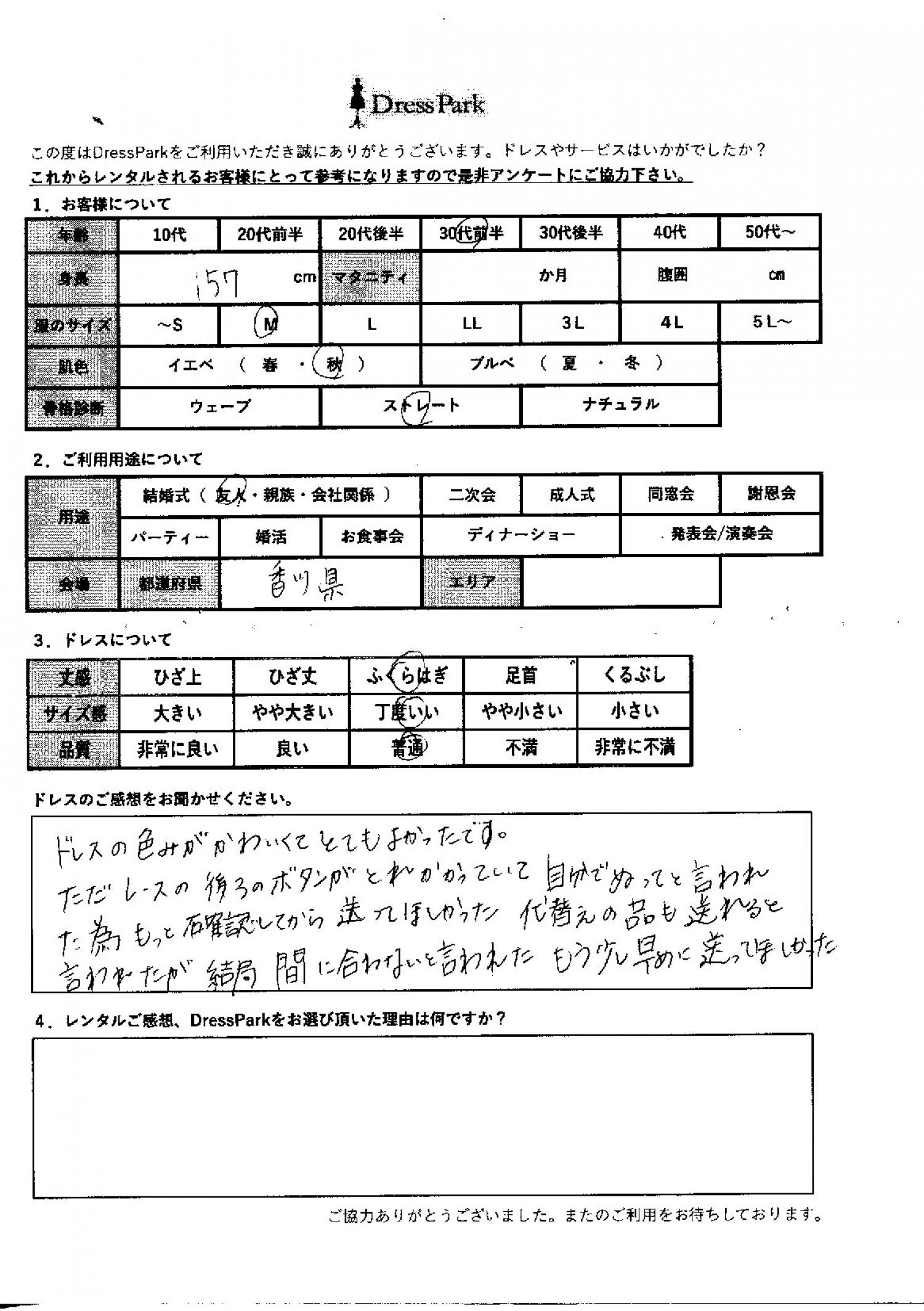 ドレスの色味が可愛くてとても良かったです。ただレースの後ろのボタンが取れかかっていて、自分で縫ってと言われたためもっと確認してから送って欲しかった。代替え品も送れると言われたが、結局間に合わないと言われた。もう少し早めに送って欲しかった。【スタッフより】