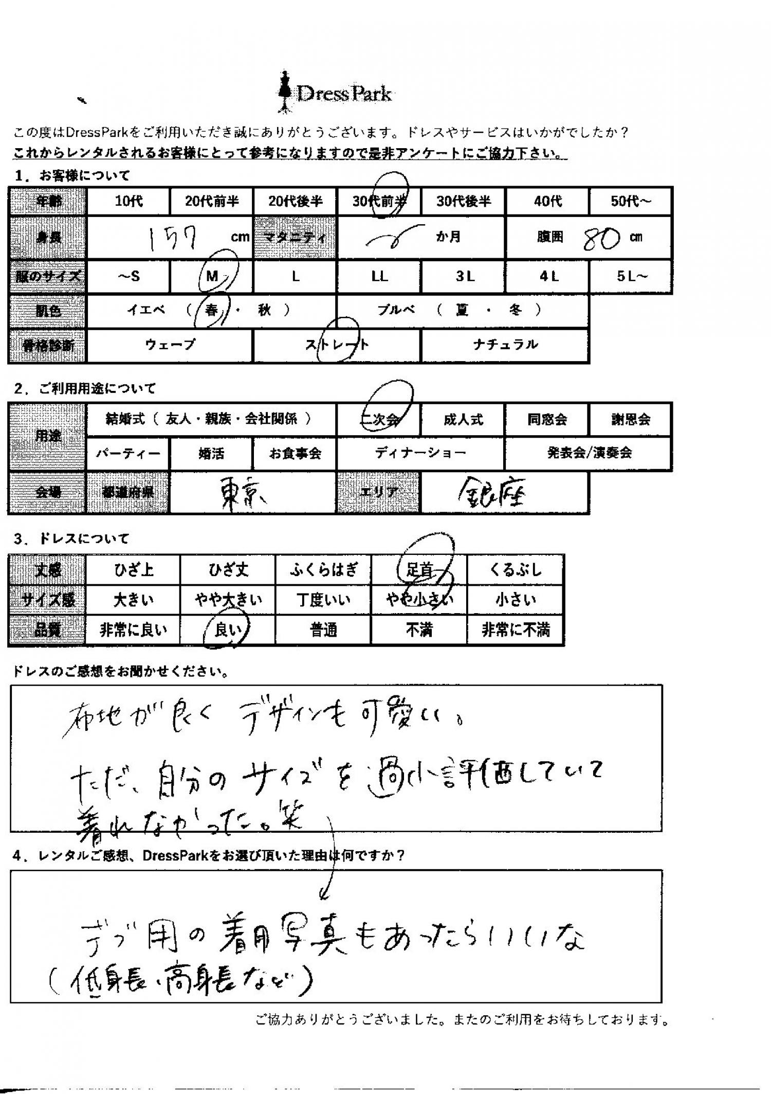 東京都 A.Y様157㎝ Mサイズ銀座・丸の内 #30代#M/L#155~159㎝#二次会#東京都#銀座・丸の内 ◆レンタルしたドレスはこちら ◆レンタルしたサイズは:M ◆レンタルした日付:2025/11/29 ドレスの着用感 ◆点数: (4点) ◆丈感:足首 ◆サイズ感:やや小さい ◆品質:良い ◆肌色:イエベ ◆骨格診断:ストレート ドレスの感想 布地が良く、デザインもかわいい。ただ自分のサイズを過小評価していて着られなかった。笑 デブ用の着用写真もあったらいいな。(低身長、高身長など) CUSTOMER REVIEWS お客様の声 気になるカテゴリー別にご利用の感想をチェック! ◆AGE 年代で見る 10代 20代 30代 40代 50代~ ◆SIZE サイズで見る SS/S M/L 大きいサイズLL~ ◆HIGHT 身長で見る 140~149㎝ 150~154㎝ 155~159㎝ 160~164㎝ 165~169㎝ 170㎝以上 ◆マタニティ ~3か月 4~6か月 7~8か月 9~10か月 ◆肌色 イエベ ブルべ ◆骨格診断 ウェーブ ストレート ナチュラル ◆利用シーン 結婚式(友人) 結婚式(親族) 結婚式(会社関係) 二次会 成人式 謝恩会 パーティー その他 CUSTOMER REVIEWS都道府県別お客様の声 都道府県別にのお客様の声をチェック! 北海道 青森県 岩手県 宮城県 秋田県 山形県 福島県 茨城県 栃木県 群馬県 埼玉県 千葉県 東京都 神奈川県 新潟県 富山県 石川県 福井県 山梨県 長野県 岐阜県 静岡県 愛知県 三重県 滋賀県 京都府 大阪府 兵庫県 奈良県 和歌山県 鳥取県 島根県 岡山県 広島県 山口県 徳島県 香川県 愛媛県 高知県 福岡県 佐賀県 長崎県 熊本県 大分県 宮崎県 鹿児島県 沖縄県 CUSTOMER REVIEWSエリア別お客様の声 都道府県別にのお客様の声をチェック! 札幌 仙台 名古屋 軽井沢 金沢 神戸・芦屋 博多 那覇 梅田・新大阪 難波・心斎橋 鎌倉・湘南 横浜・みなとみらい 舞浜・浦安・幕張 大宮・浦和 青山・表参道 六本木・麻布 渋谷・恵比寿 新宿 池袋 銀座・丸の内 お台場・汐留 鹿児島市 郡山市 福島市 東予 甲府・石和 LINEでお問い合わせ このサイトではJavaScriptを使用しています