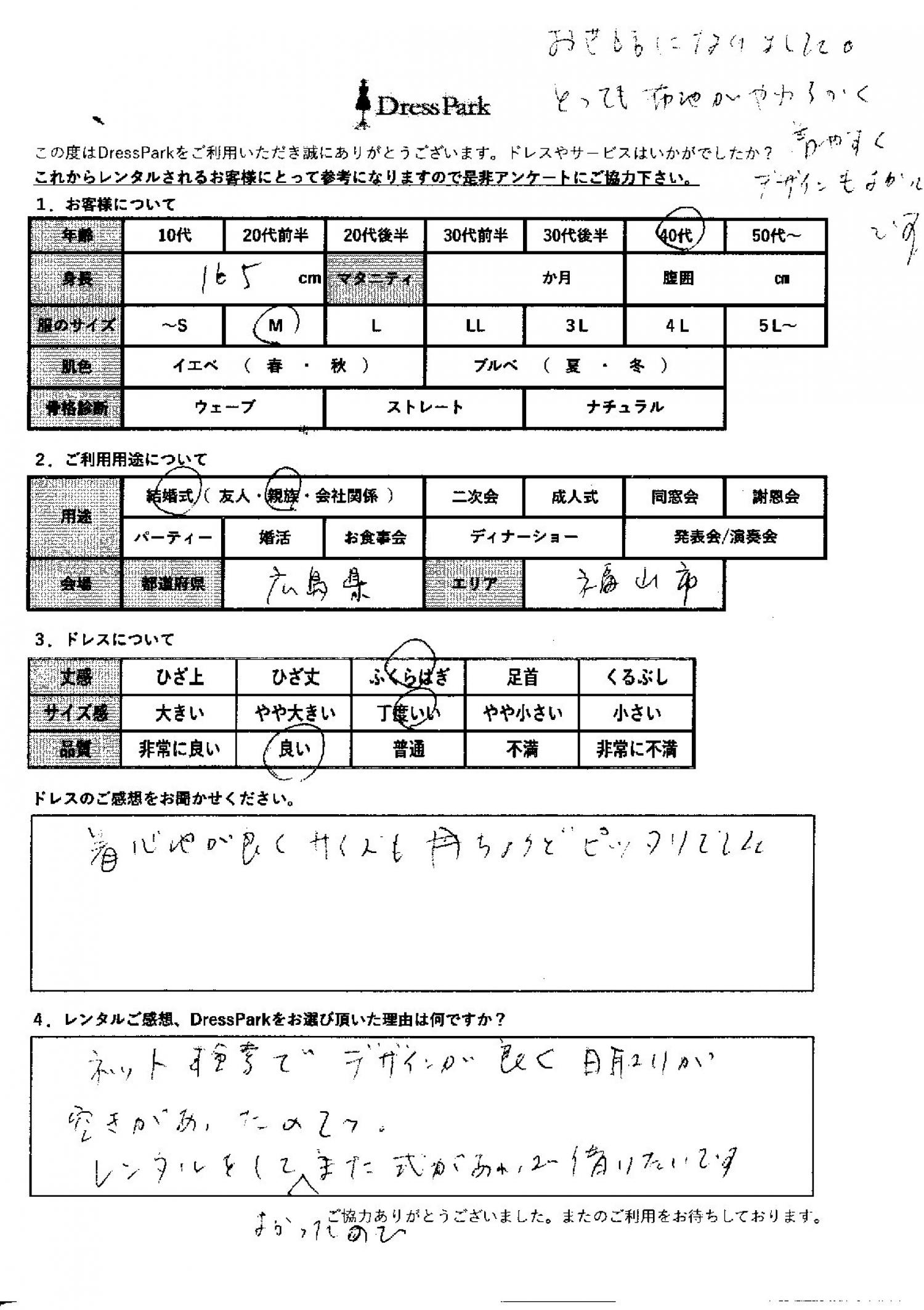 広島県 M.M様165㎝ Mサイズ #40代#M/L#165~169㎝#結婚式(親族)#広島県 ◆レンタルしたドレスはこちら ◆レンタルしたサイズは:M ◆レンタルした日付:2025/11/29 ドレスの着用感 ◆点数: (4点) ◆丈感:ふくらはぎ ◆サイズ感:丁度いい ◆品質:良い ドレスの感想 とっても布地が柔らかく、着やすくデザインも良かったです。着心地が良くサイズもちょうどぴったりでした。 レンタルのご感想、DressParkをお選び頂いた理由 ネット検索でデザインが良く、日取りが空きがあったので。レンタルをして良かったので、また式があれば借りたいです。 CUSTOMER REVIEWS お客様の声 気になるカテゴリー別にご利用の感想をチェック! ◆AGE 年代で見る 10代 20代 30代 40代 50代~ ◆SIZE サイズで見る SS/S M/L 大きいサイズLL~ ◆HIGHT 身長で見る 140~149㎝ 150~154㎝ 155~159㎝ 160~164㎝ 165~169㎝ 170㎝以上 ◆マタニティ ~3か月 4~6か月 7~8か月 9~10か月 ◆肌色 イエベ ブルべ ◆骨格診断 ウェーブ ストレート ナチュラル ◆利用シーン 結婚式(友人) 結婚式(親族) 結婚式(会社関係) 二次会 成人式 謝恩会 パーティー その他 CUSTOMER REVIEWS都道府県別お客様の声 都道府県別にのお客様の声をチェック! 北海道 青森県 岩手県 宮城県 秋田県 山形県 福島県 茨城県 栃木県 群馬県 埼玉県 千葉県 東京都 神奈川県 新潟県 富山県 石川県 福井県 山梨県 長野県 岐阜県 静岡県 愛知県 三重県 滋賀県 京都府 大阪府 兵庫県 奈良県 和歌山県 鳥取県 島根県 岡山県 広島県 山口県 徳島県 香川県 愛媛県 高知県 福岡県 佐賀県 長崎県 熊本県 大分県 宮崎県 鹿児島県 沖縄県 CUSTOMER REVIEWSエリア別お客様の声 都道府県別にのお客様の声をチェック! 札幌 仙台 名古屋 軽井沢 金沢 神戸・芦屋 博多 那覇 梅田・新大阪 難波・心斎橋 鎌倉・湘南 横浜・みなとみらい 舞浜・浦安・幕張 大宮・浦和 青山・表参道 六本木・麻布 渋谷・恵比寿 新宿 池袋 銀座・丸の内 お台場・汐留 鹿児島市 郡山市 福島市 東予 甲府・石和 LINEでお問い合わせ このサイトではJavaScriptを使用しています